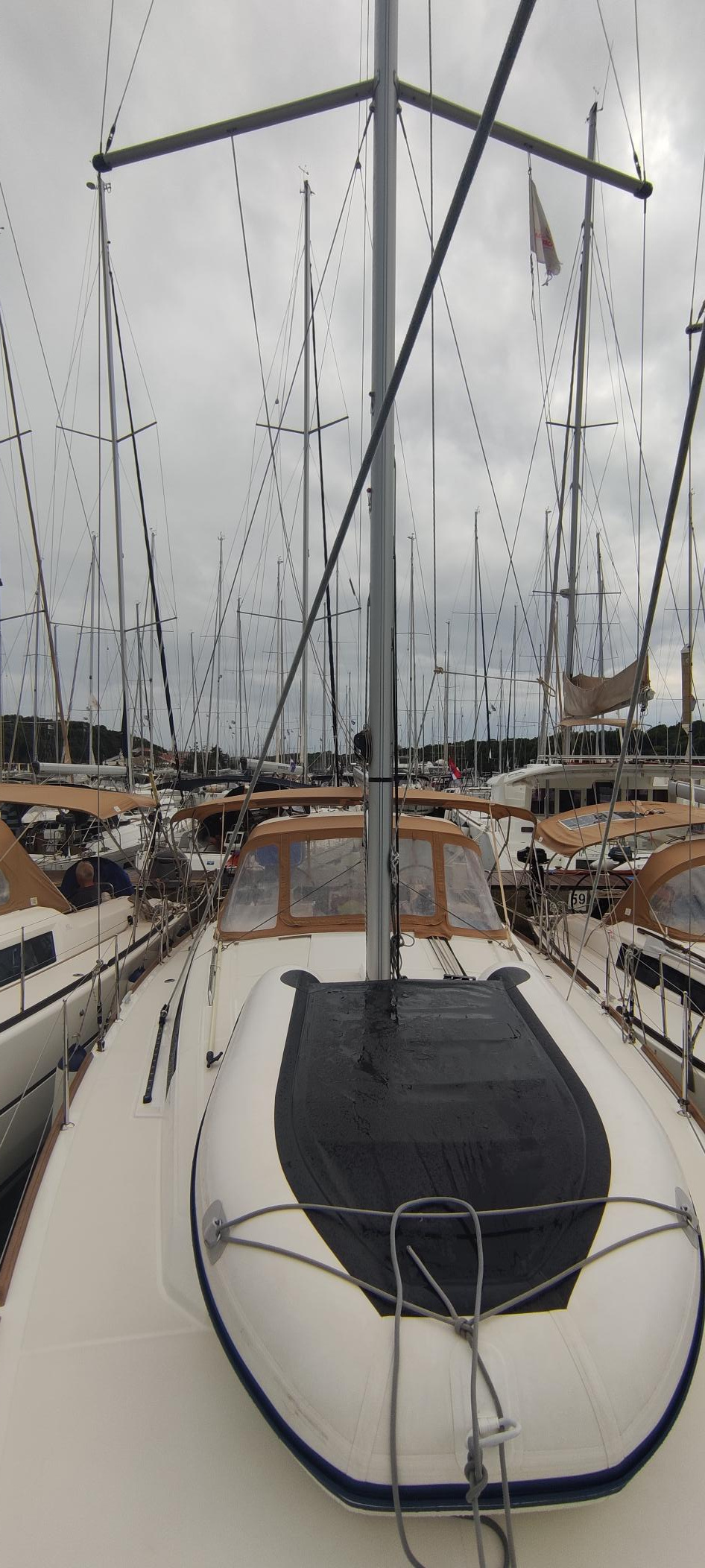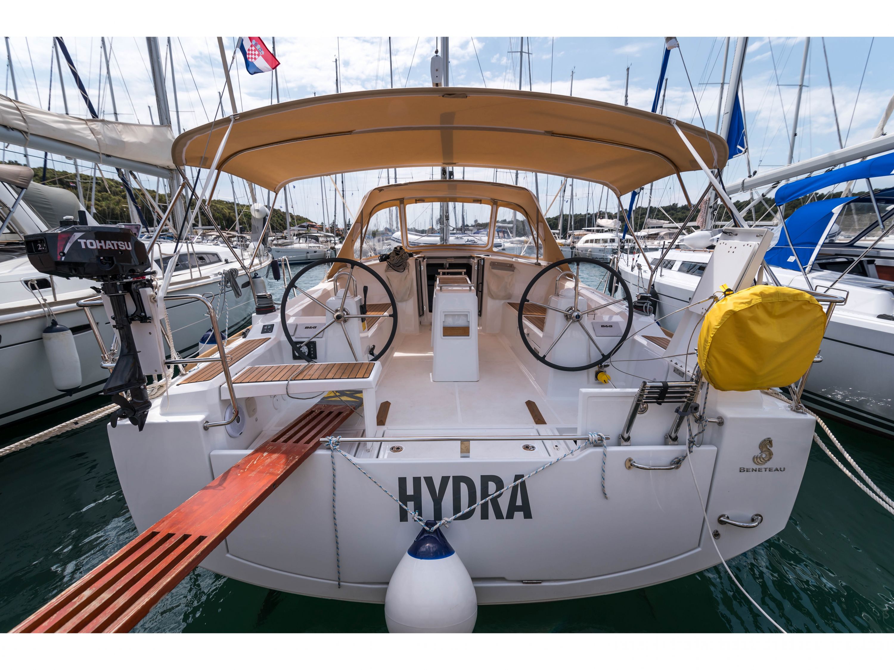 | Outside | Anker mit Kette, Ankerwinsch, Badeplattform, Biminitop, Bootshaken, Cockpitdusche, Cockpitlautsprecher, Deckbürste, Dieselkanister , elektr. Ankerwinsch, Fender, Fernsteuerung für elektr. Ankerwinsch, Gangway, Kunststoff-Eimer (Pütz), Sprayhood, Wasserkanister , Wasserschlauch, Windex |