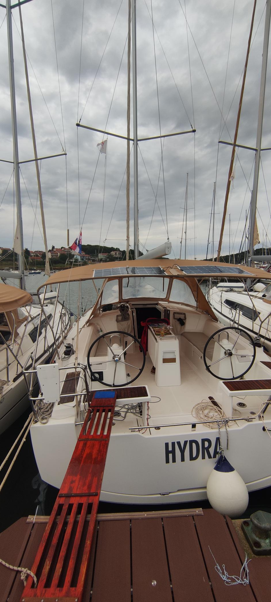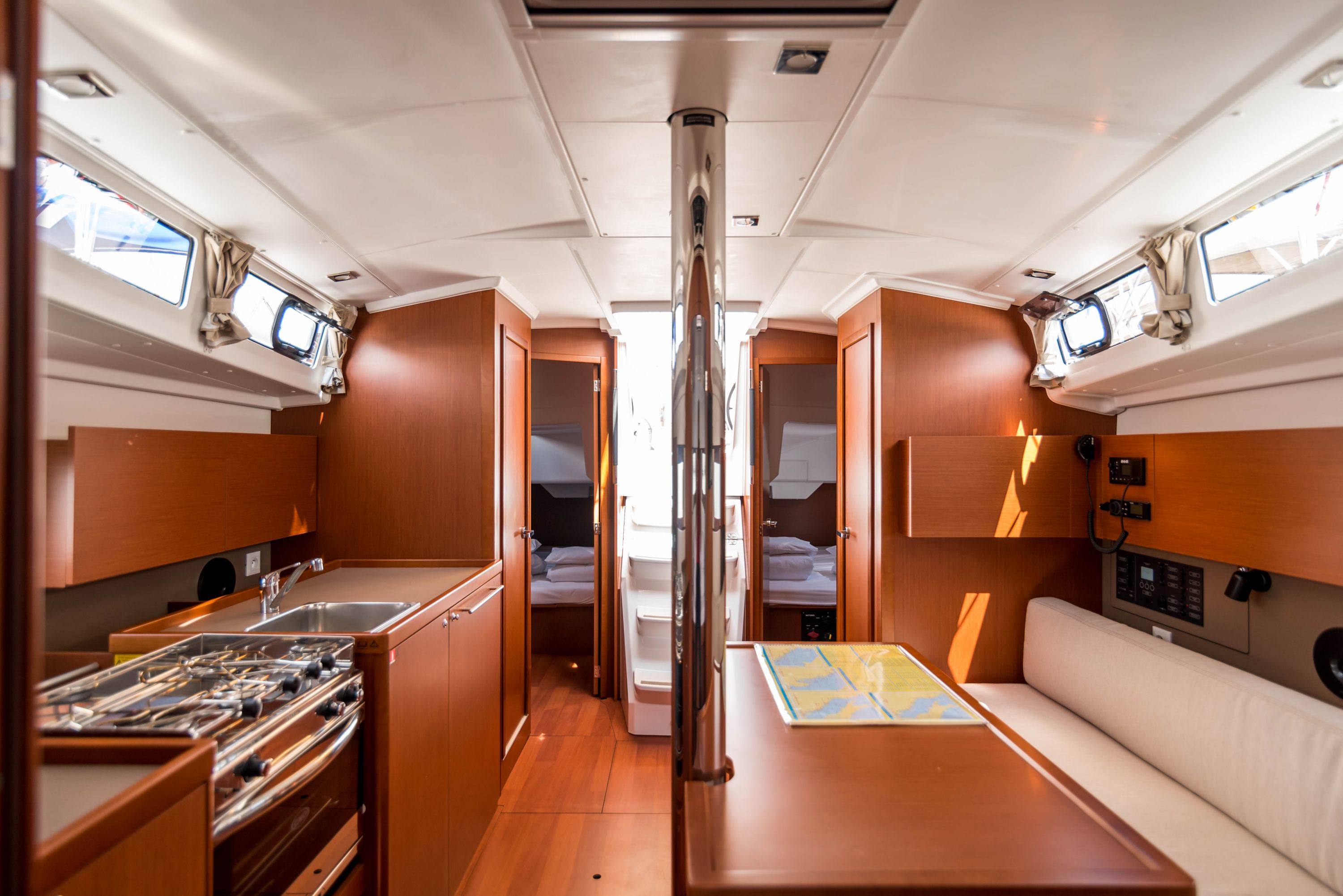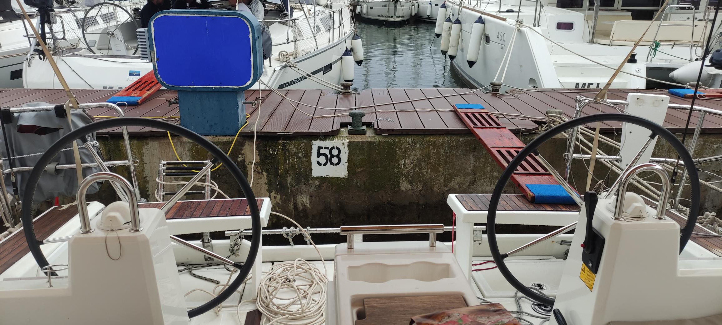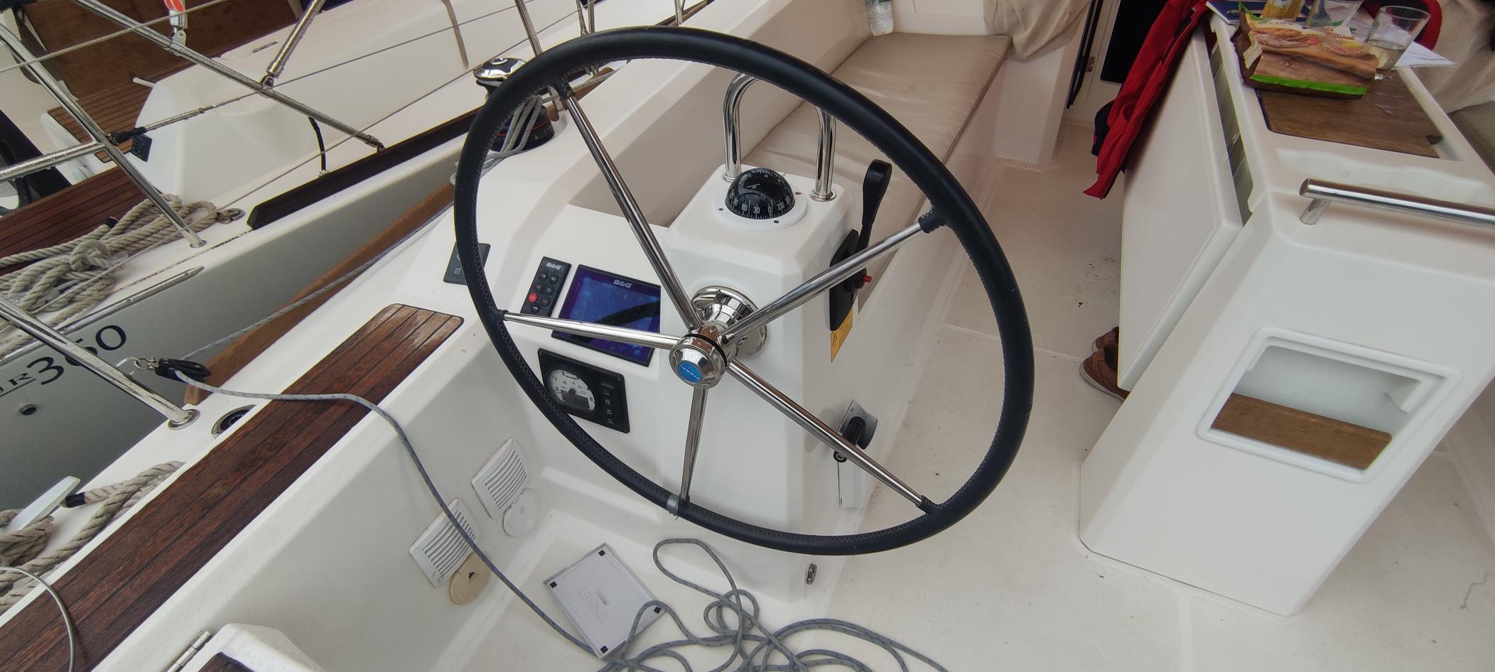 | Navigation | Barometer, Fernglas, GPS mit Kartenplotter im Cockpit, Hafenhandbücher, Handpeilkompass, Navigationsbesteck, Seekarten, Tridata (Log, Echolot, Windm.) |
