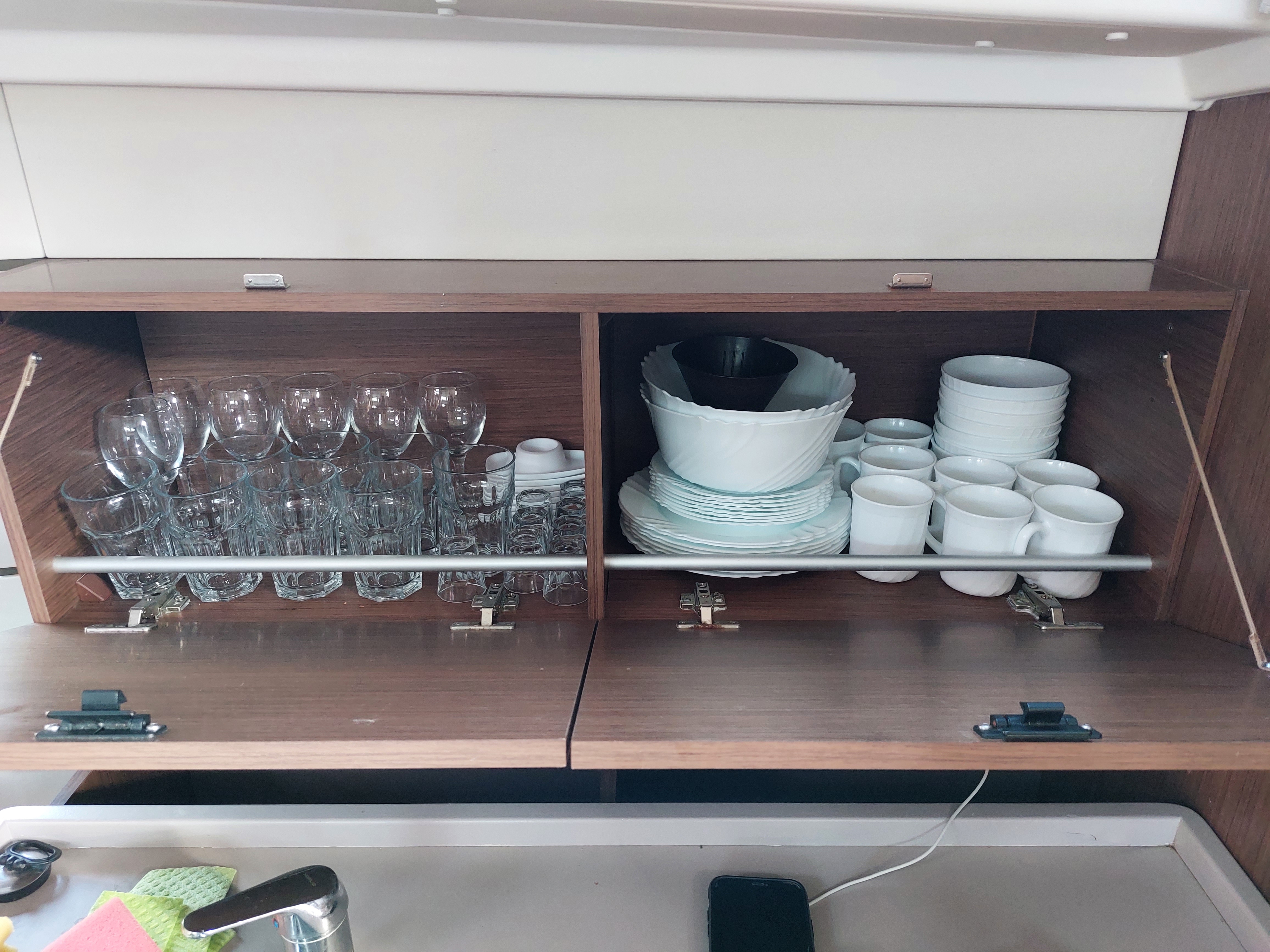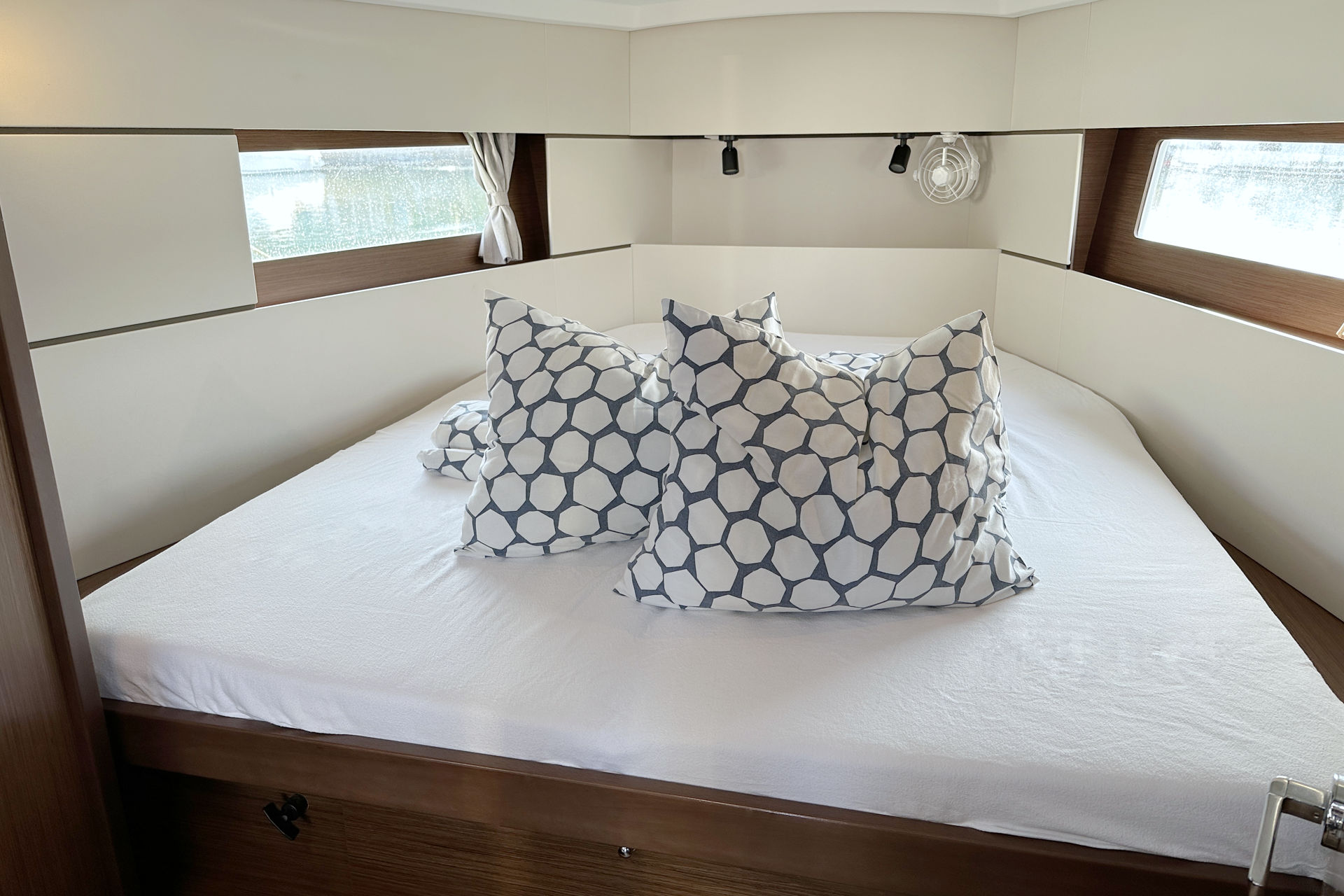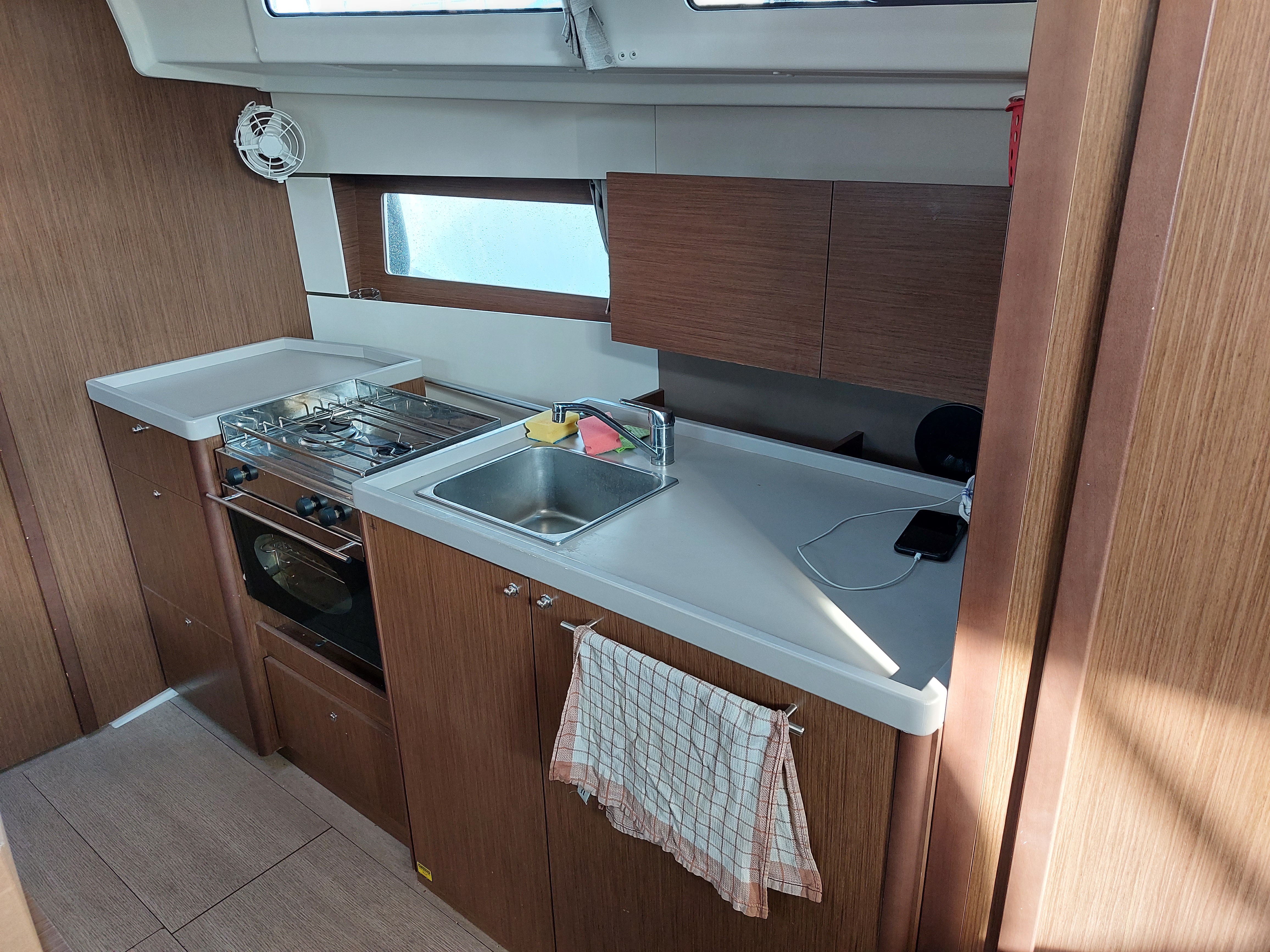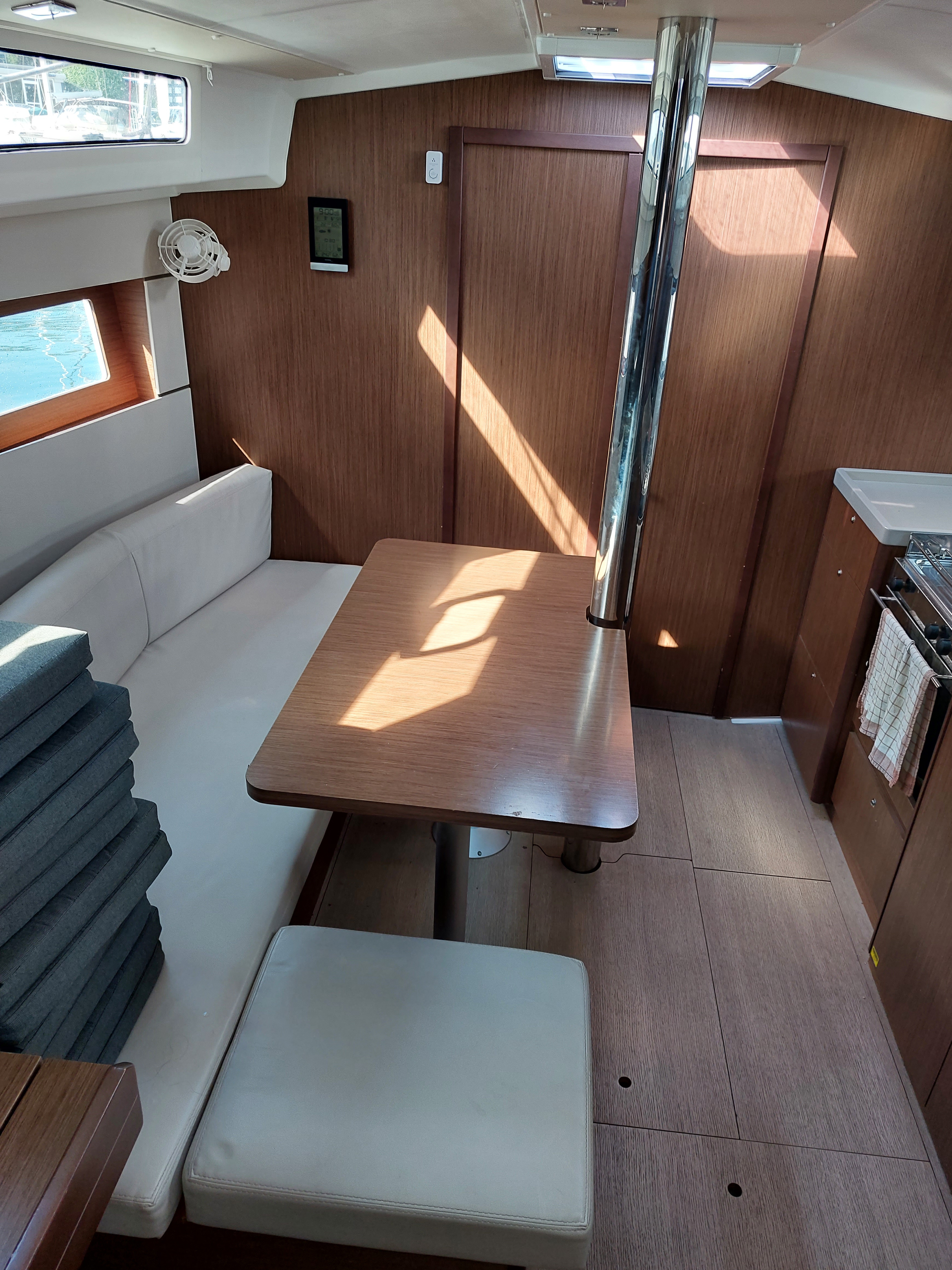 | Inside | 220V Steckdosen, Backofen, Diesel-Heizung, Dusche, Fäkalientank, Inverter 12V/220V, Kühlschrank, Landstromkabel, Lattenrost, Lautsprecher im Salon, Moskitonetze, Safe für Wertsachen, Salontisch absenkbar, TV + DVD, USB Steckdose, Ventilatoren in Salon und Kabinen, Warmwasser, WC (elektr.) |