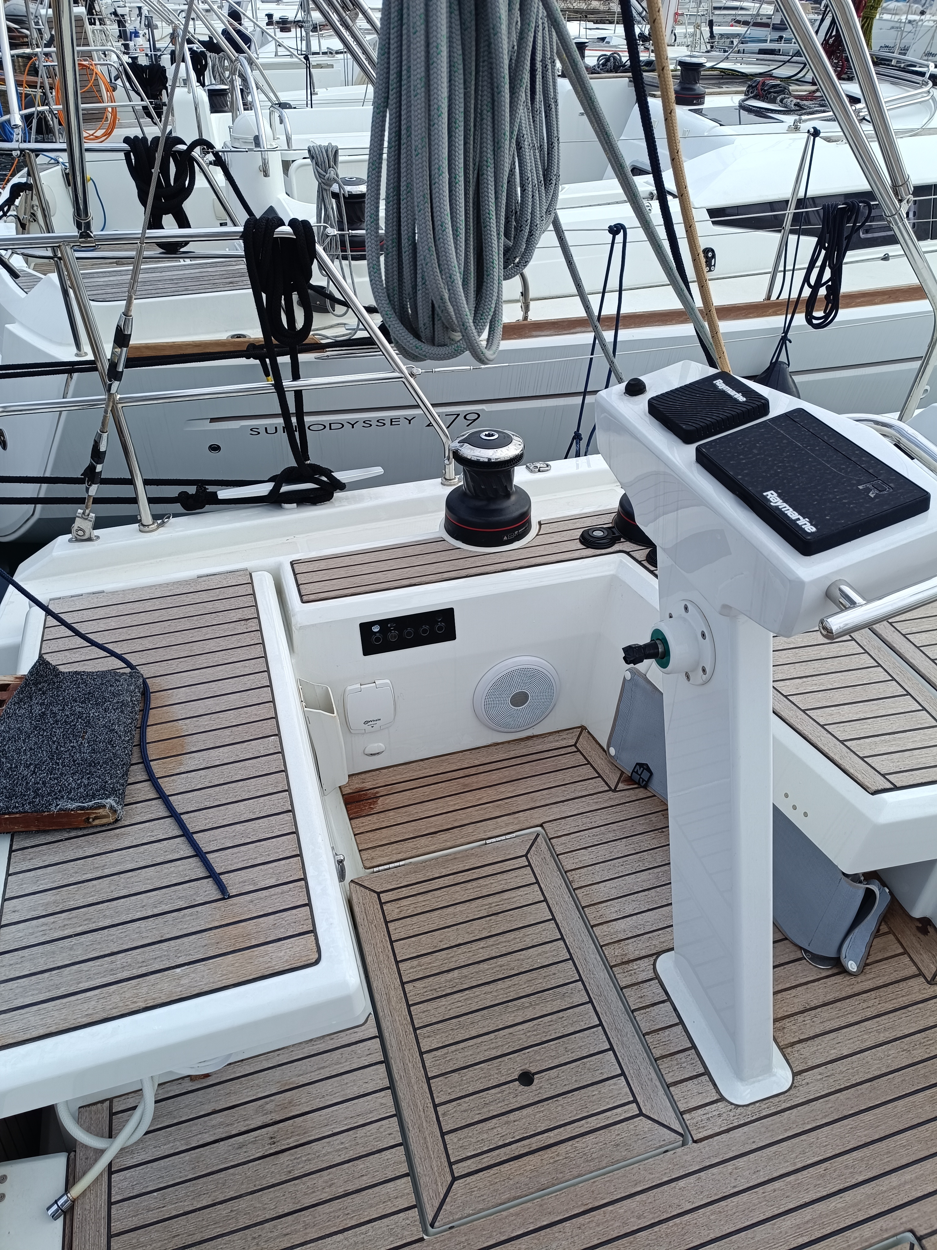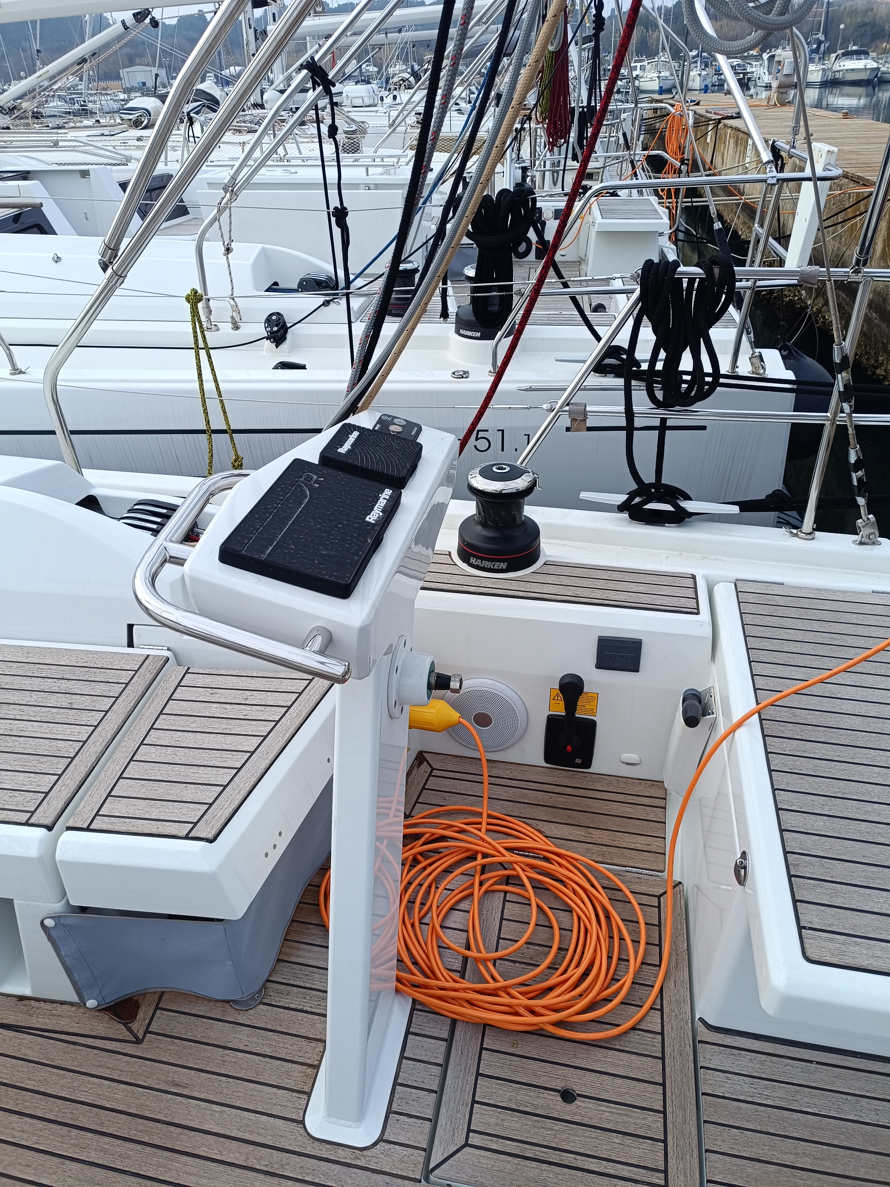 | Outside | 12 V-Anschluss, Anker mit Kette, Badeleiter, Biminitop, Bootshaken, Cockpitdusche, Cockpitlautsprecher, Cockpitpolster, Cockpittisch, Deckbürste, Deckpolster, Dieselkanister , elektr. Ankerwinsch, Fallwinschen, Fender, Festmacherleinen, Gangway, Solaranlage, Sprayhood, Windex |