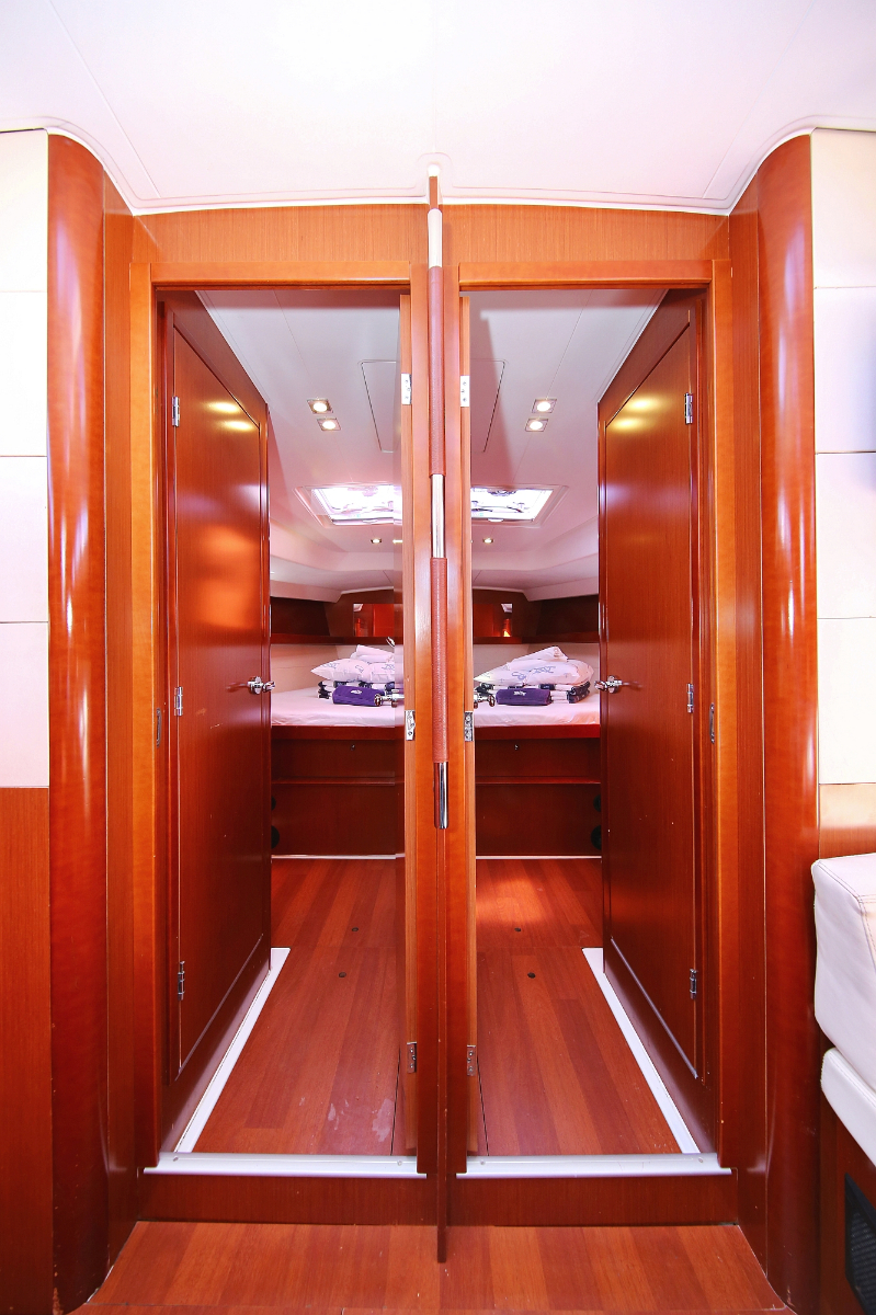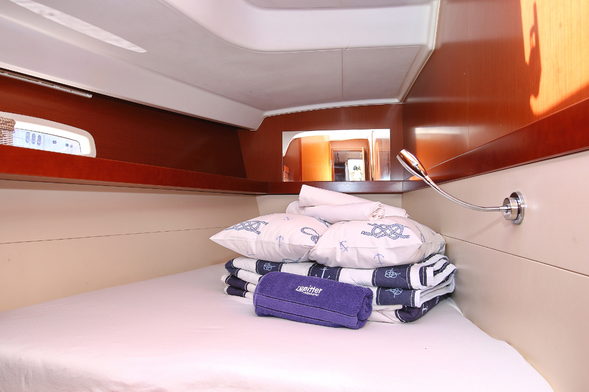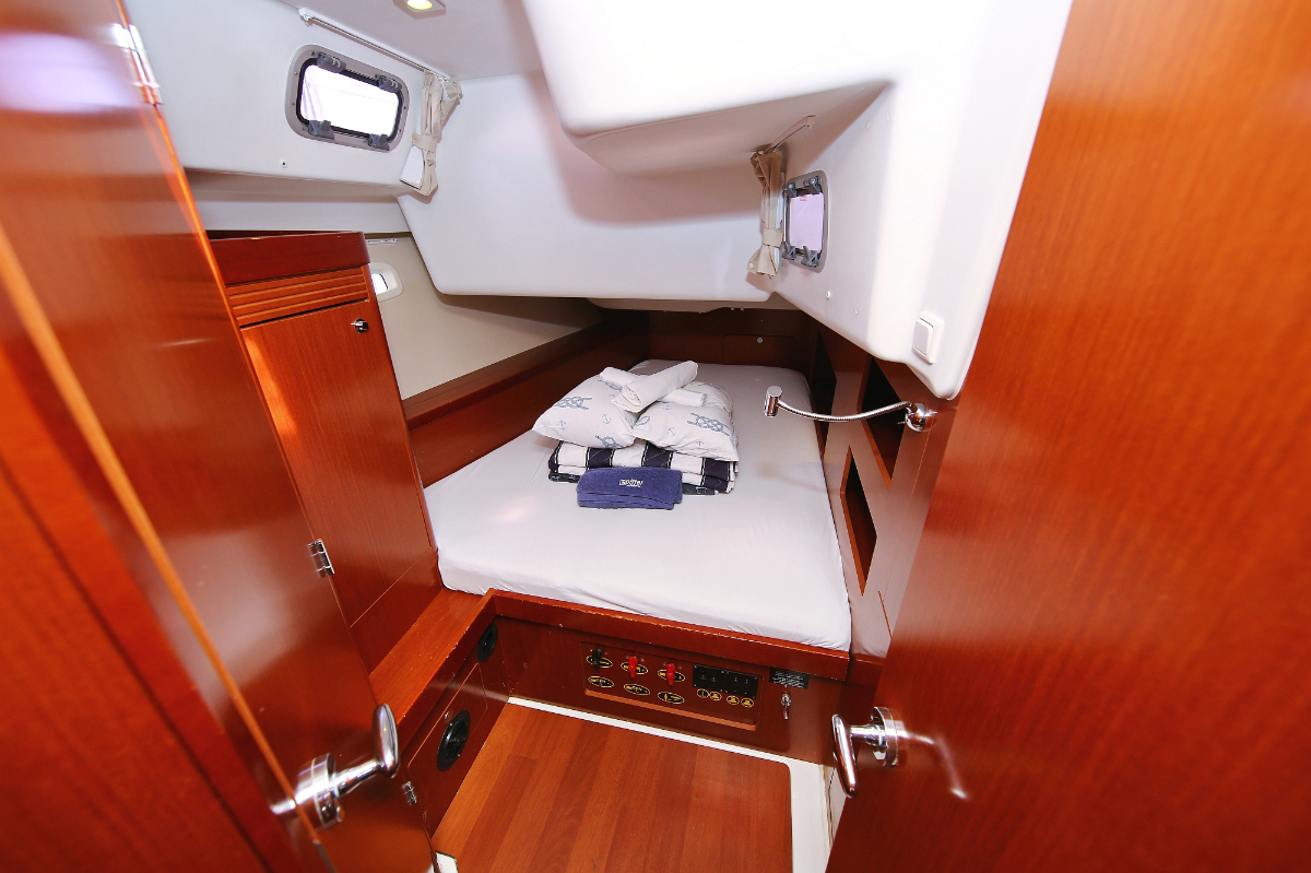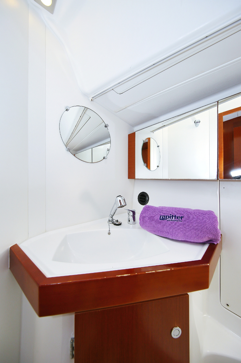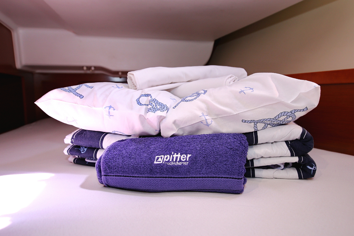 | Safety | AIS Empfänger, Autopilot, Blitzboje, Bootsmannstuhl, Bordapotheke, Bordwerkzeug, Bugstrahlruder, Feuerlöscher, Lifebelts, Nebelhorn, Notpinne, Notsignale, Radarreflektor, Reparaturset für Beiboot, Rettungsinsel, Suchscheinwerfer, Taschenlampe, UKW-Funk, Zweitanker |