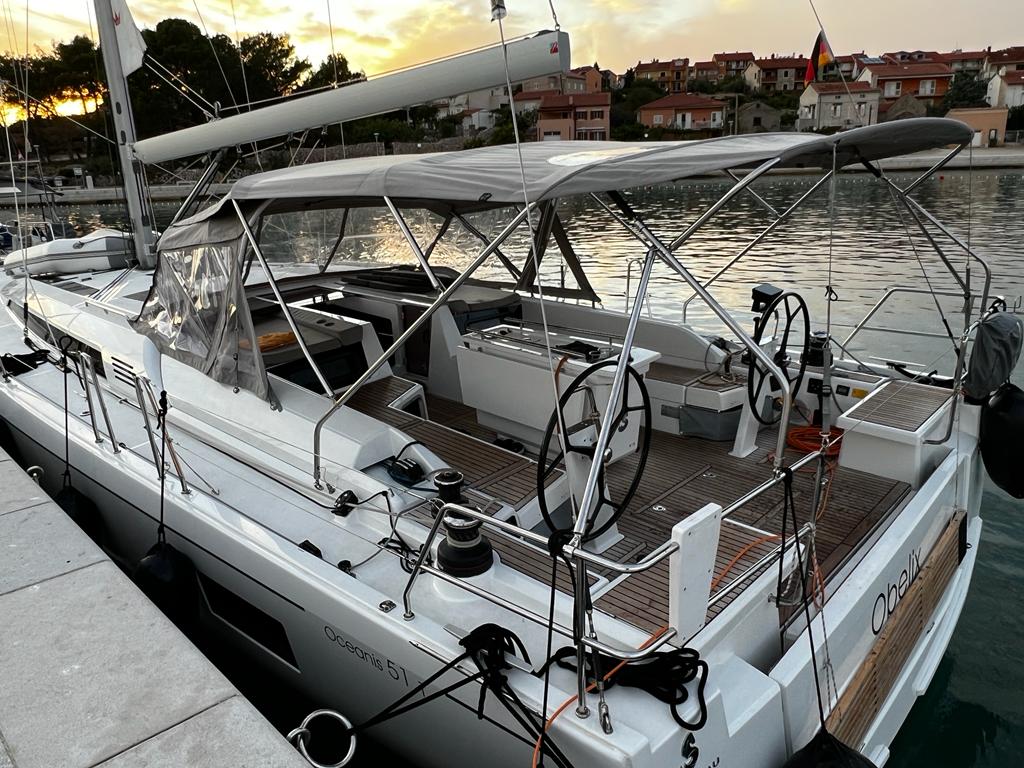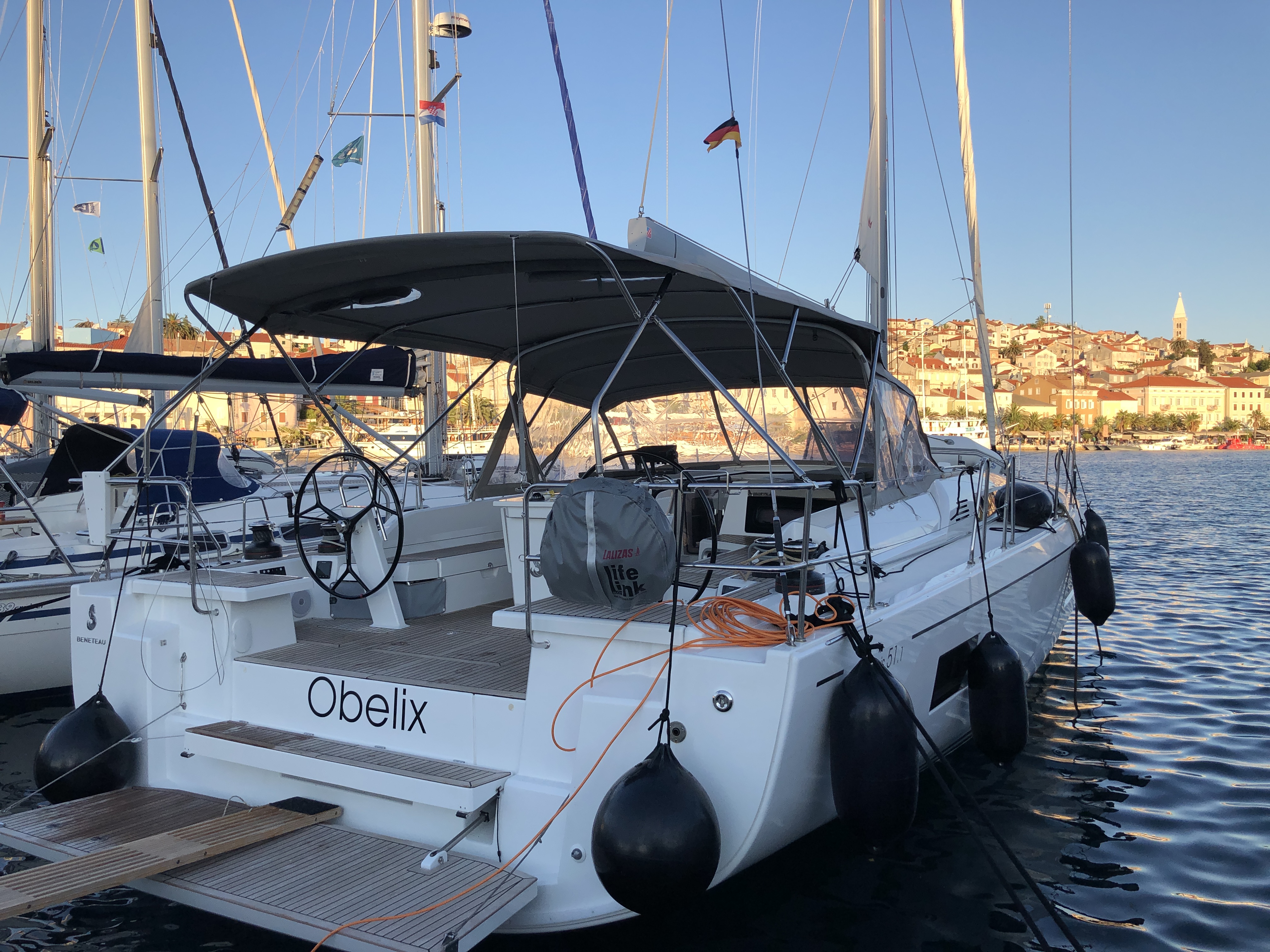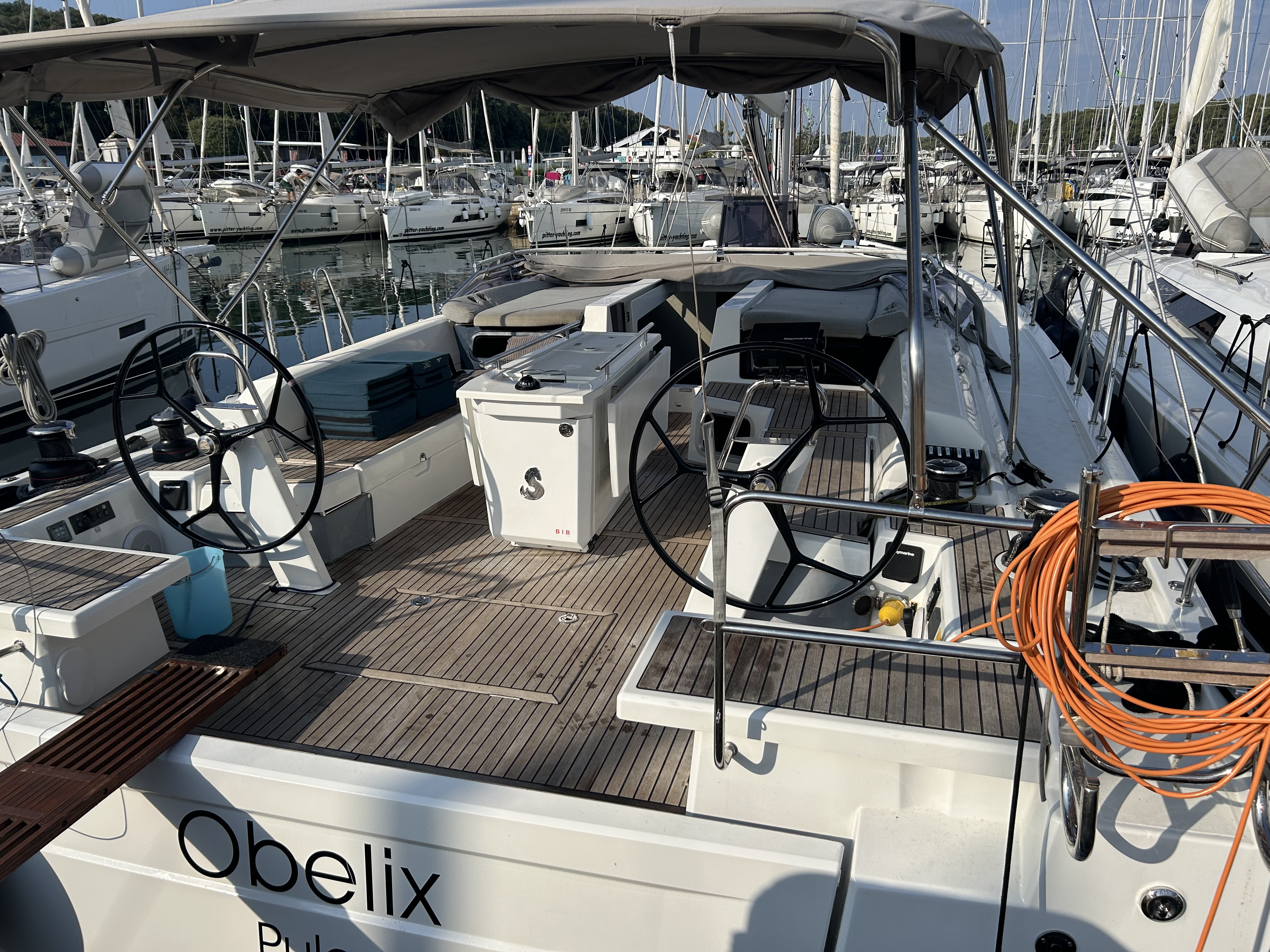 | Outside | 12 V-Anschluss, Badeleiter, Badeplattform elektr., Biminitop, Bootshaken, Cockpitdusche warm/kalt, Cockpitlautsprecher, Cockpitpolster, Cockpittisch mit Eisbox, Deckbürste, Deckpolster, elektr. Ankerwinsch, Fender, Festmacherleinen, Gangway, Lifeline System, Seereling, Solaranlage, Sprayhood, Teak auf Badeplattform, Teak im Cockpit, Windex, Winschen |