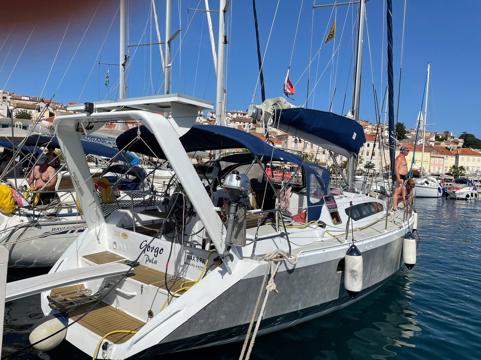 | Outside | 220 V-Landanschluss, Badeplattform, Biminitop, Cockpitdusche, Cockpitlautsprecher, Cockpittisch, Delta-Anker, elektr. Ankerwinsch, Gangway, Solaranlage, Sprayhood |