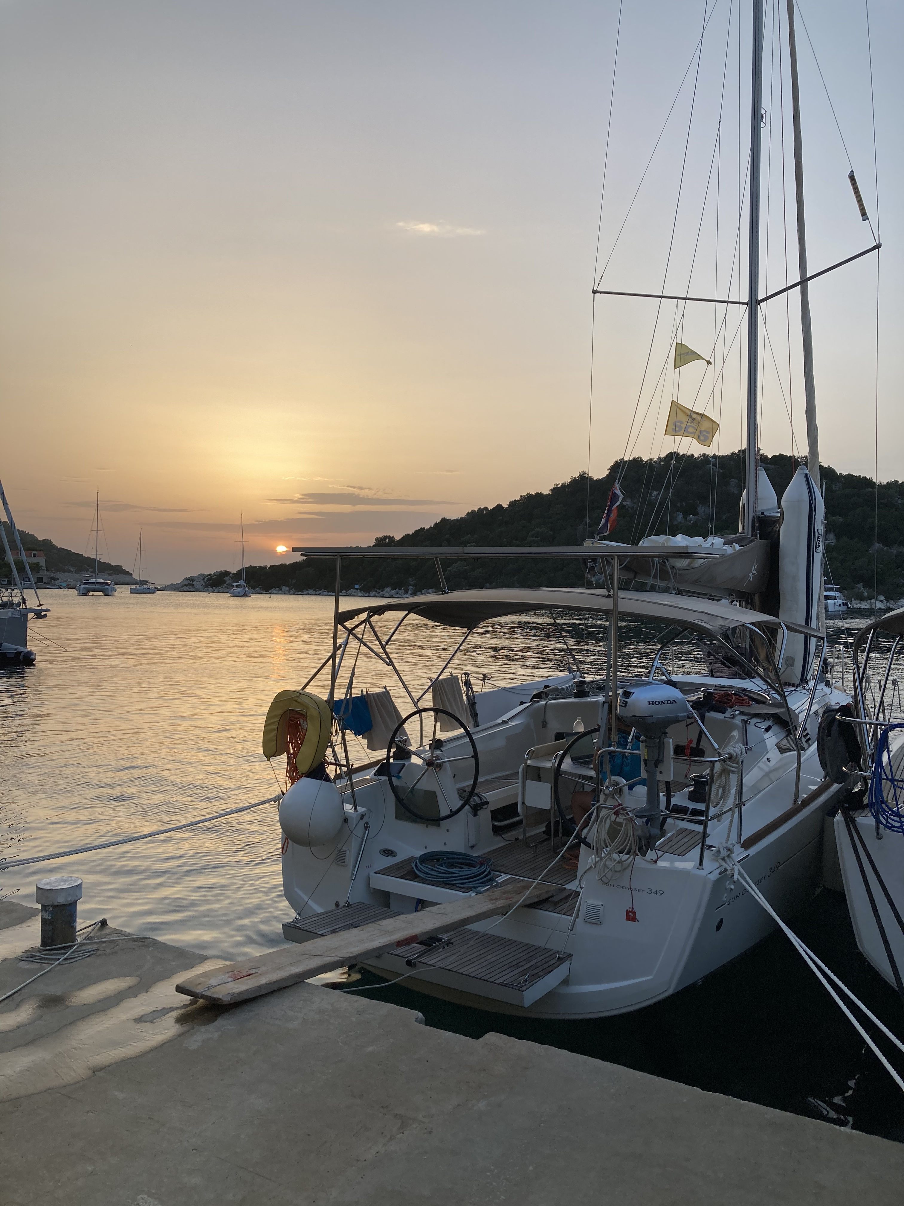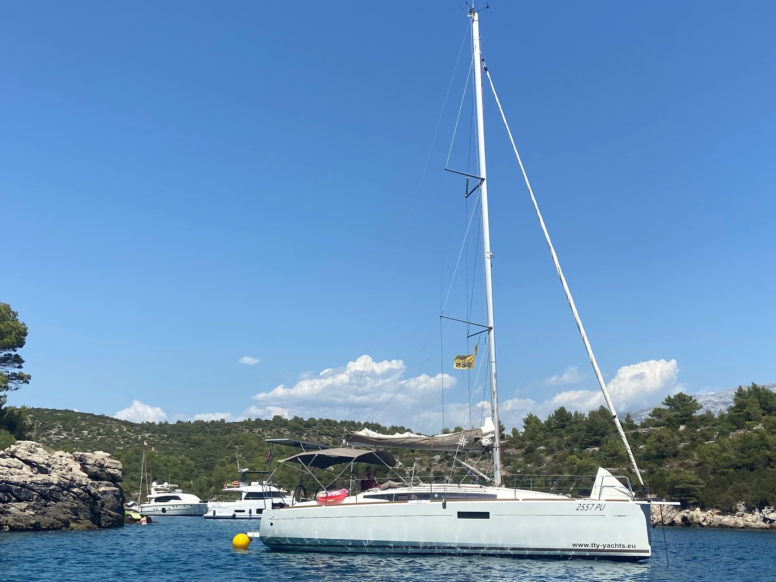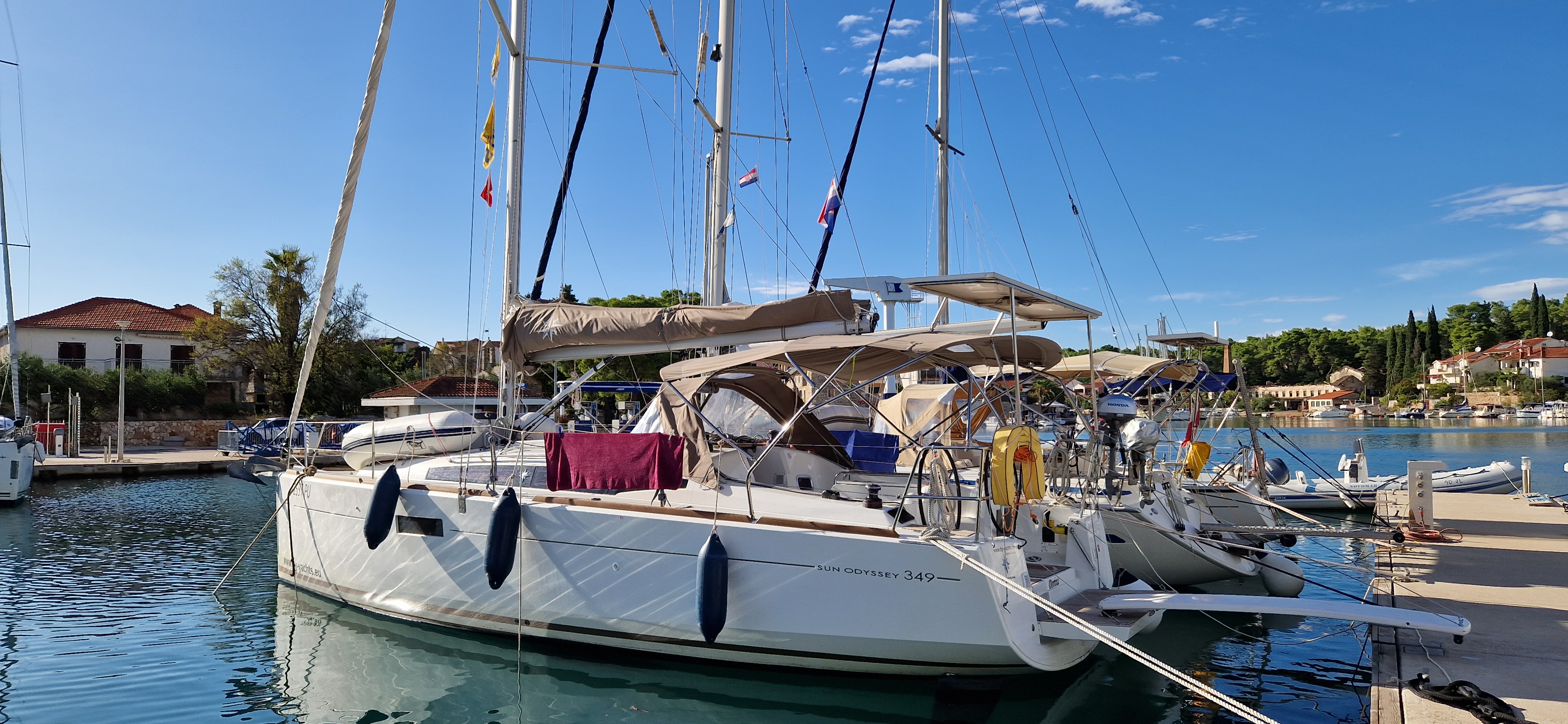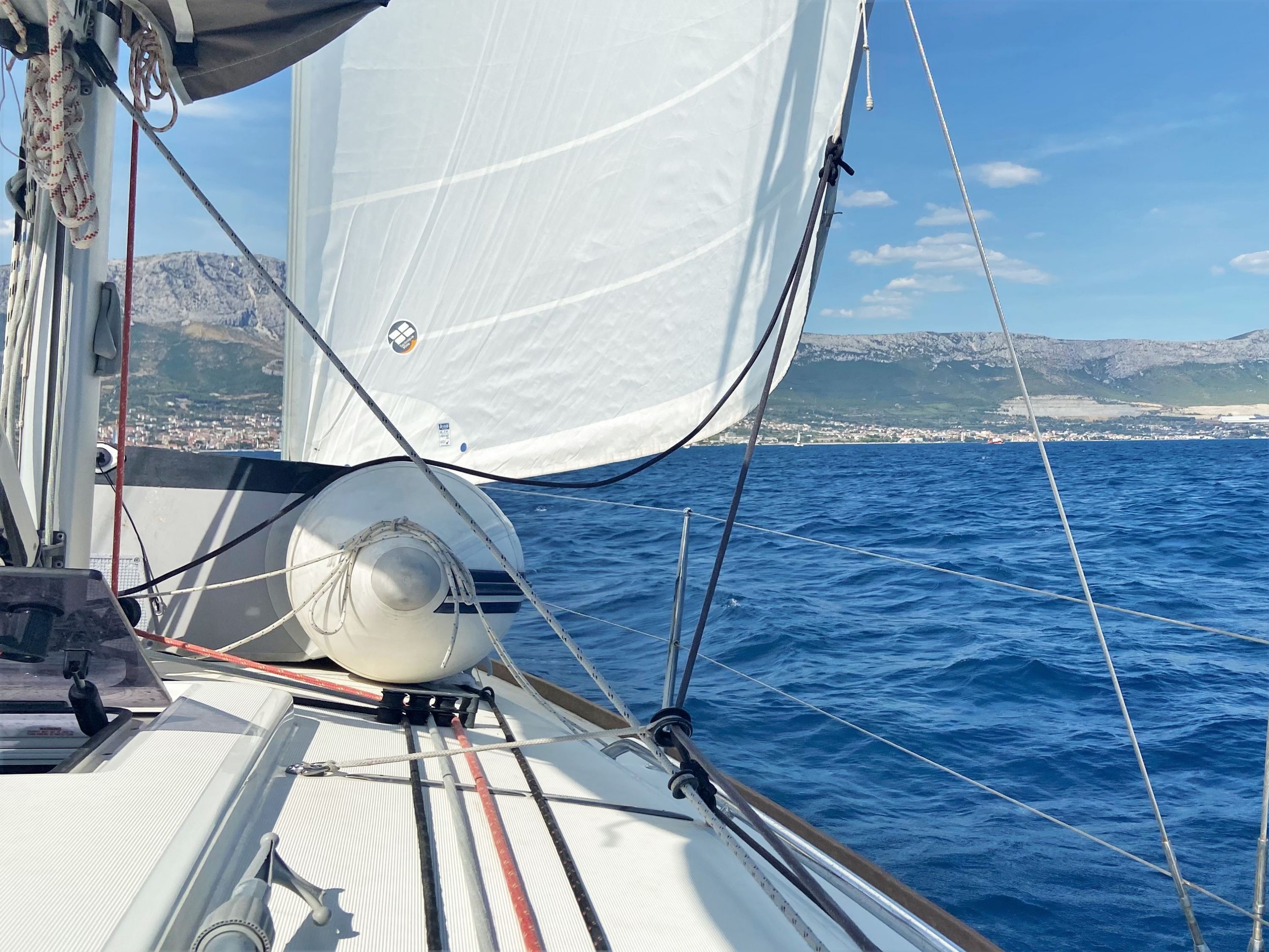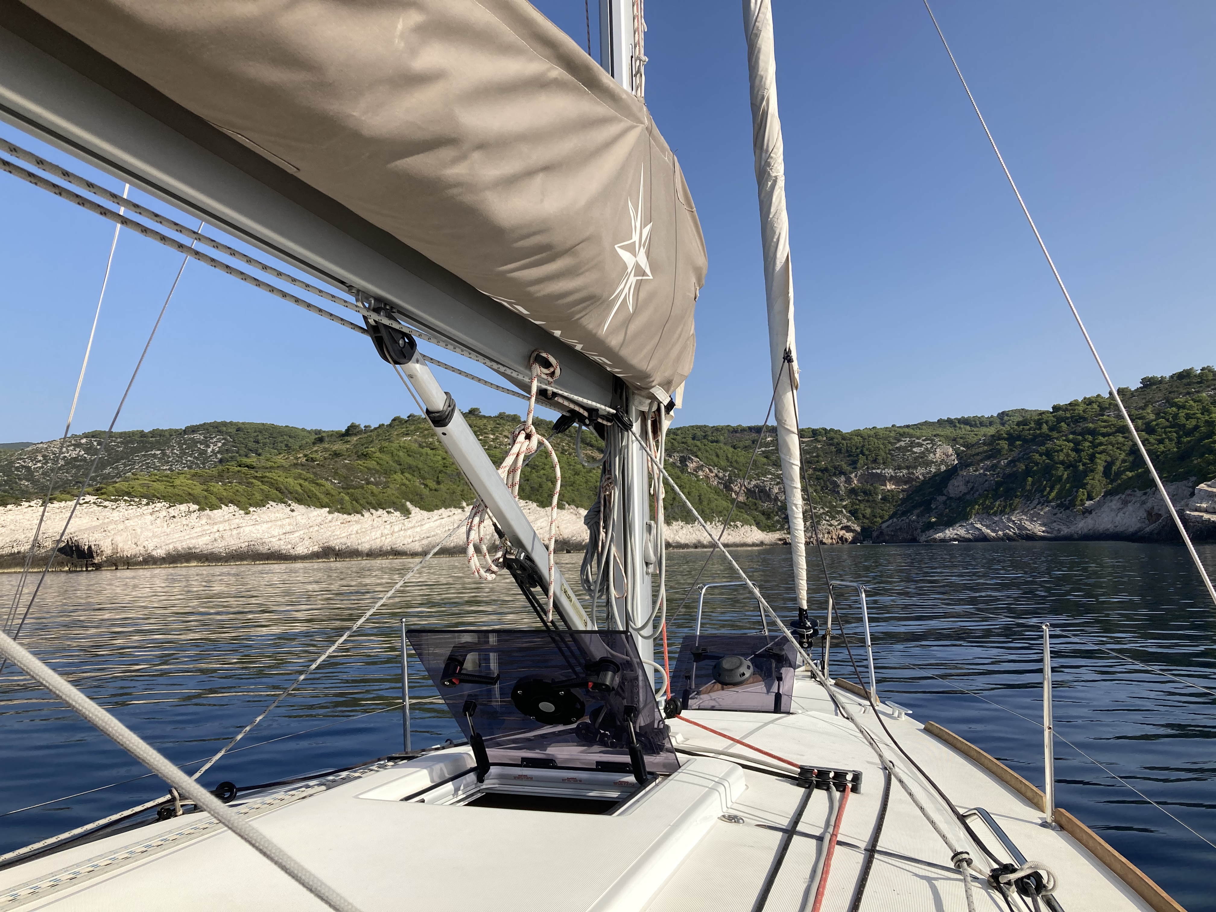 Die Sun Odyssey 349 hat an sich gute Segeleigenschaften. Die Rollfock war jedoch recht klein und die Holepunktverstellung miserabel, am Wind schlecht zu segeln.