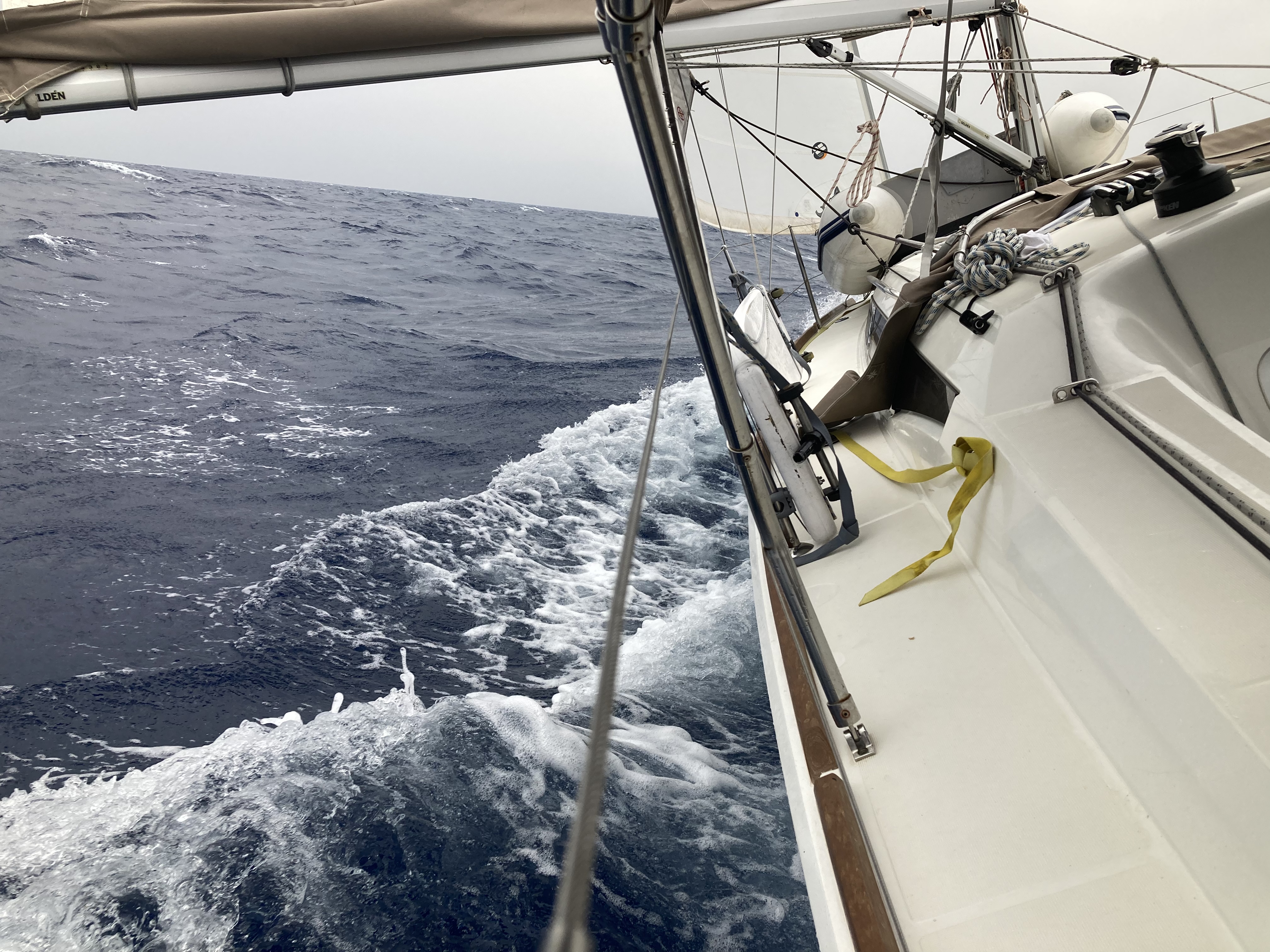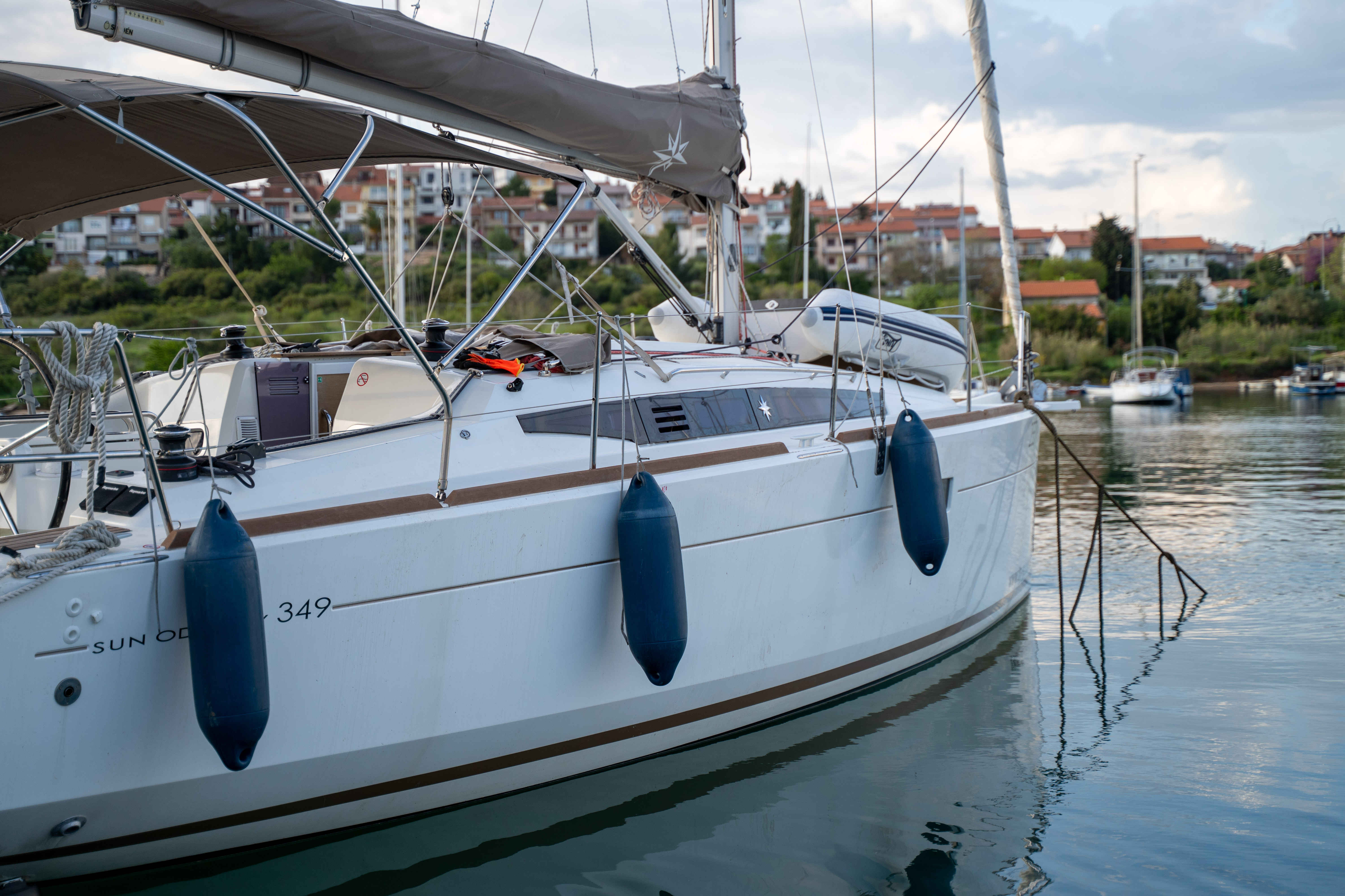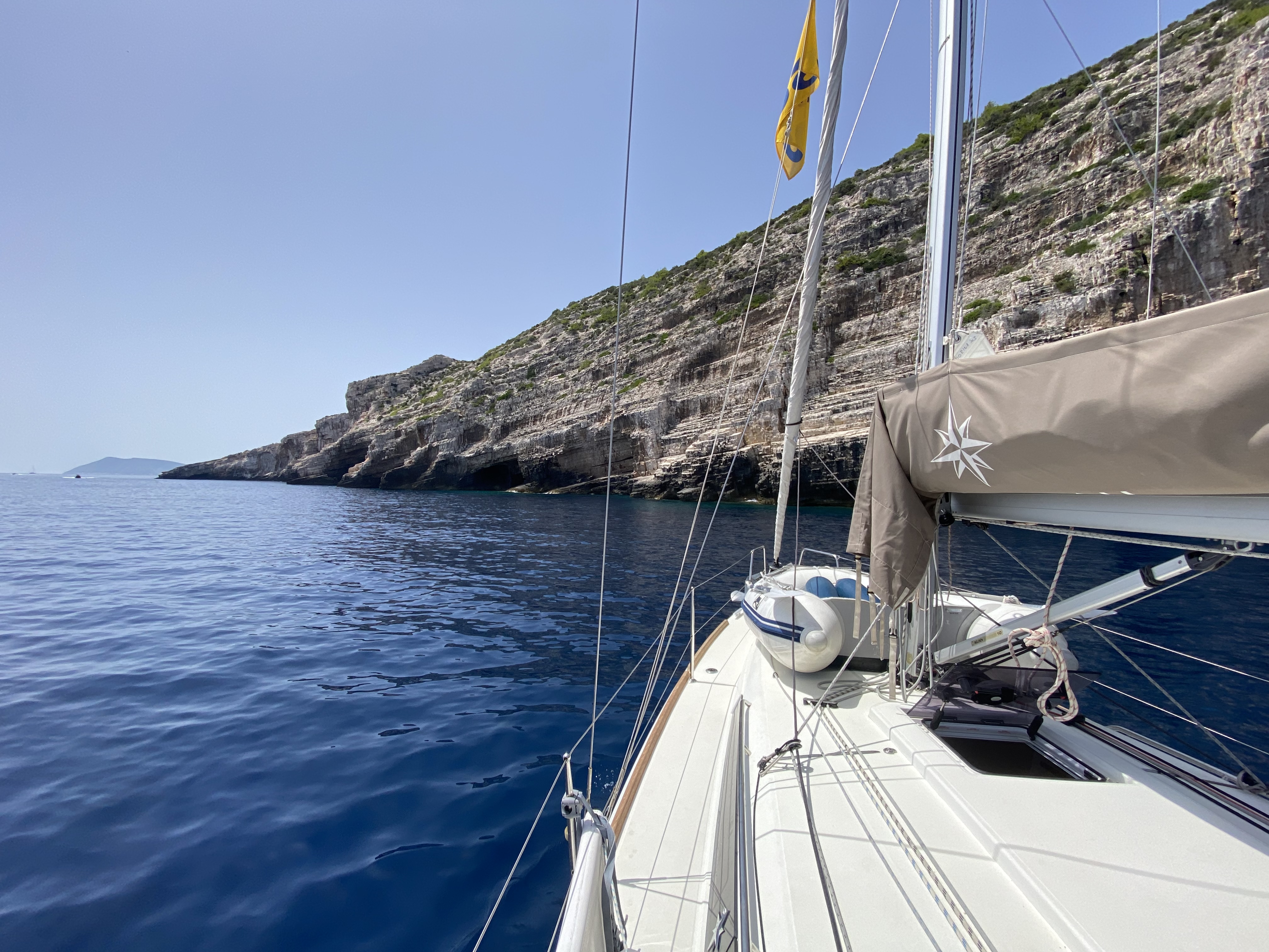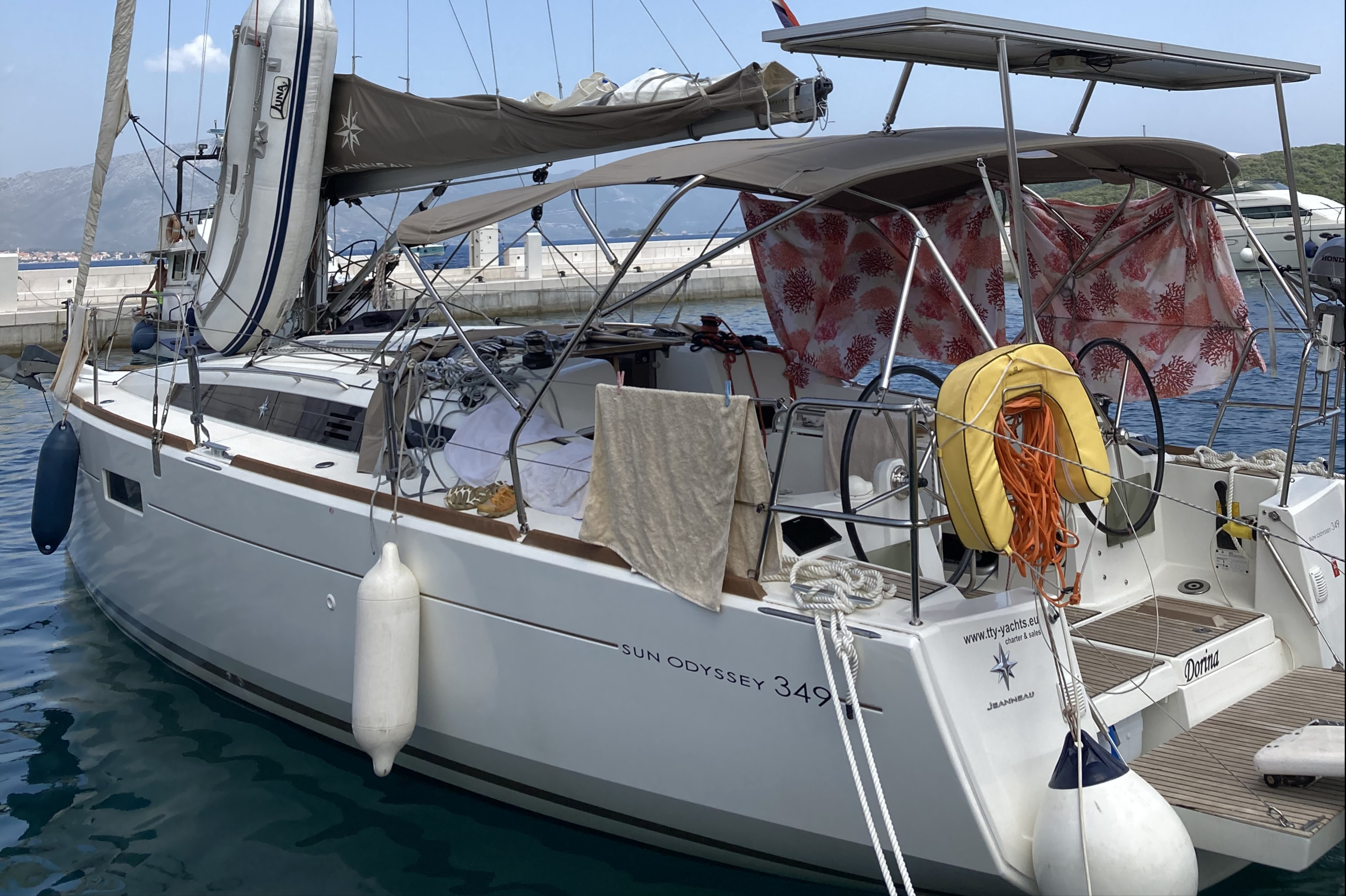 Die Sun Odyssey 349 hat an sich gute Segeleigenschaften. Die Rollfock war jedoch recht klein und die Holepunktverstellung miserabel, am Wind schlecht zu segeln.
