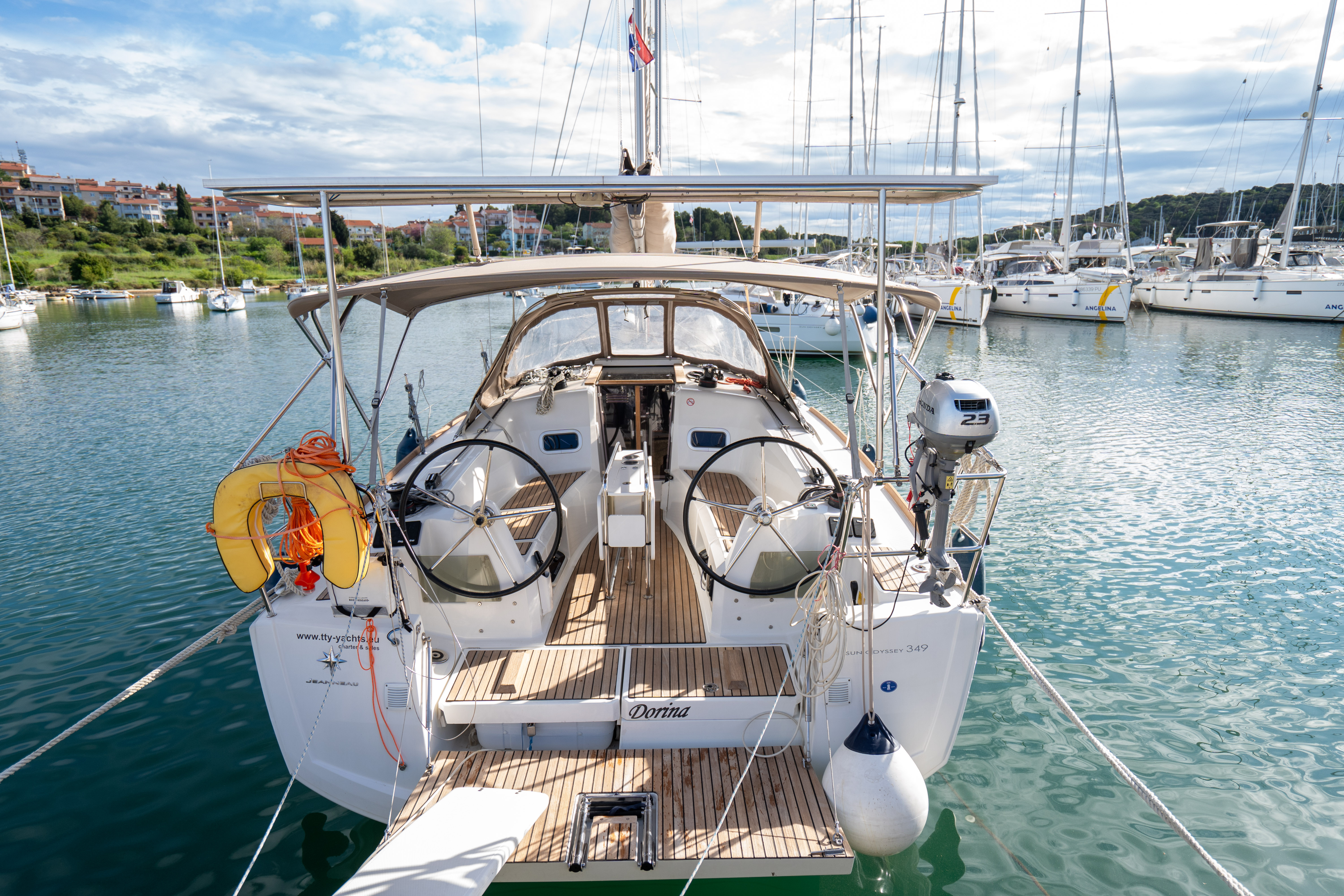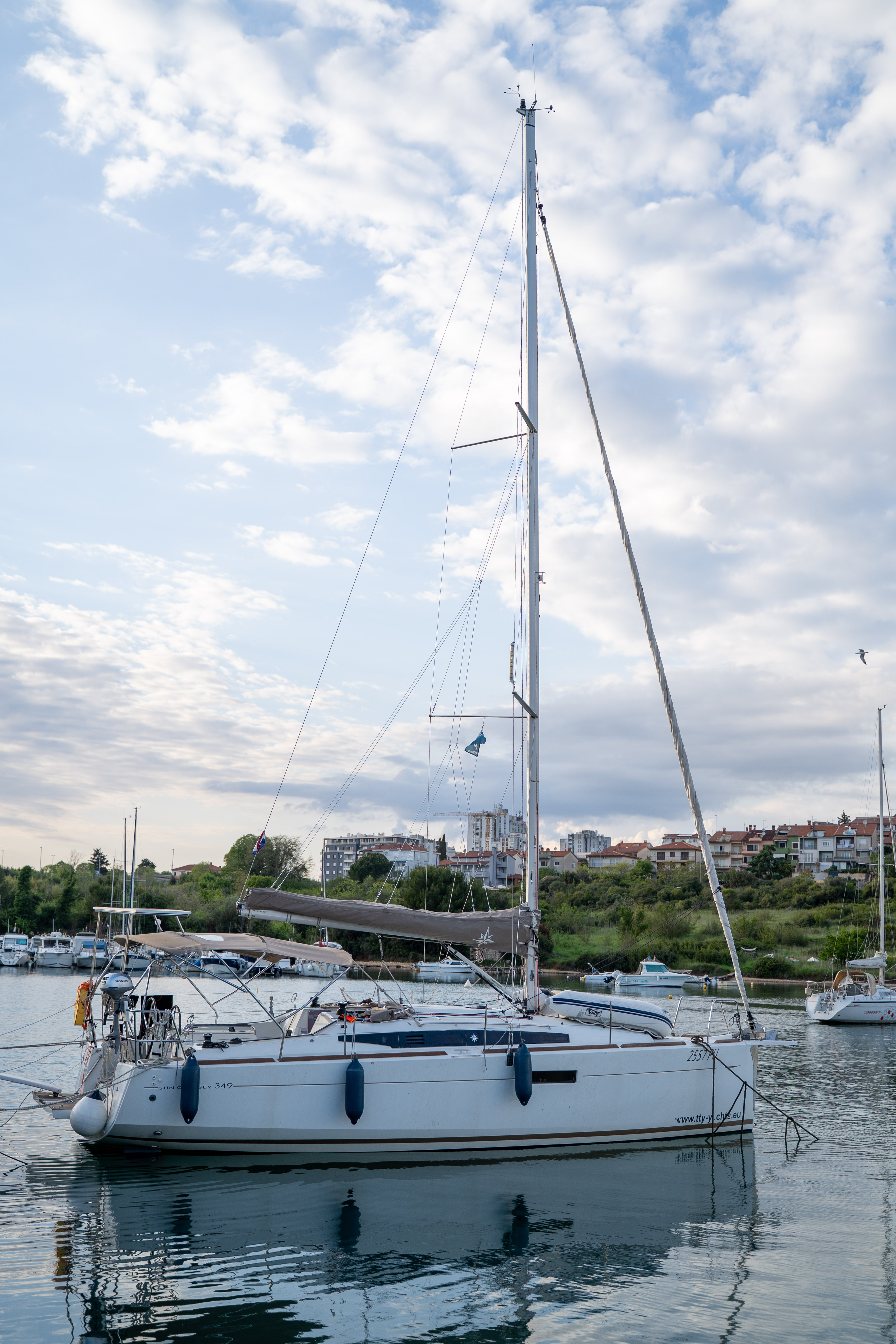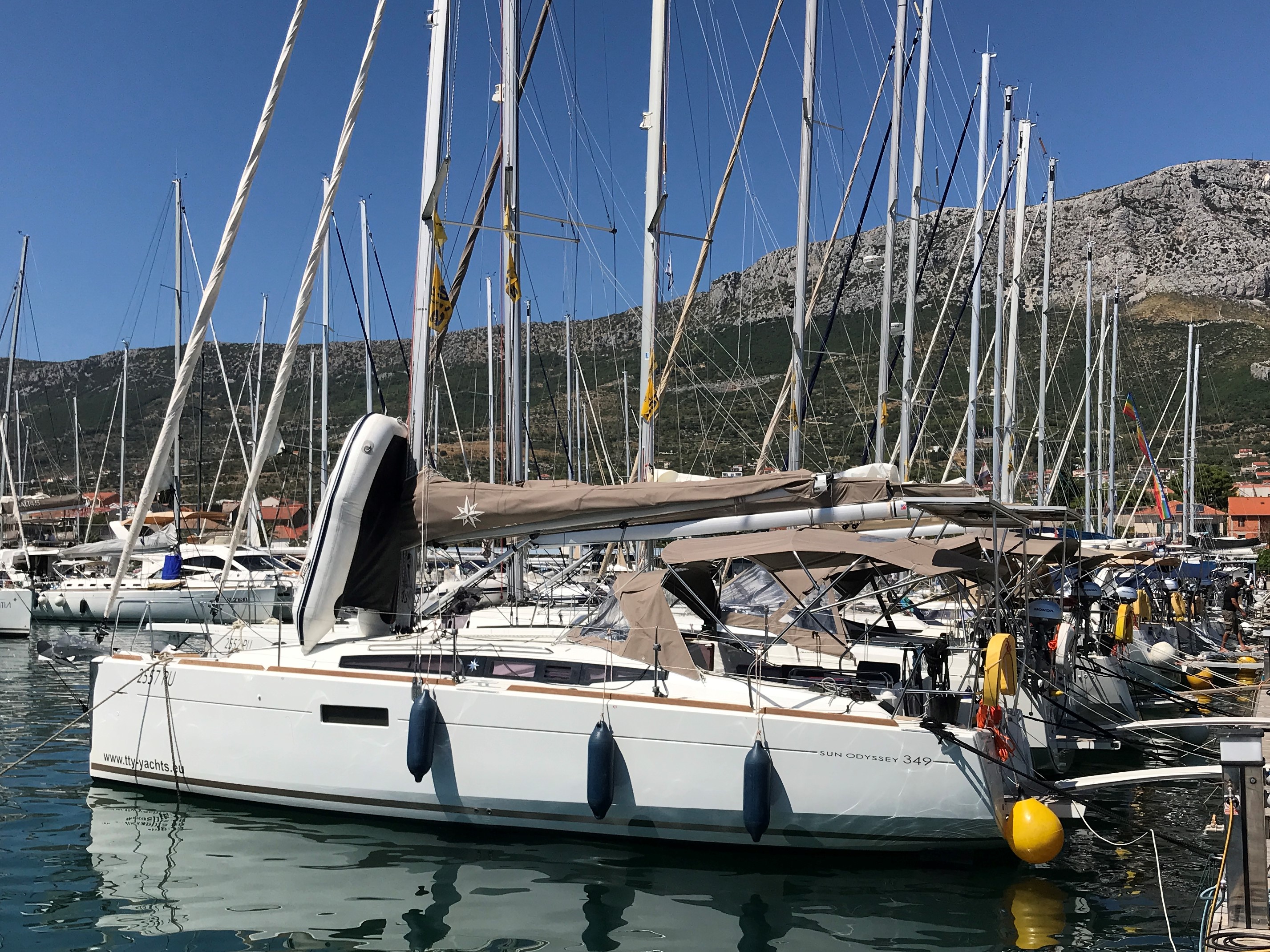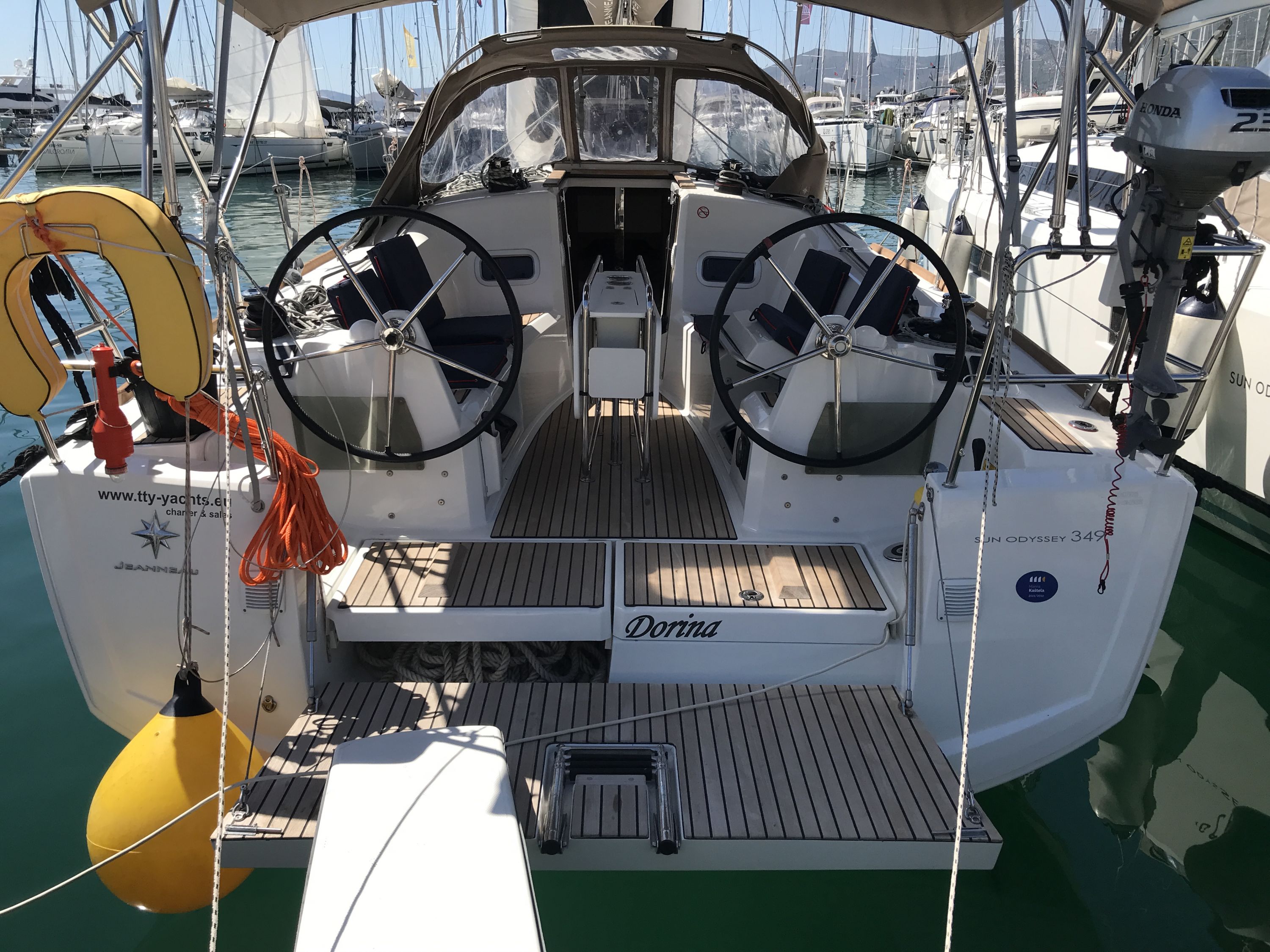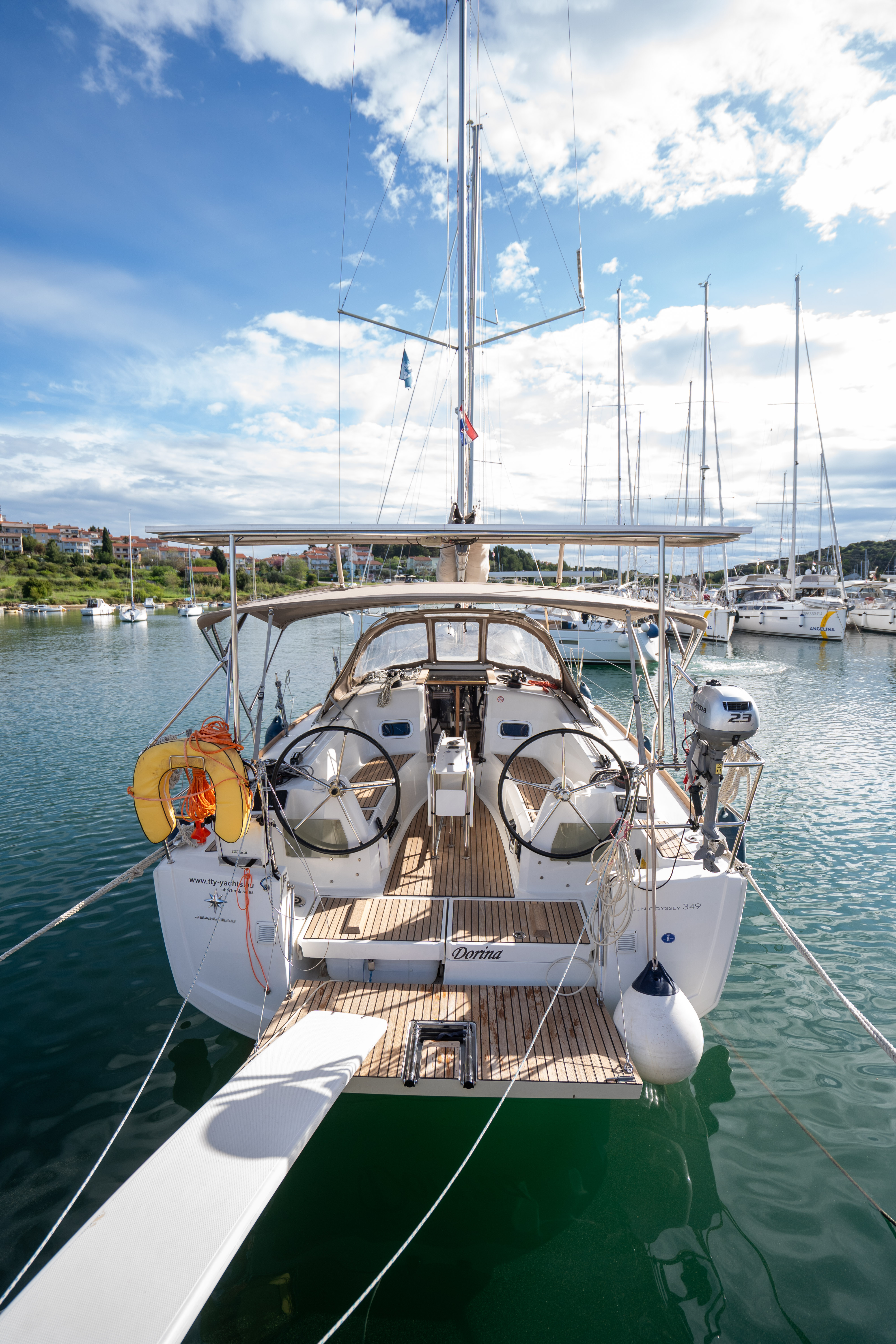 Die Sun Odyssey 349 hat an sich gute Segeleigenschaften. Die Rollfock war jedoch recht klein und die Holepunktverstellung miserabel, am Wind schlecht zu segeln.