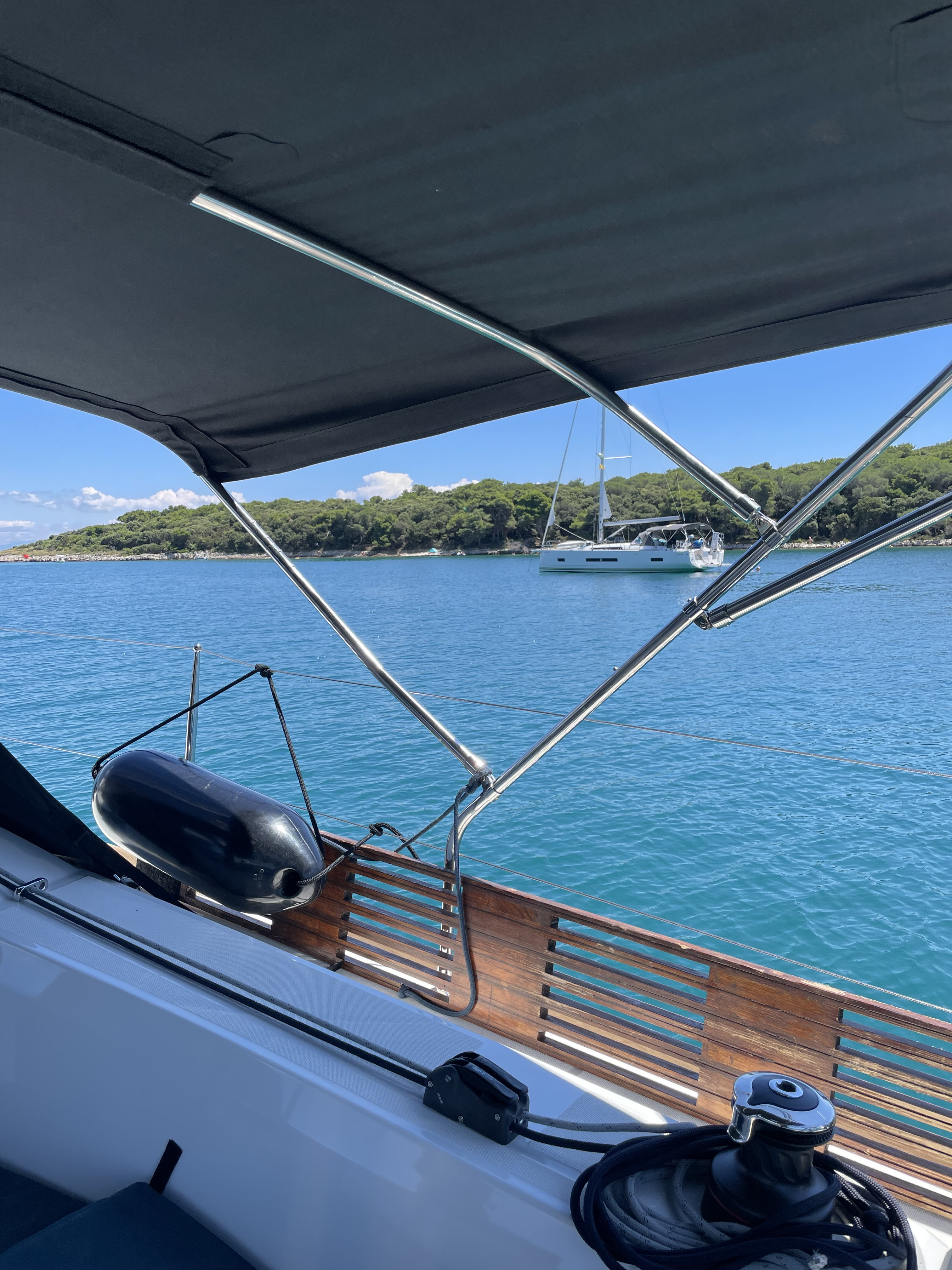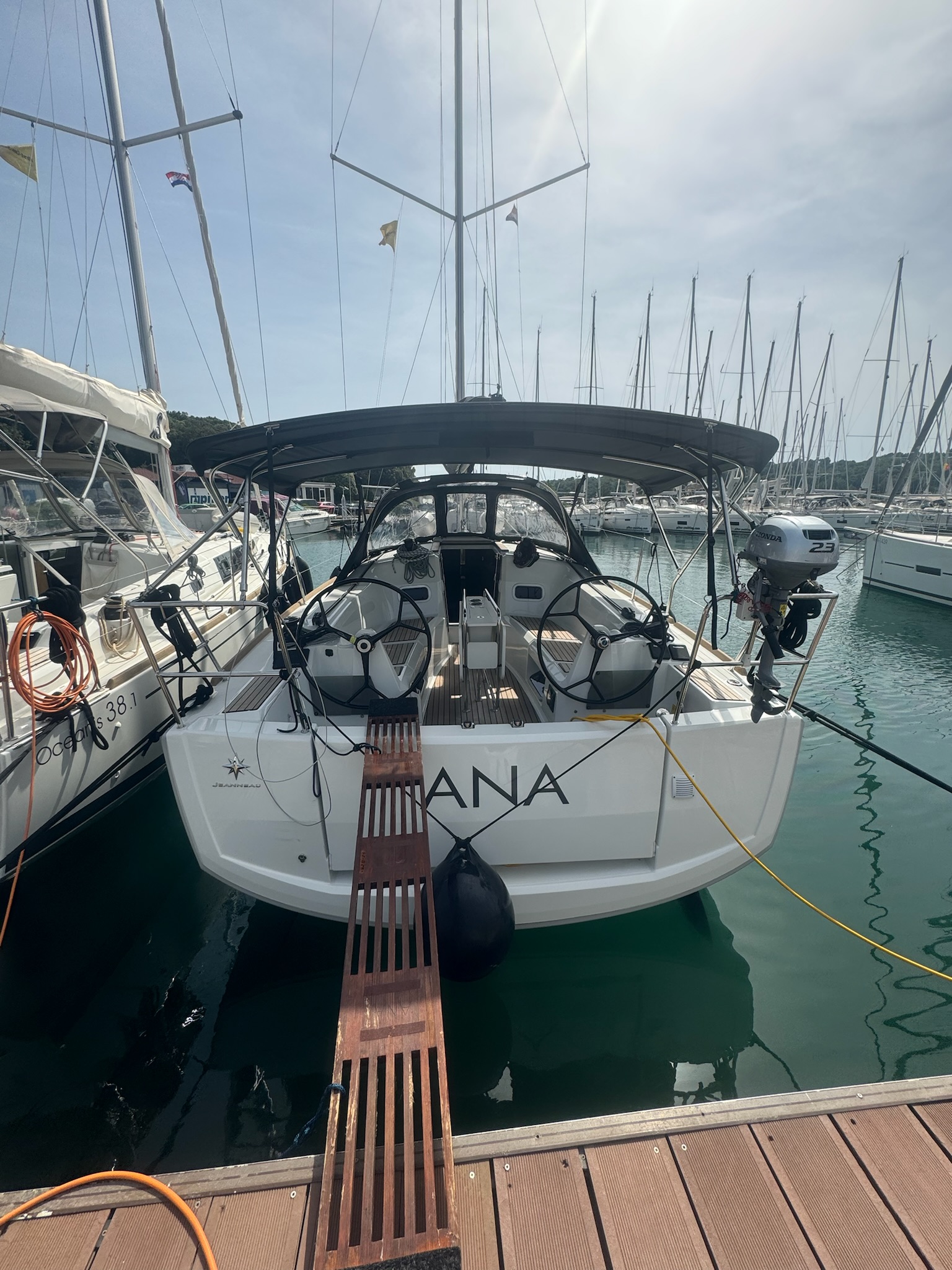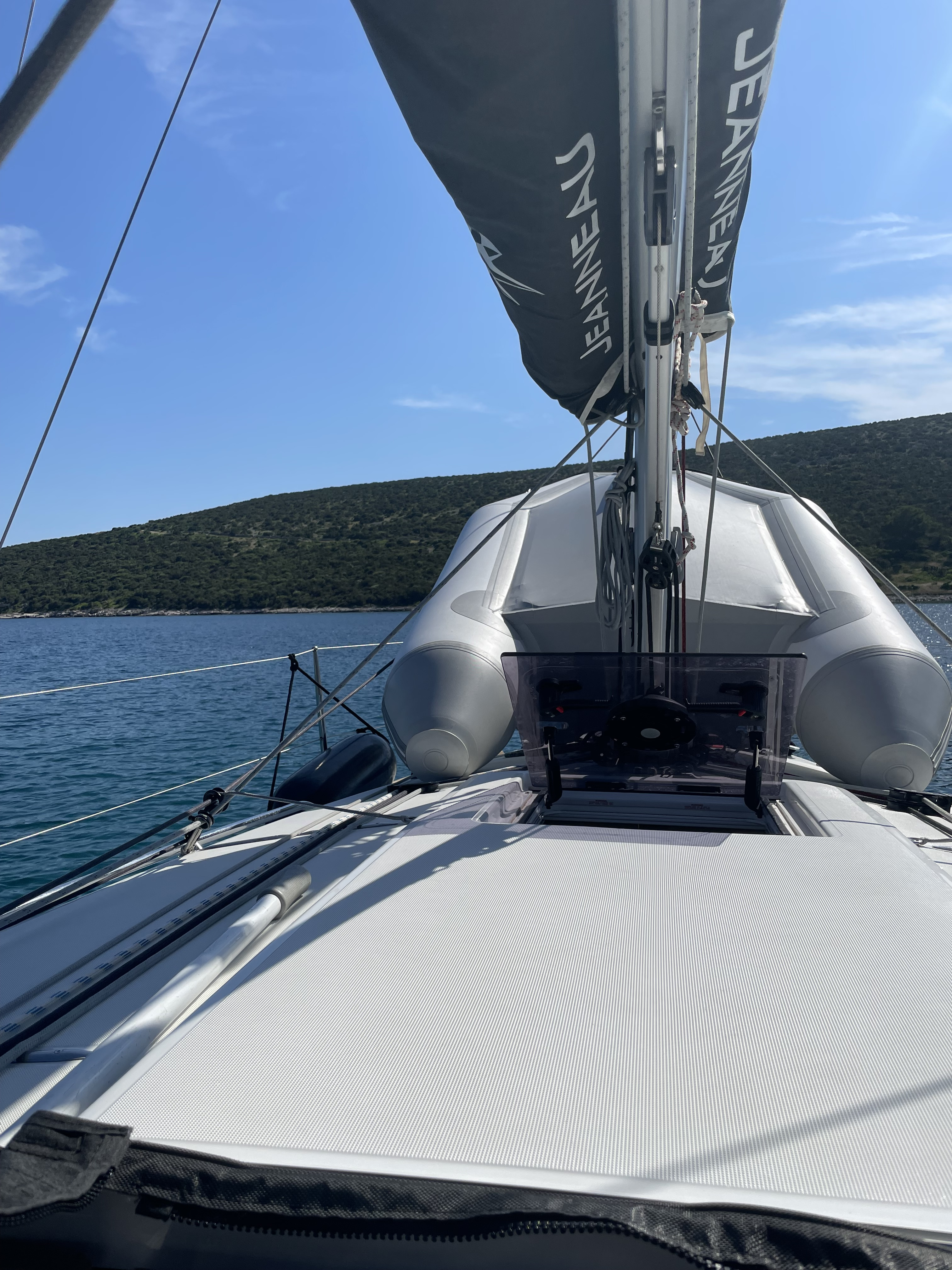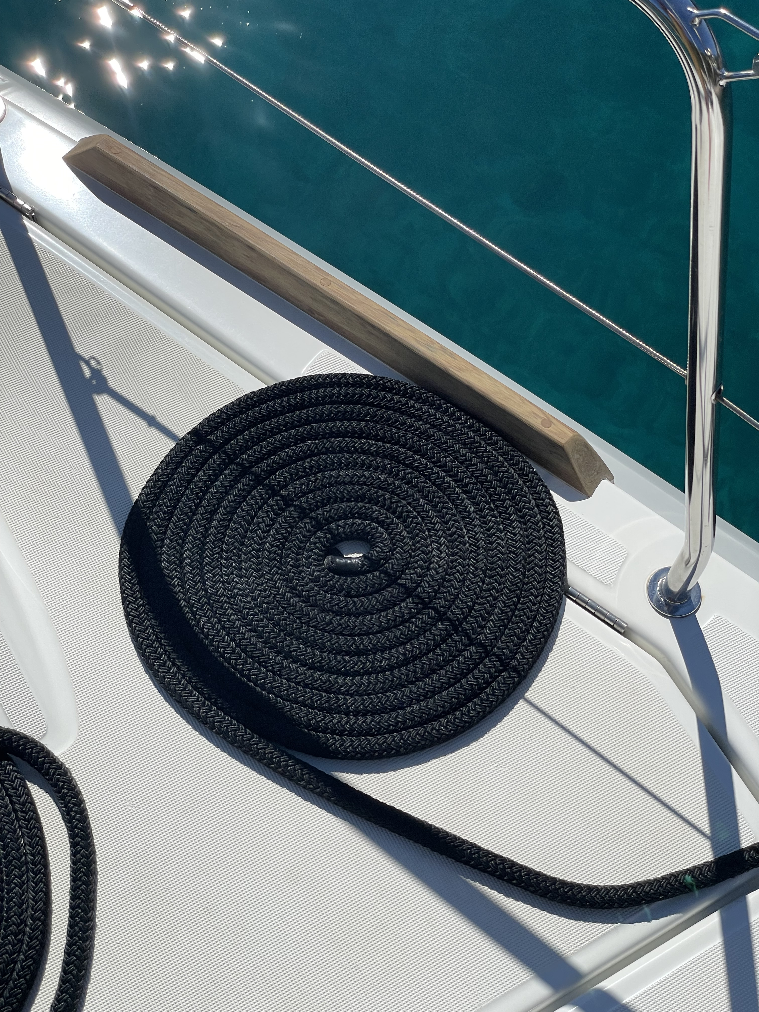 | Outside | 12 V-Anschluss, 220 V-Landanschluss, Anker mit Kette, Badeleiter, Badeplattform, Biminitop, Cockpitdusche, Cockpitpolster, Cockpittisch, Deckbürste, elektr. Ankerwinsch, Fallwinschen, Fender, Festmacherleinen, Gangway, Lifeline System, Solaranlage, Sprayhood, Teak auf Badeplattform, Teak im Cockpit, Wantenschneider, Windex |