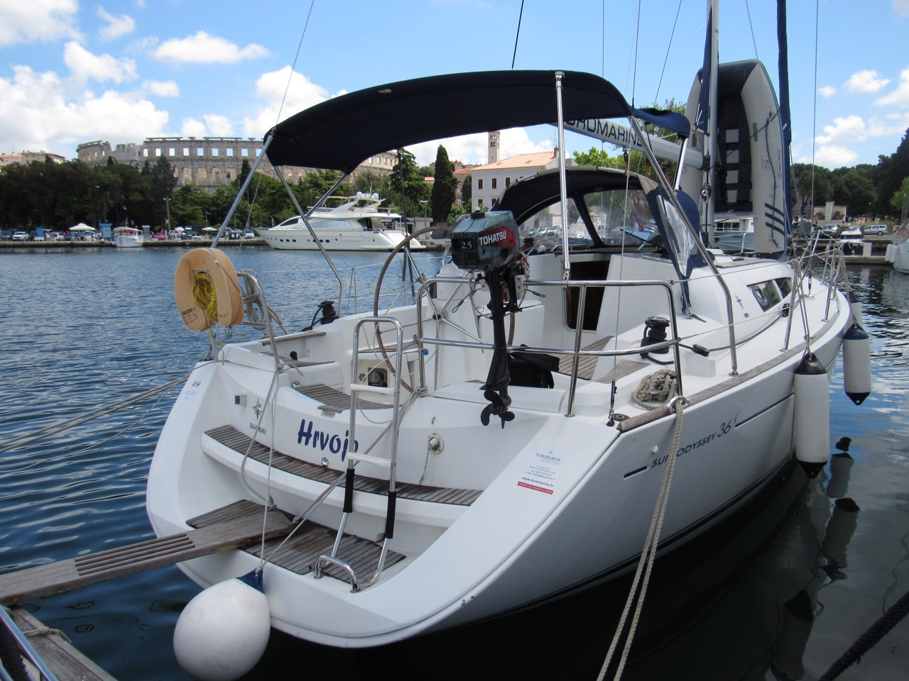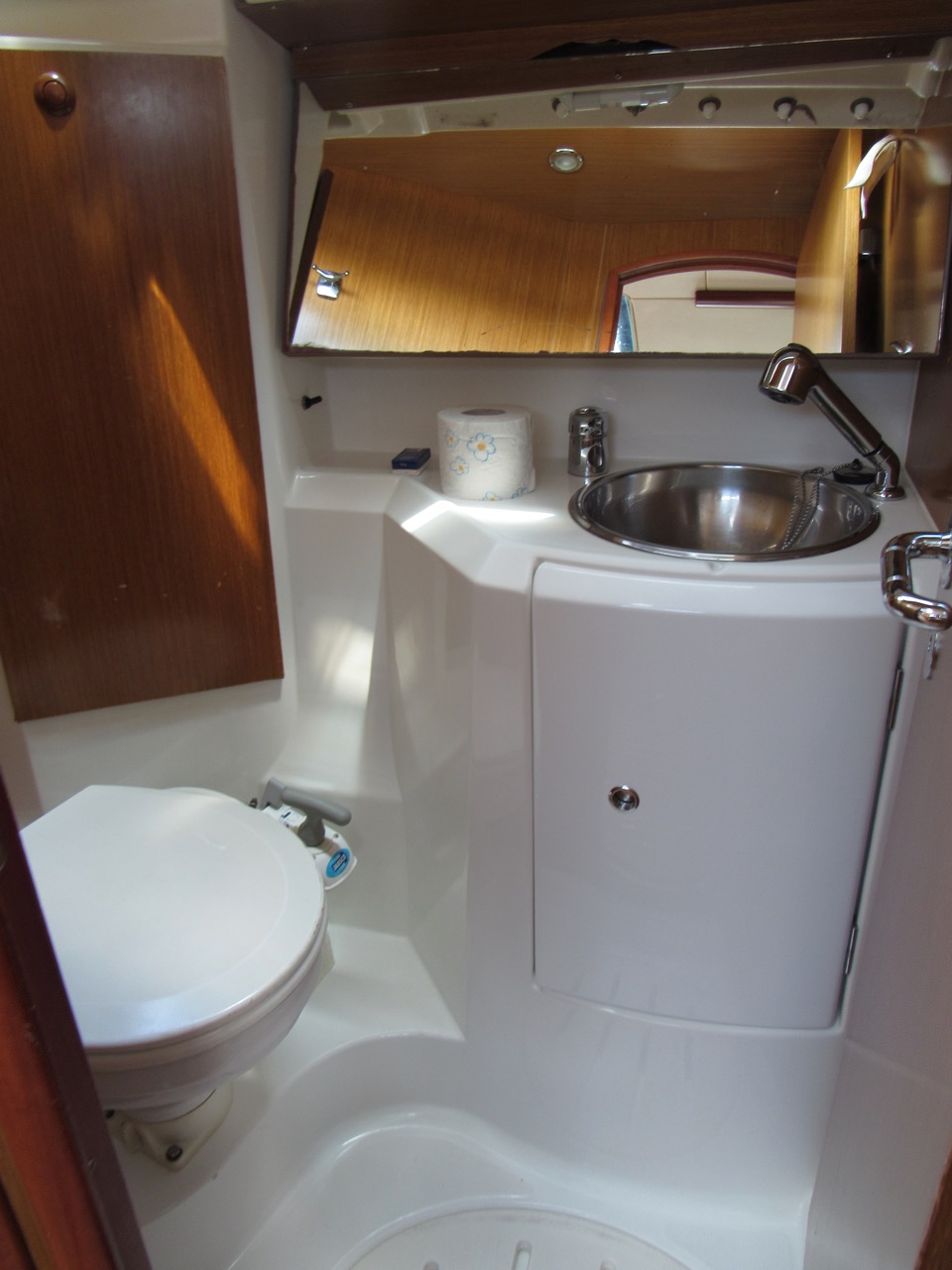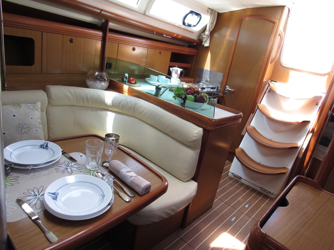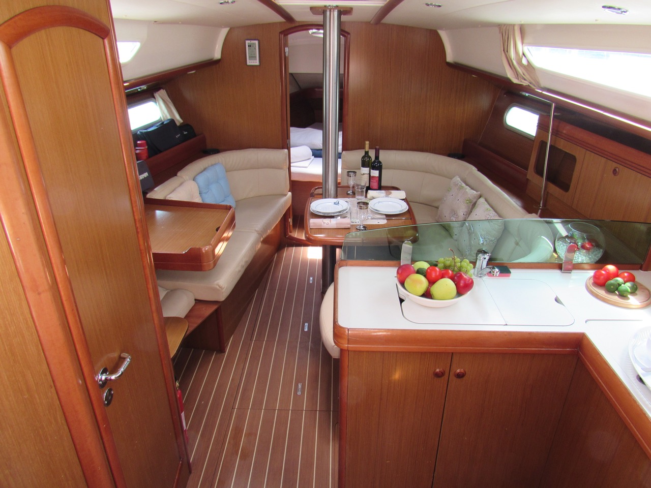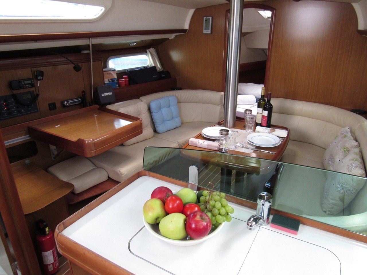 | Outside | 220 V-Landanschluss, Anker mit Kette, Biminitop, Cockpitdusche, Cockpittisch, elektr. Ankerwinsch, Fender, Festmacherleinen, Sprayhood, Windex |
