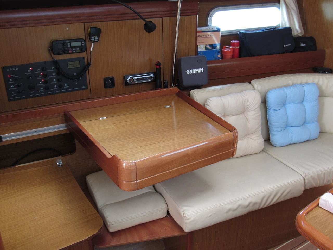 | Navigation | Echolot, Fernglas, GPS mit Kartenplotter im Salon, Hafenhandbücher, Handpeilkompass, Kompass, Navigationsbesteck, Seekarten, Steuerkompass, Sumlog, Windmesser |
