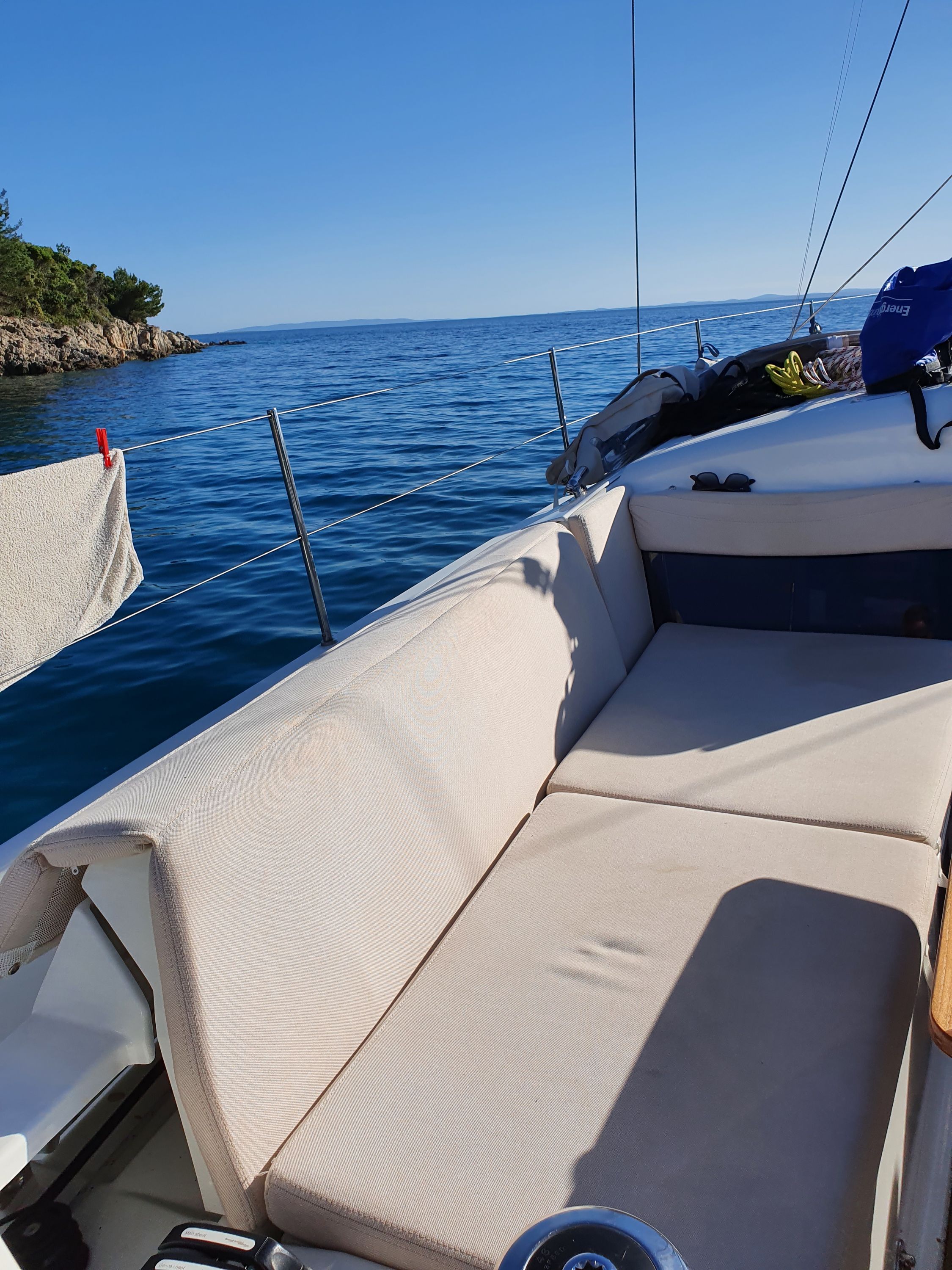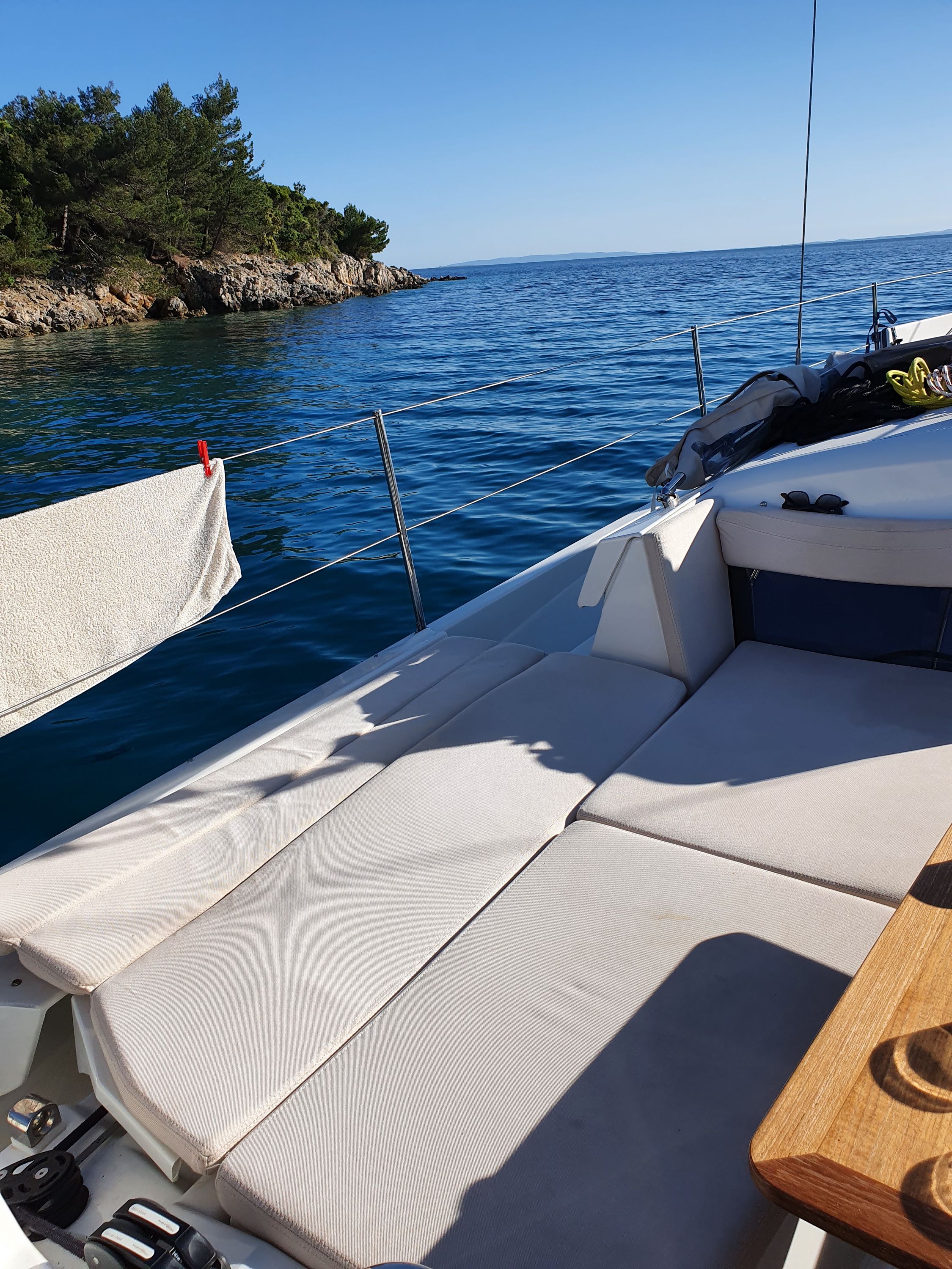 Outside 220 V-Landanschluss, Badeplattform, Biminitop, Cockpitdusche, Cockpitlautsprecher, Cockpitpolster, Cockpittisch, Delta-Anker, elektr. Ankerwinsch, elektr. Winsch, Solaranlage, Sprayhood, Teakdeck