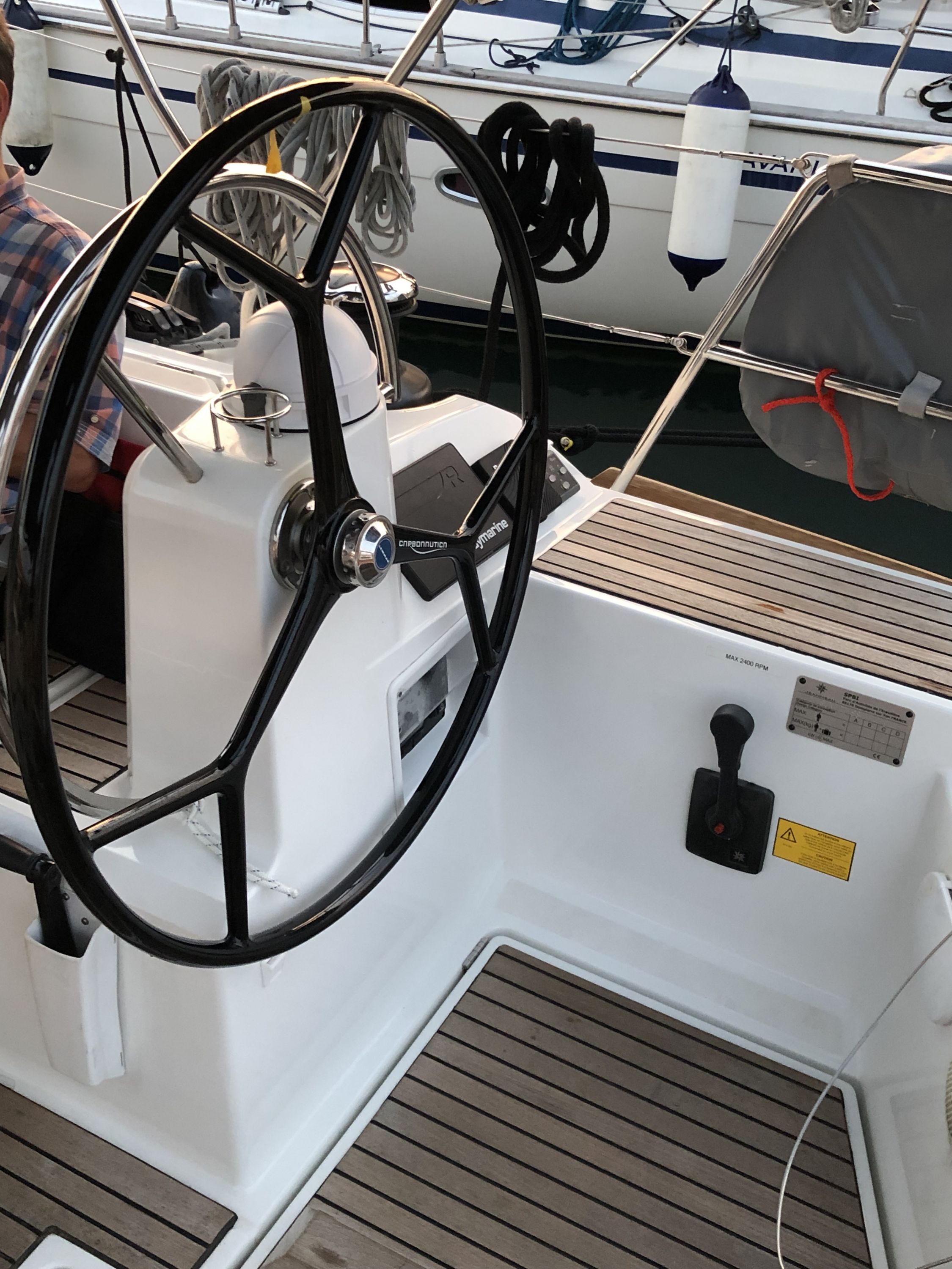 | Outside | 12 V-Anschluss, 220 V-Landanschluss, Anker mit Kette, Ankerkettenzähler, Badeleiter, Badeplattform, Biminitop, Bootshaken, Cockpitdusche, Cockpitlautsprecher, Cockpitpolster, Cockpittisch, elektr. Ankerwinsch, Fender, Fernsteuerung für elektr. Ankerwinsch, Festmacherleinen, Gangway, Kugelfender, Solaranlage, Sprayhood, Teak auf Badeplattform, Teak im Cockpit, Wasserschlauch, Winschen |