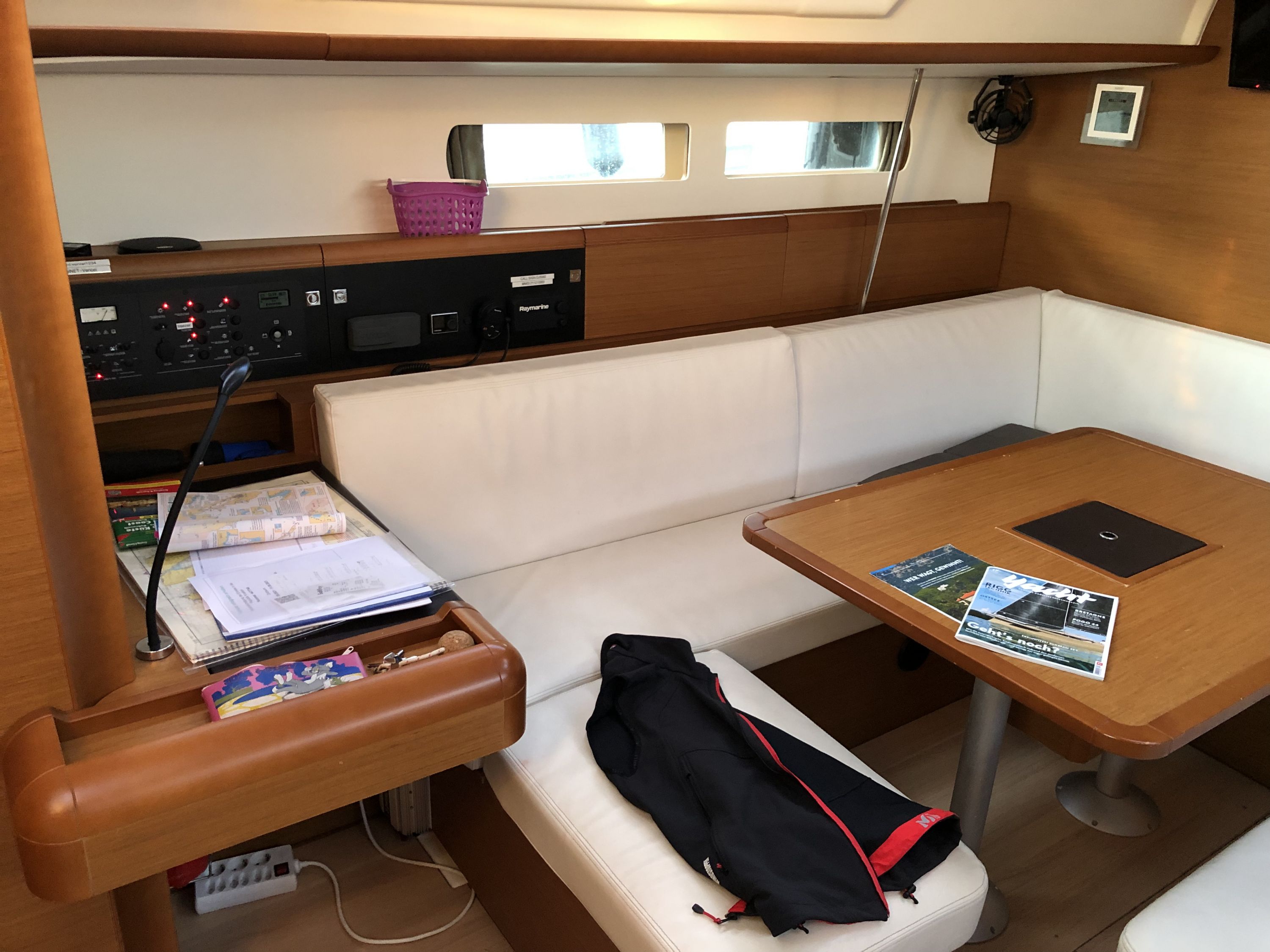 | Navigation | Barometer, Fernglas, GPS mit Kartenplotter im Cockpit, GPS mit Kartenplotter im Salon, Hafenhandbücher, Handpeilkompass, iPad, Kompass, Navigationsbesteck, Seekarten, Tridata (Log, Echolot, Windm.), Windmesser |