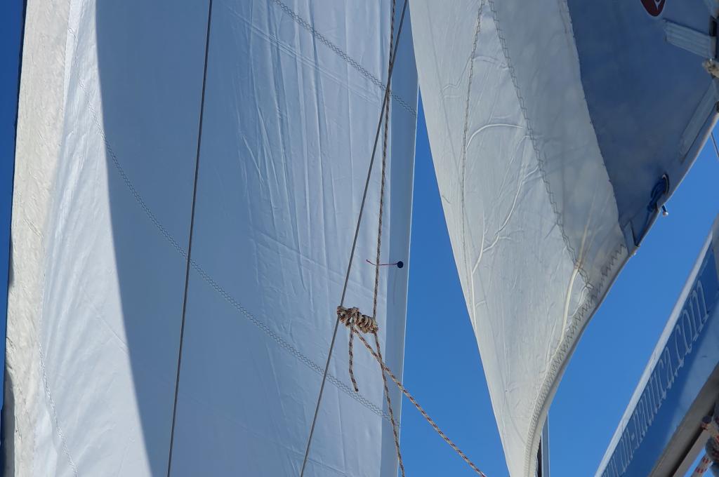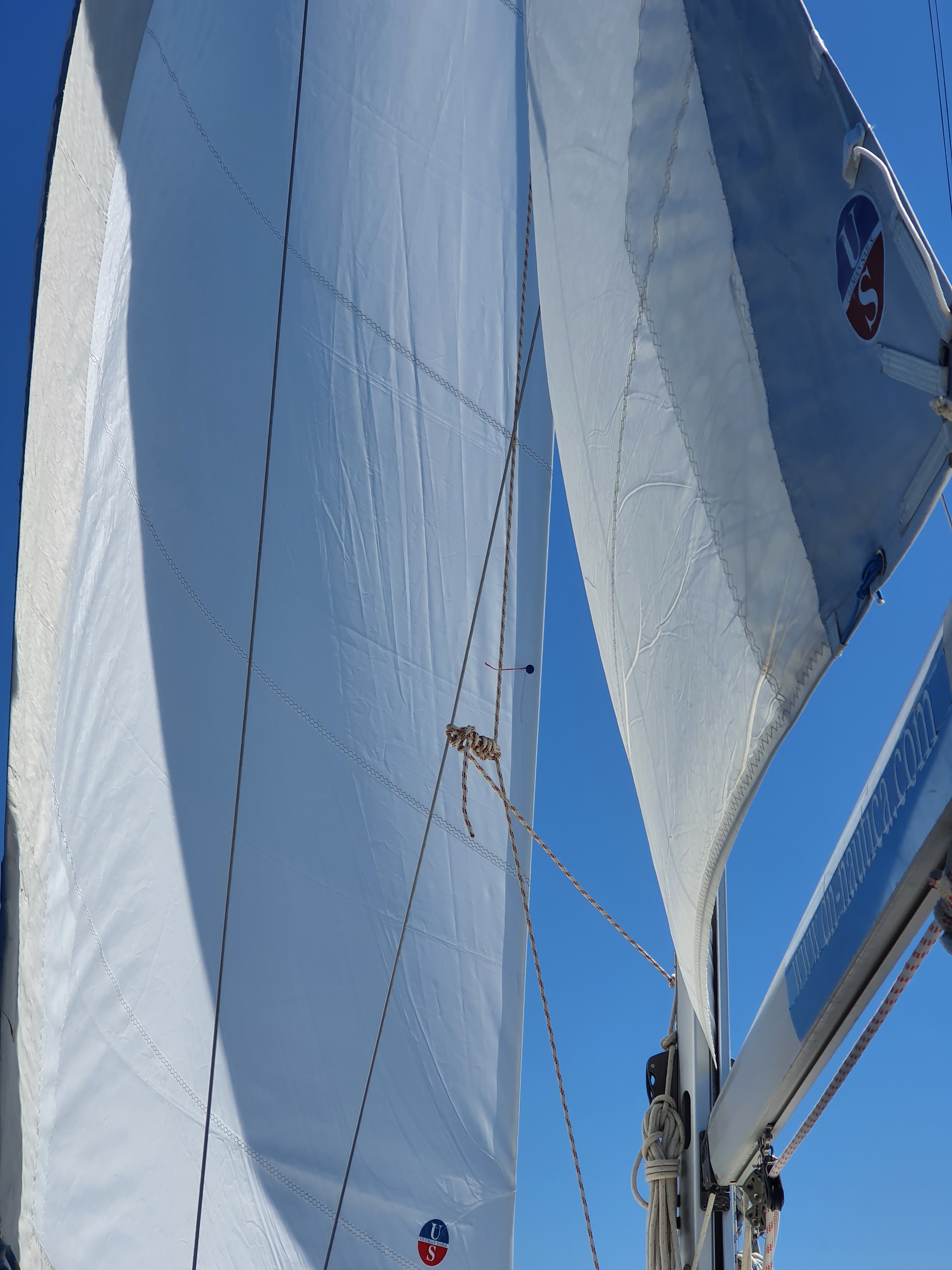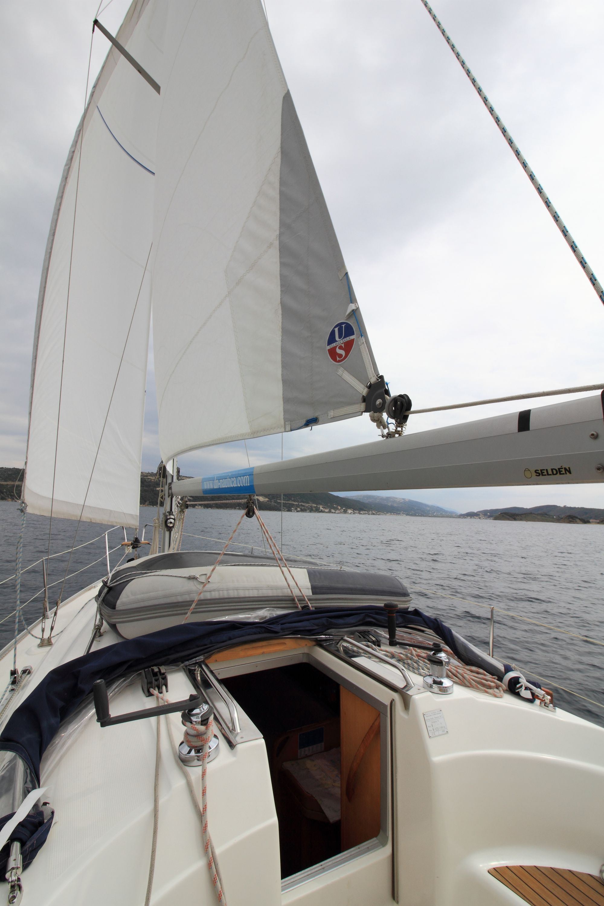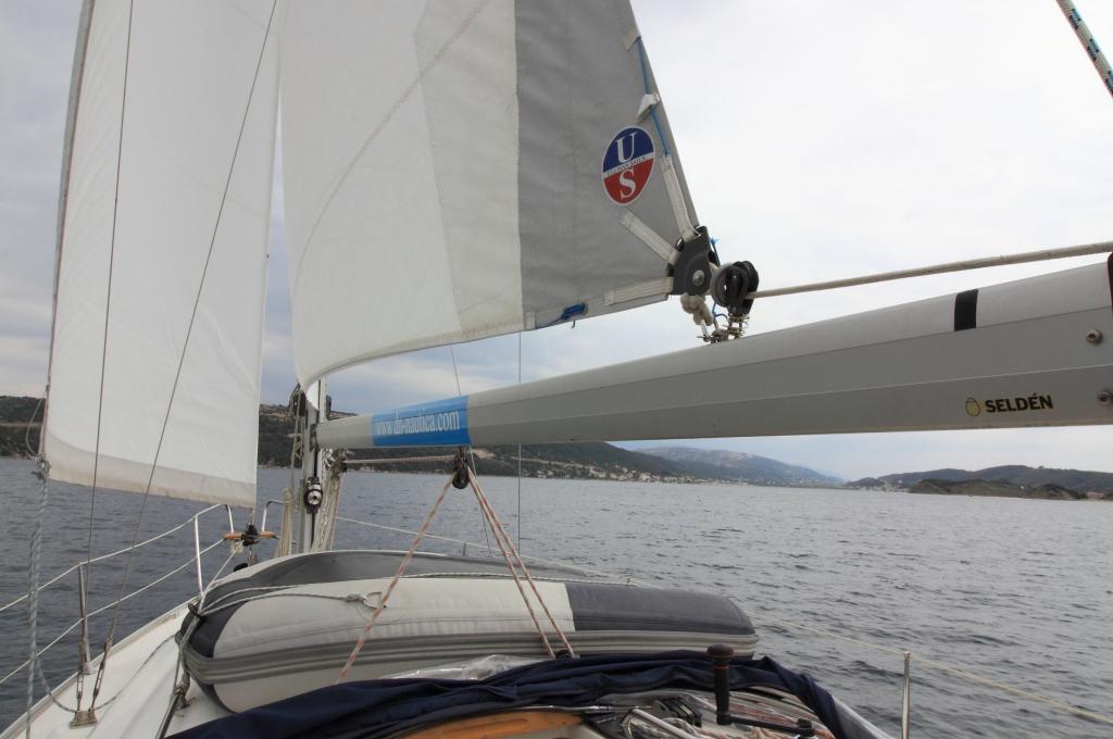 Das Boot hatte ein Rollgroß - Segel im Mast, was auch eine Entscheidung für das Boot war. Der Vorteil ist das Setzen und reffen vom Kockpitt aus möglich ist.