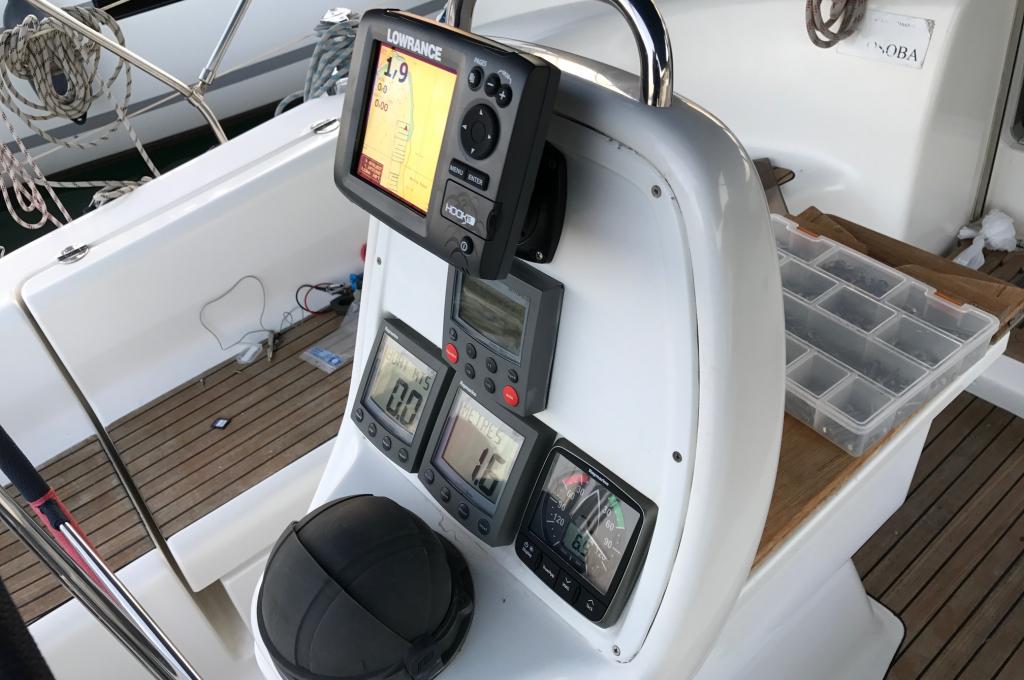 | Navigation | Fernglas, GPS mit Kartenplotter im Cockpit, Hafenhandbücher, Handpeilkompass, Navigationsbesteck, Tridata (Log, Echolot, Windm.), Windmesser |