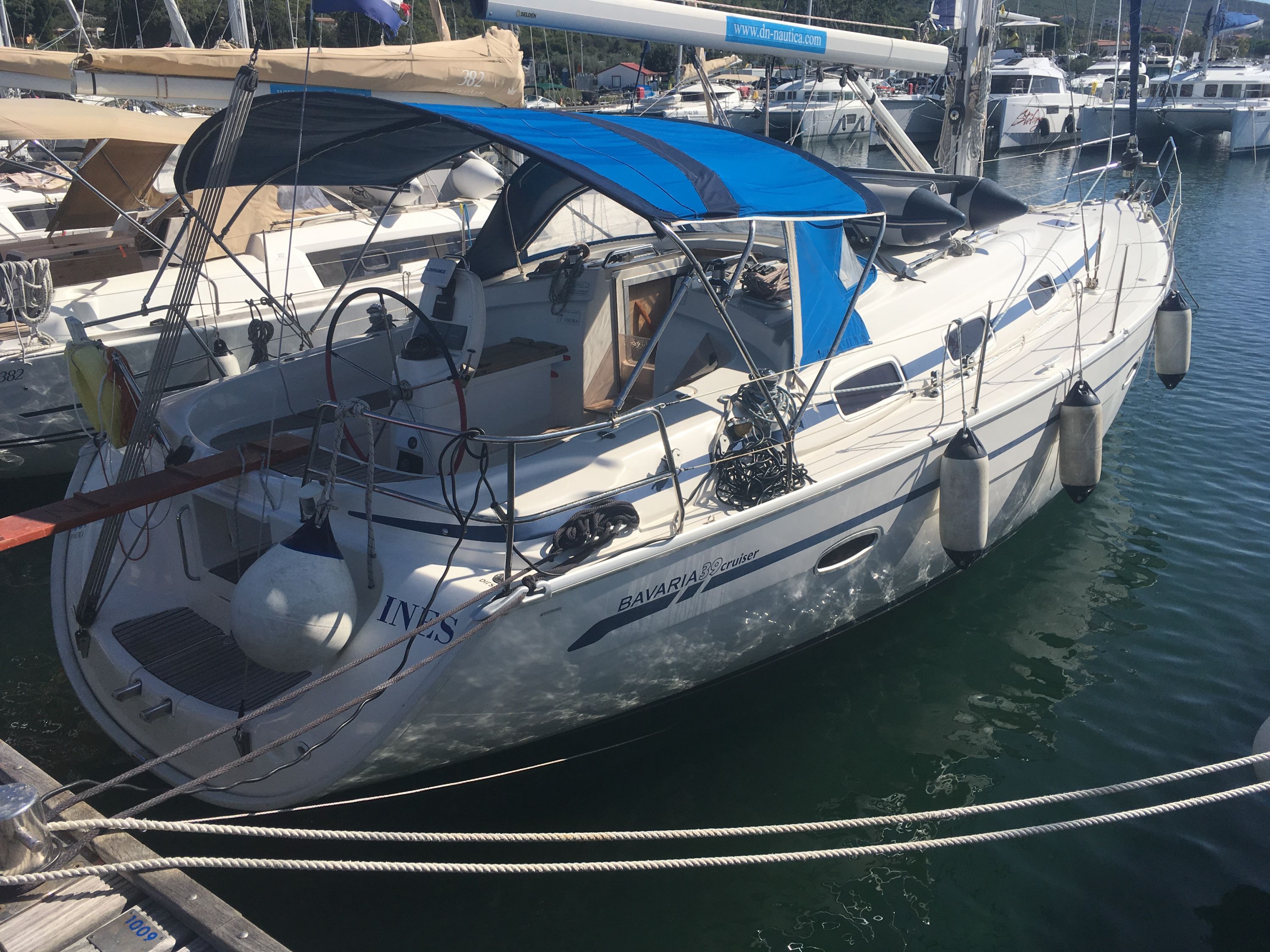 | Outside | Anker mit Kette, Biminitop, Bootshaken, Cockpitdusche, Cockpitpolster, Cockpittisch, elektr. Ankerwinsch, Fender, Festmacherleinen, Kugelfender, Kunststoff-Eimer (Pütz), Solaranlage, Sprayhood, Wasserschlauch |