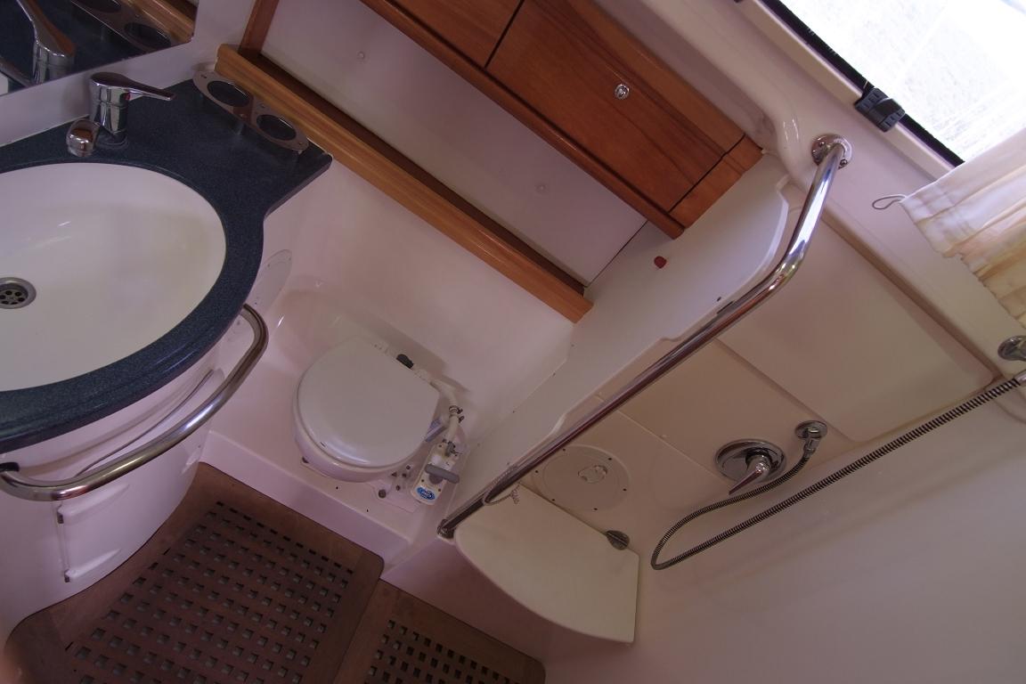 | Outside | 220 V-Landanschluss, Anker mit Kette, Biminitop, Bootshaken, Cockpitdusche, Cockpittisch, elektr. Ankerwinsch, Fender, Festmacherleinen, Kunststoff-Eimer (Pütz), Rodkicker, Solaranlage, Sprayhood, Teakdeck, Wasserschlauch, Winschen |