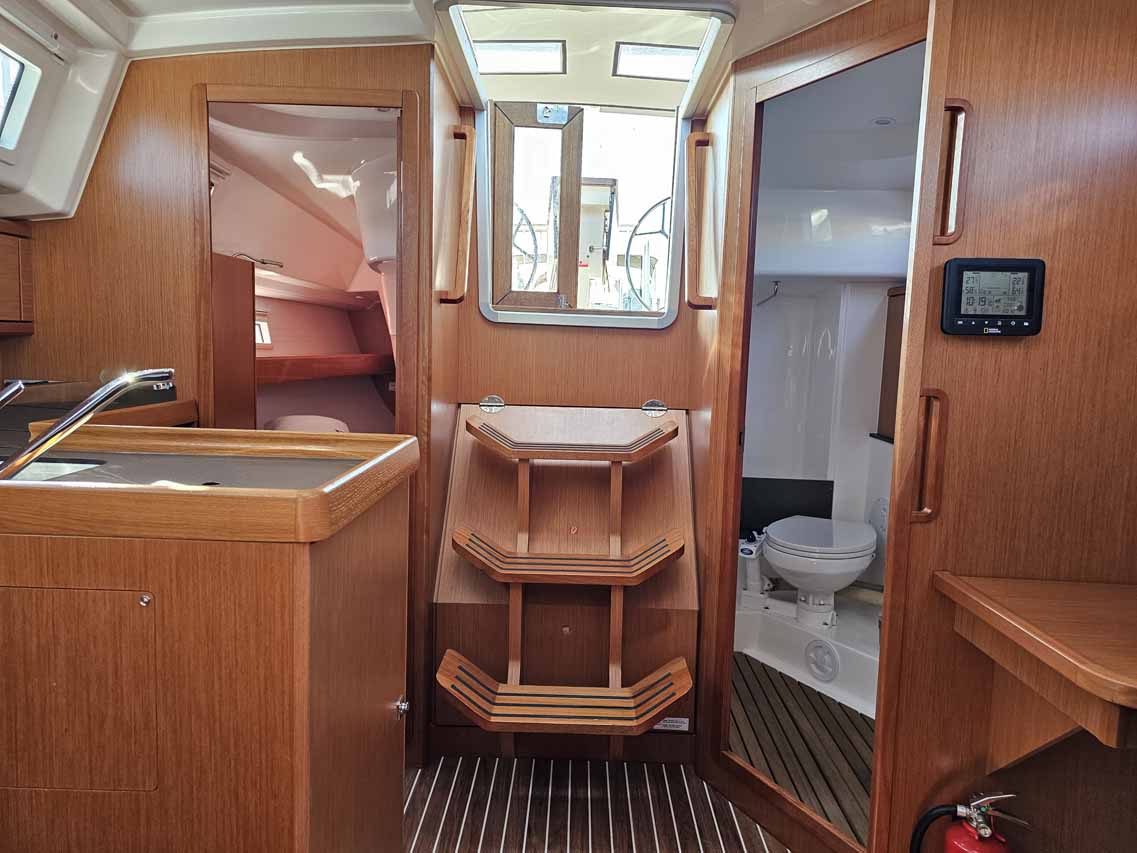| Navigation | Barometer, Fernglas mit Peilkompass, GPS mit Kartenplotter im Cockpit, Hafenhandbücher, Navigationsbesteck, Seekarten, Tridata (Log, Echolot, Windm.) |