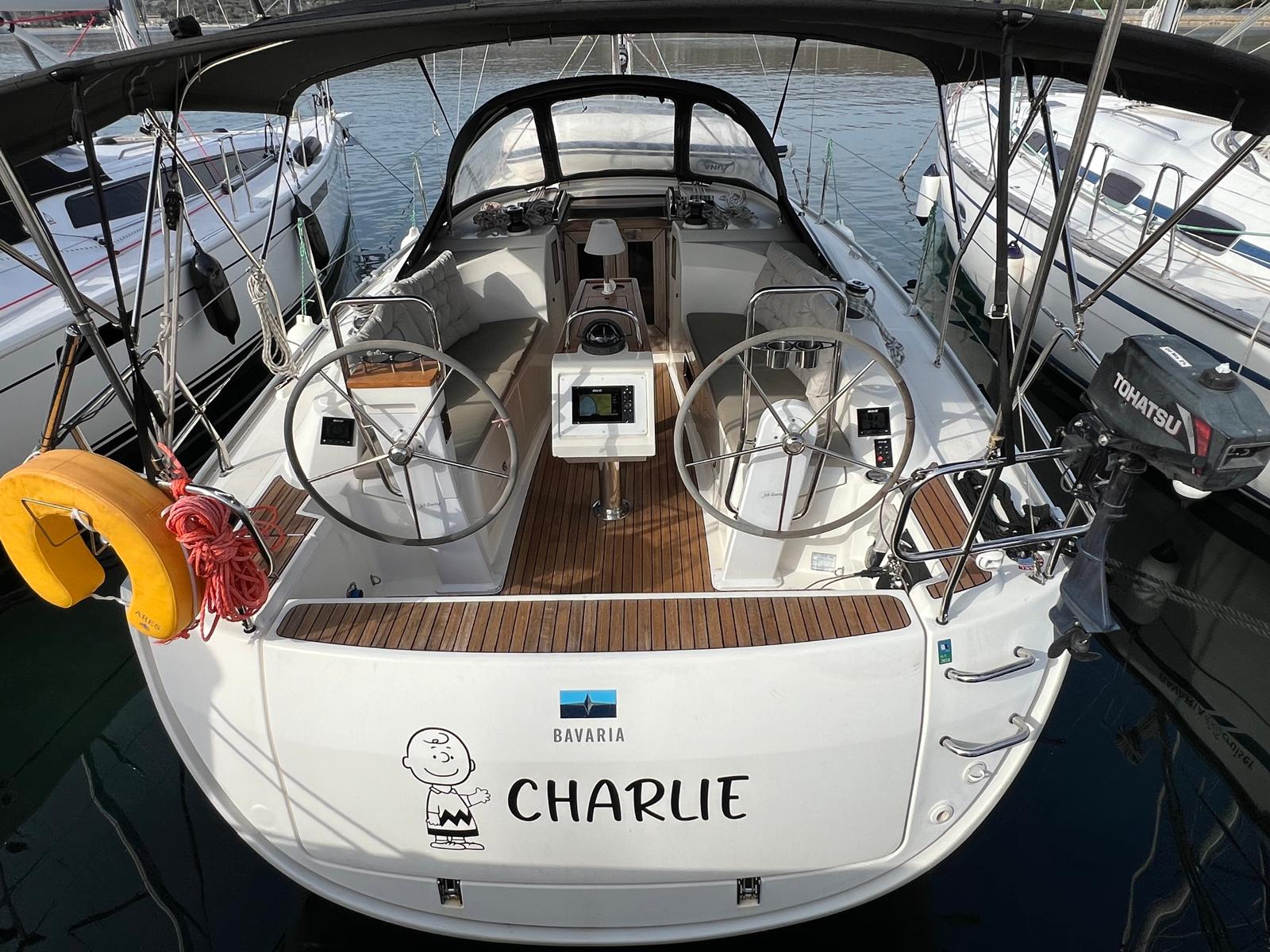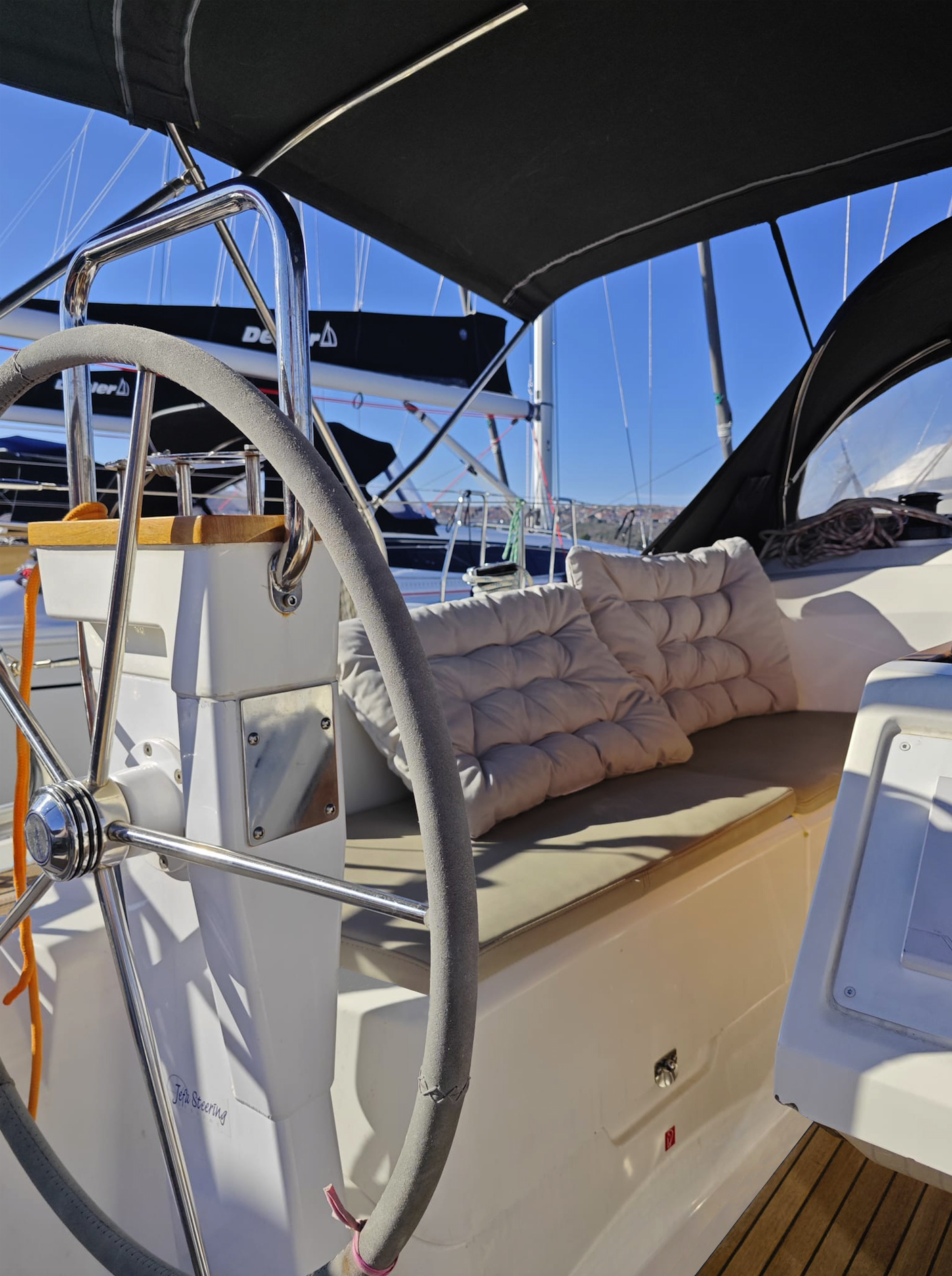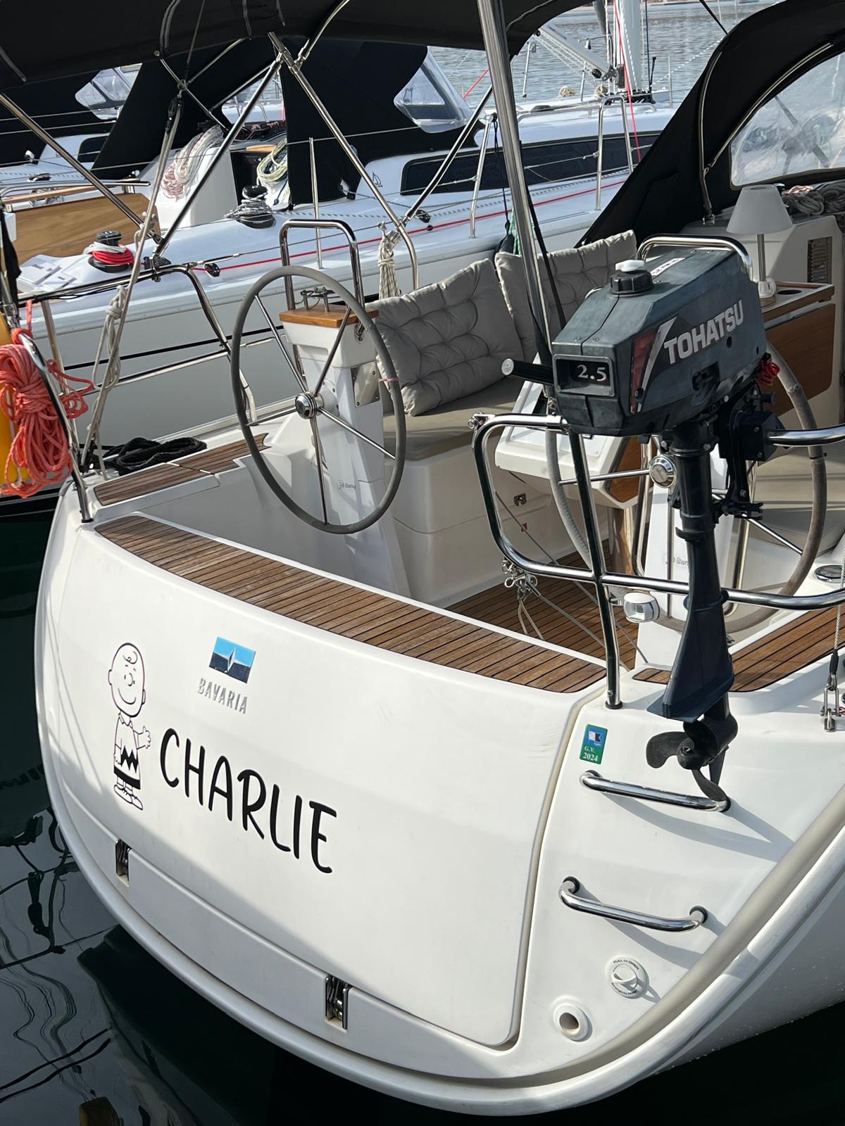| Outside | Biminitop, Bootshaken, Cockpitdusche, Cockpitpolster, Cockpittisch, Deckbürste, elektr. Ankerwinsch, Fender, Festmacherleinen, Gangway, Kugelfender, Kunststoff-Eimer (Pütz), Solaranlage, Sprayhood, Teak im Cockpit, Treibanker, Vorhängeschloss, Wasserschlauch, Winschen |