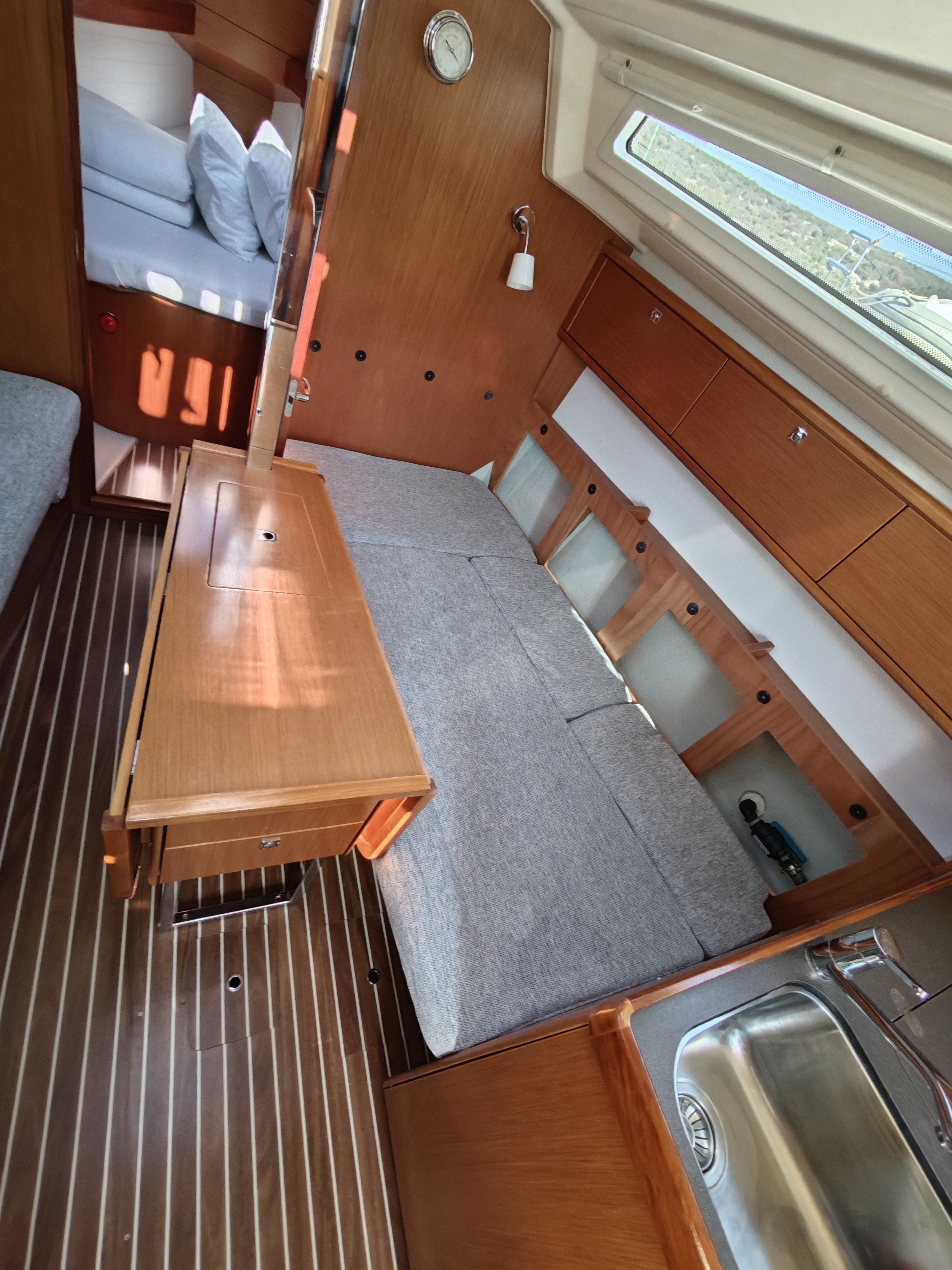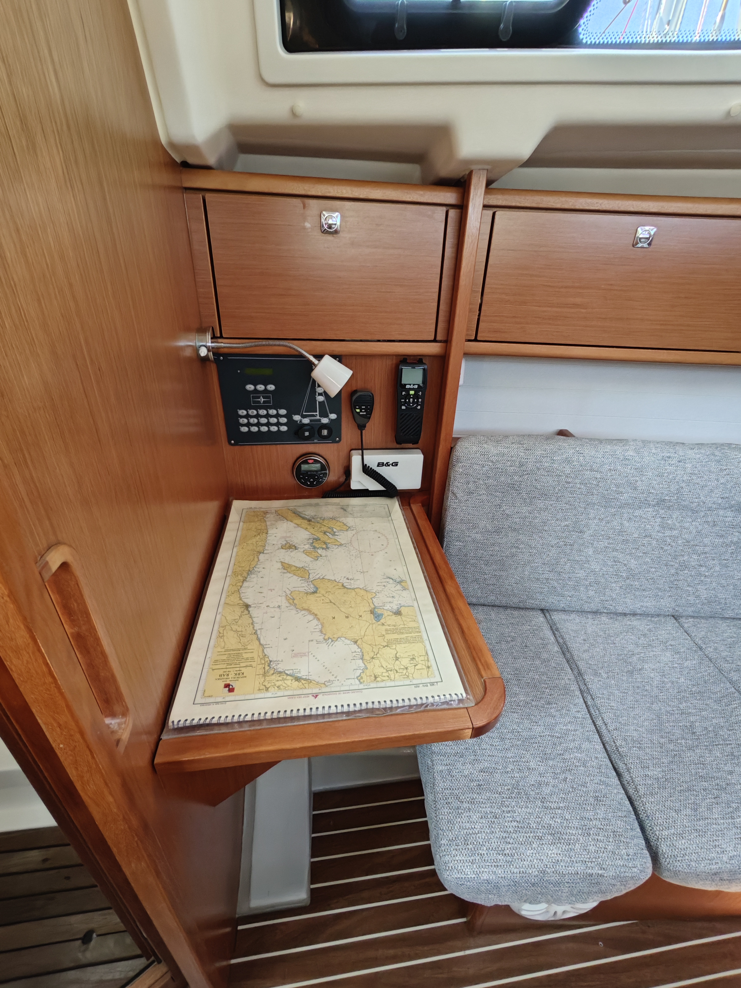 | Navigation | Barometer, Echolot, GPS mit Kartenplotter im Cockpit, Hafenhandbücher, Navigationsbesteck, Seekarten, Sumlog, Tridata (Log, Echolot, Windm.) |