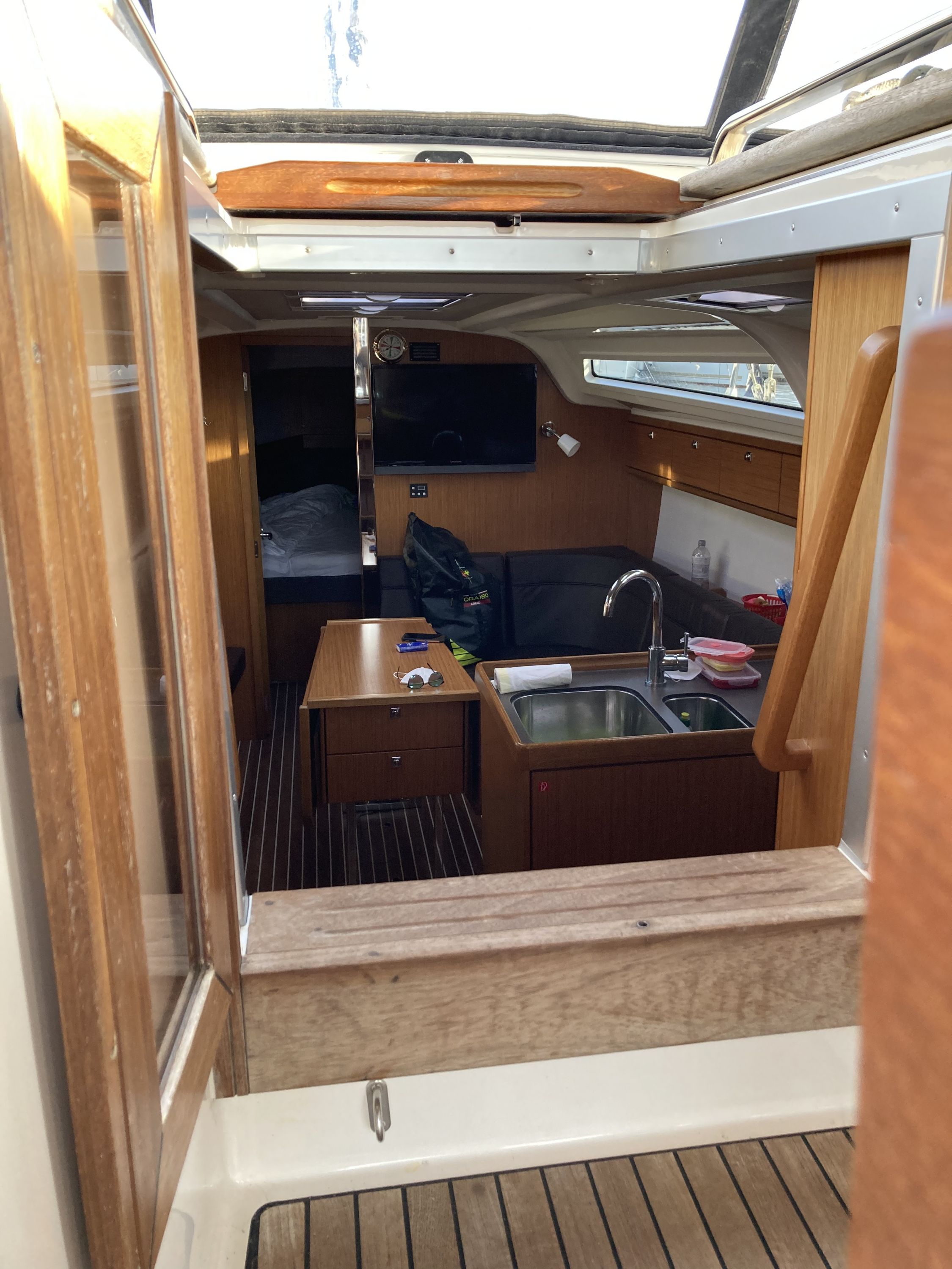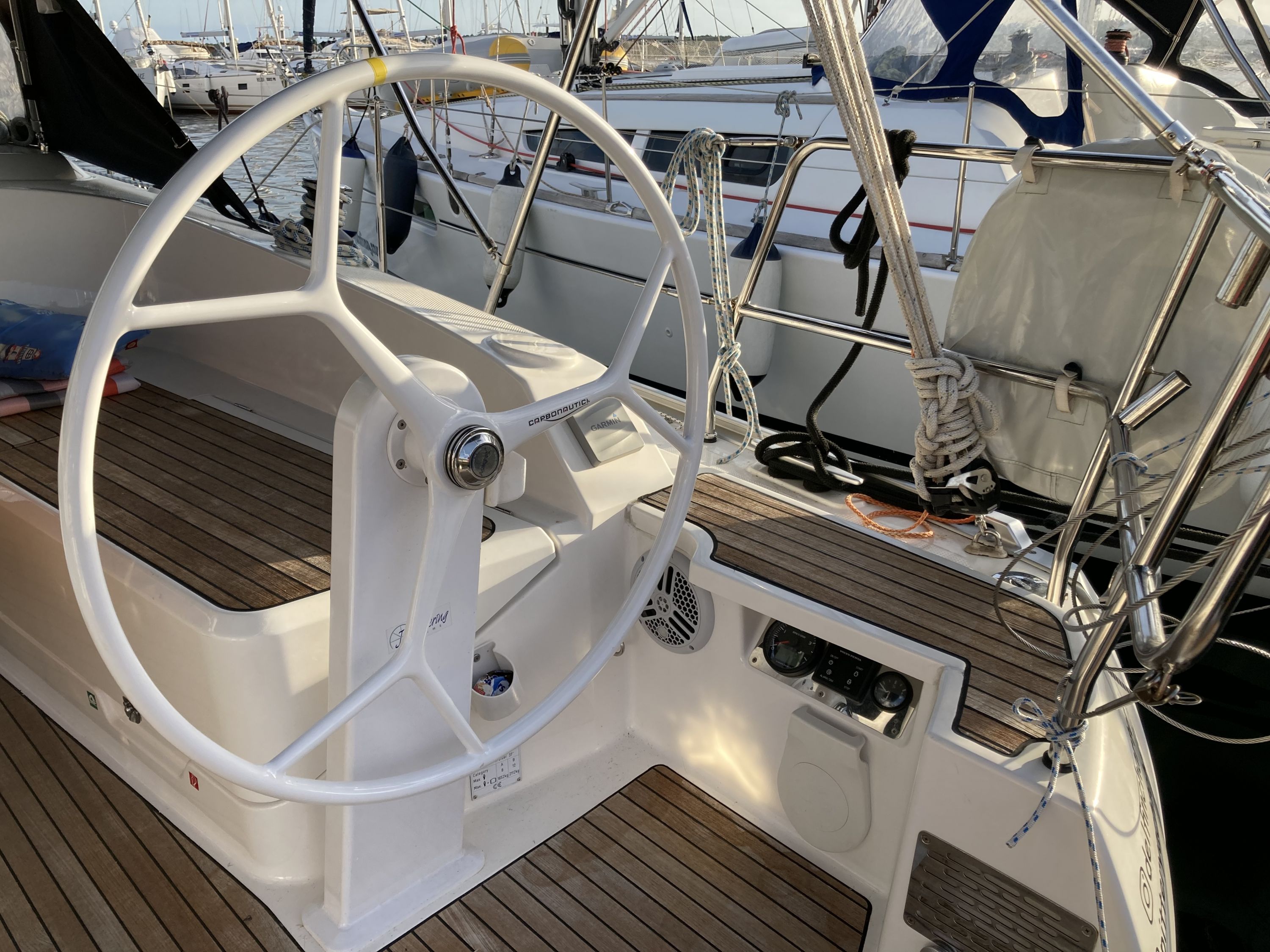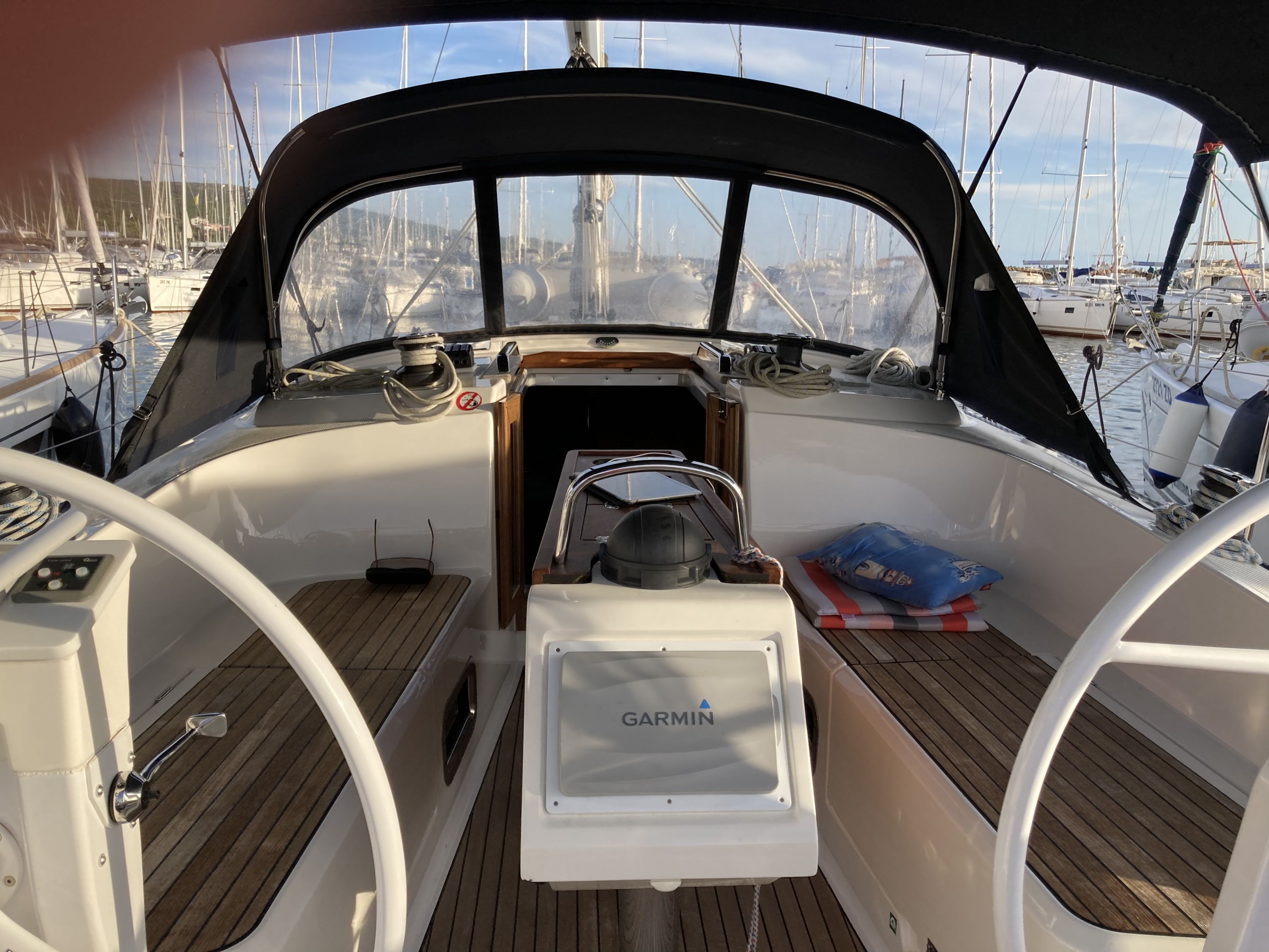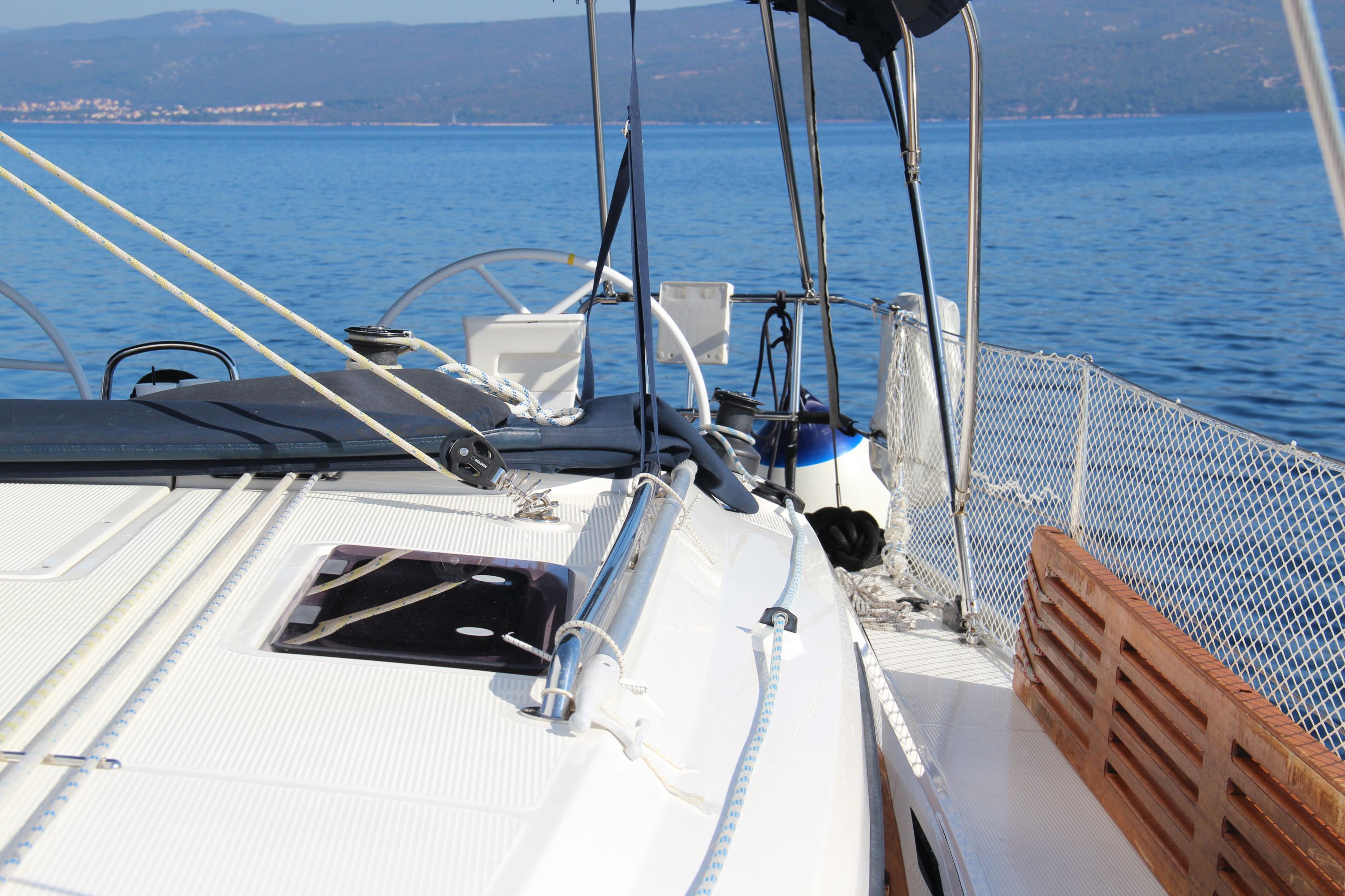 | Outside | Anker mit Kette, Badeplattform, Biminitop, Bootshaken, Cockpitdusche, Cockpitkühlschrank, Cockpitlautsprecher, Cockpitpolster, Cockpittisch, elektr. Ankerwinsch, Fender, Festmacherleinen, Gangway, Kugelfender, Solaranlage, Sprayhood, Teak im Cockpit, Wasserschlauch, Winschen |