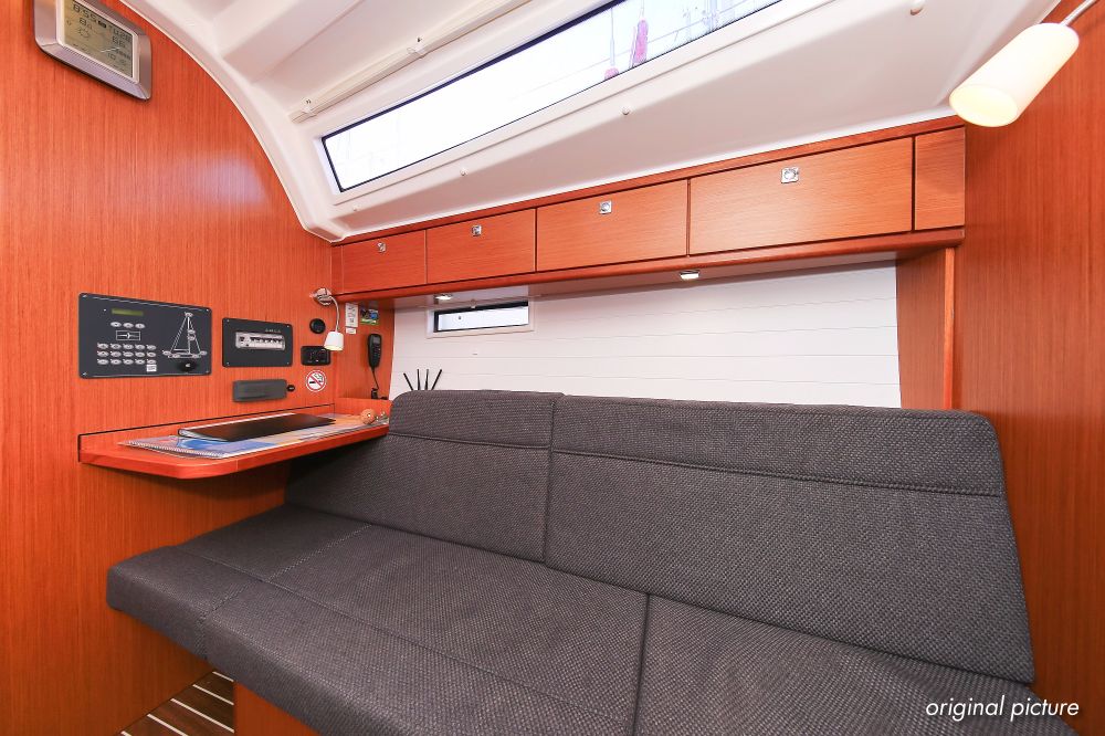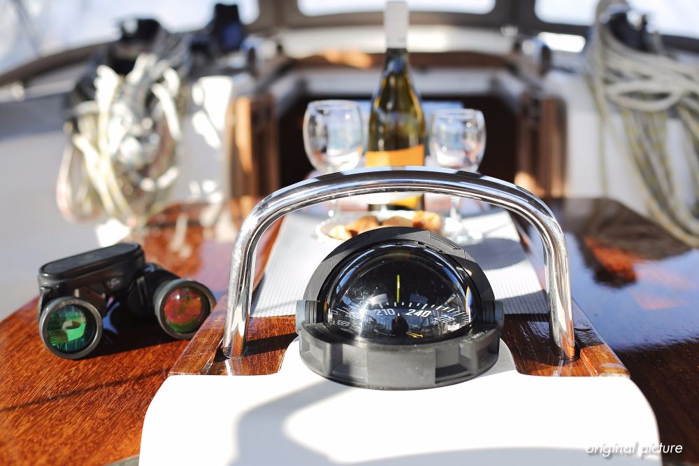 | Navigation | Barometer, Fernglas mit Peilkompass, GPS mit Kartenplotter im Cockpit, Hafenhandbücher, Handpeilkompass, Navigationsbesteck, Seekarten, Tridata (Log, Echolot, Windm.) |