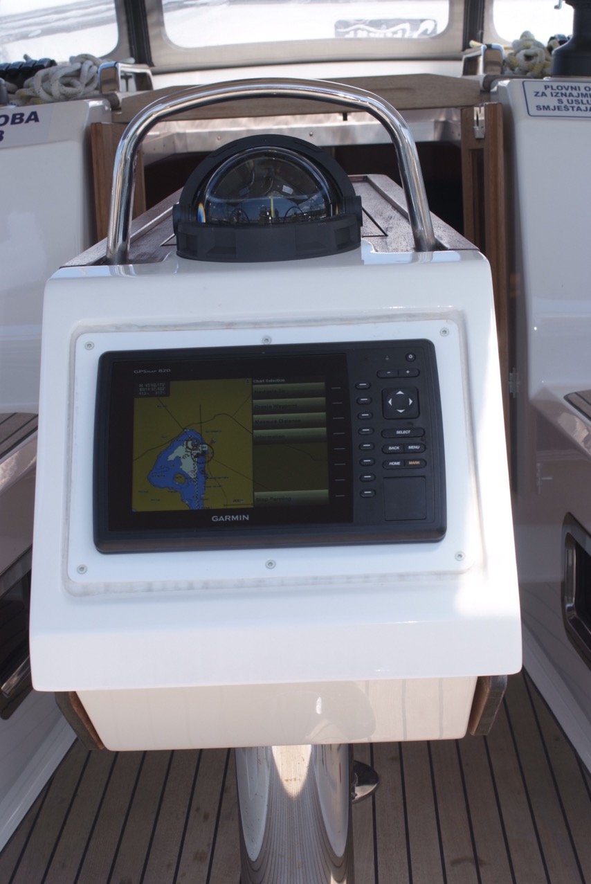 Navigation Fernglas, GPS mit Kartenplotter im Cockpit, Hafenhandbücher, Handpeilkompass, Seekarten, Tridata (Log, Echolot, Windm.)
