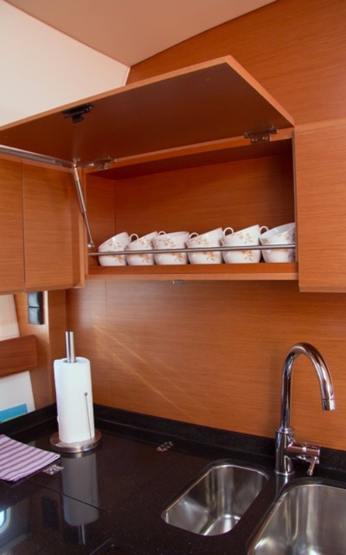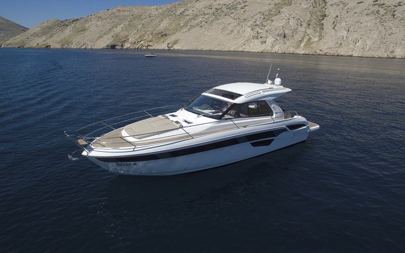 | Outside | 220 V-Landanschluss, Anker mit Kette, Badeleiter, Badeplattform (hydr.), Cockpitdusche warm/kalt, Cockpitlautsprecher, Cockpittisch, elektr. Ankerwinsch, Fender, Hardtop, Scheibenwischer, Seereling, Sonnensegel, Tendergarage |