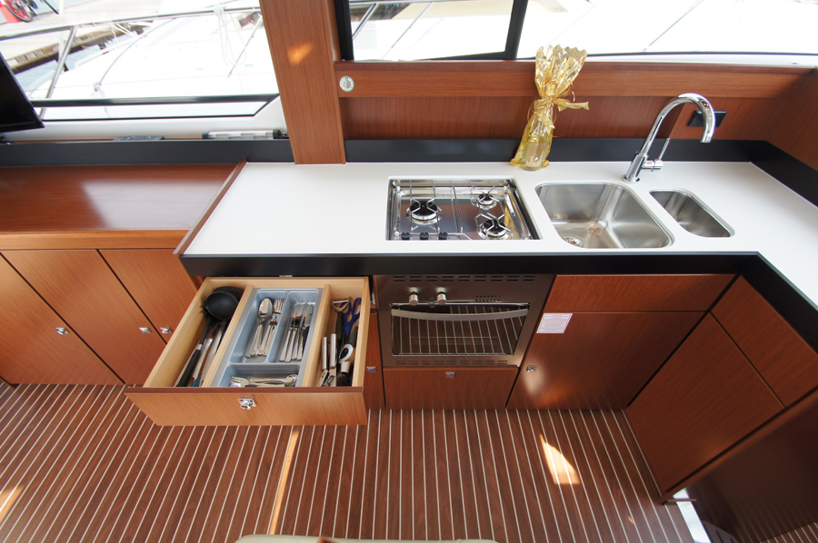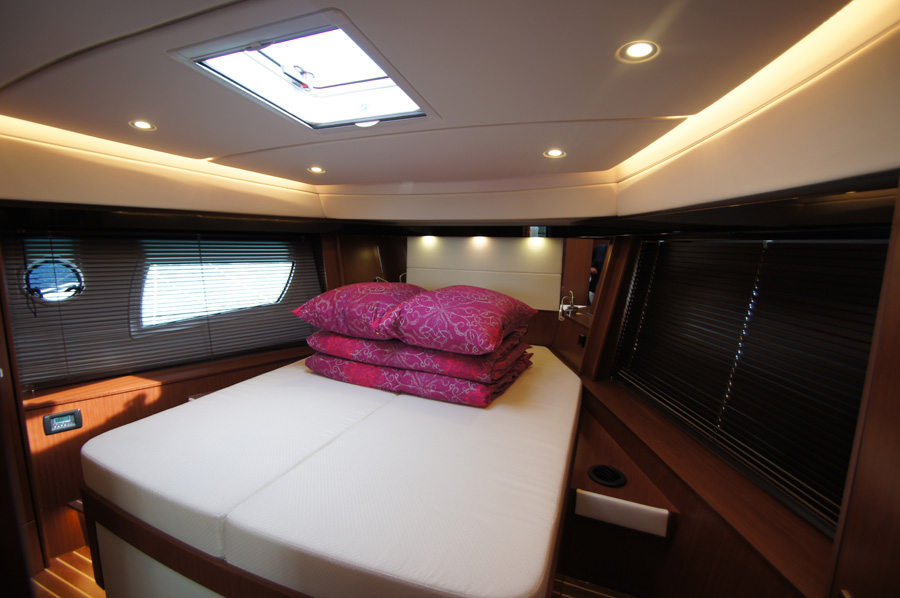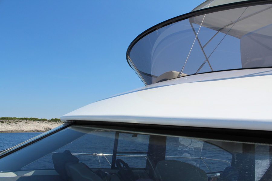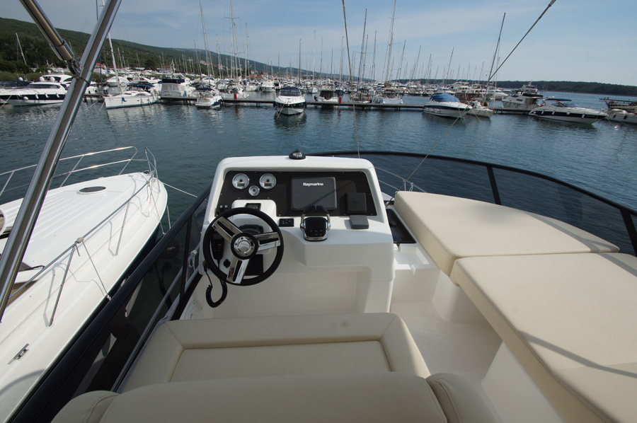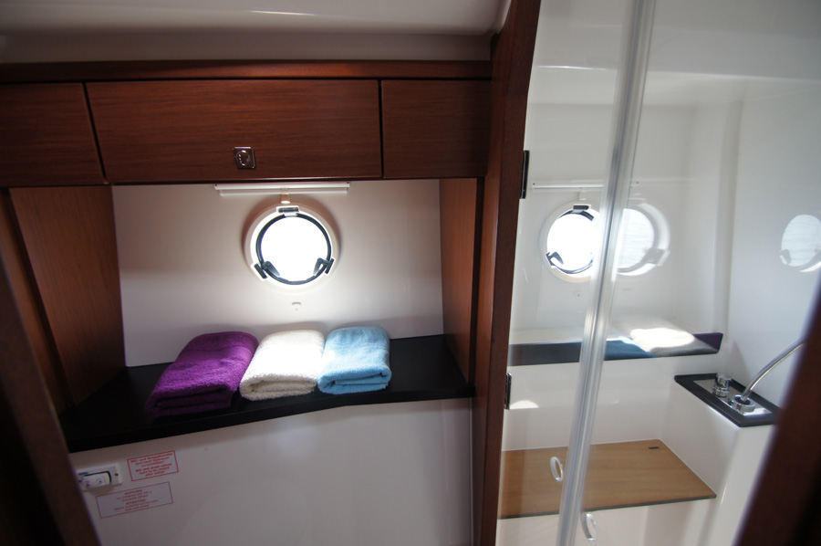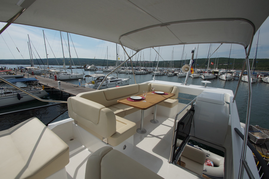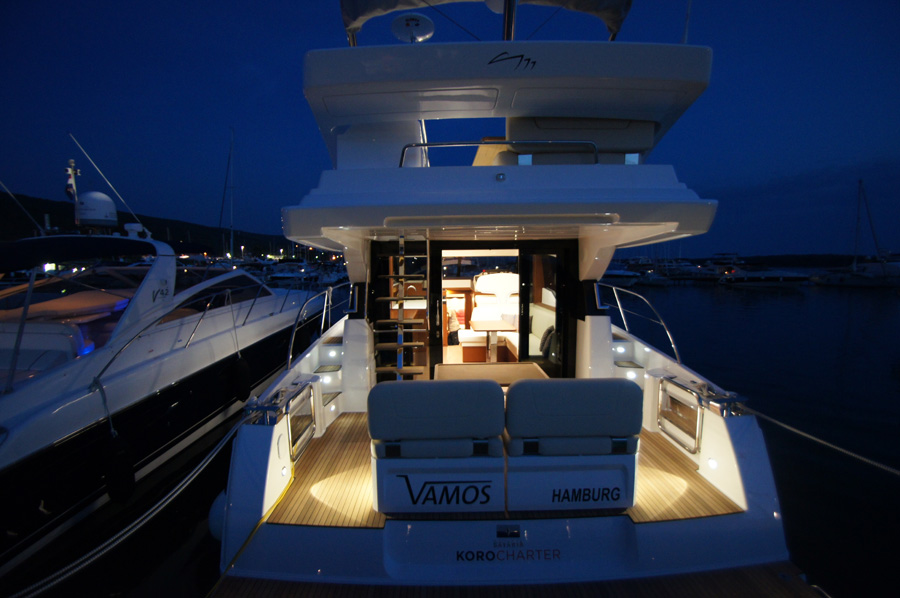 | Outside | 220 V-Landanschluss, Anker mit Kette, Cockpitdusche warm/kalt, Cockpittisch, elektr. Ankerwinsch, Fender, Hardtop, Scheibenwischer, Seereling, Teakdeck |