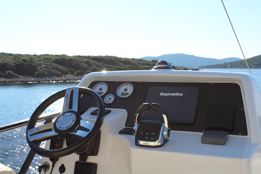 | Navigation | 2-Hebelschaltung, Drehzahlmesser, Echolot, Fernglas, GPS mit Kartenplotter, Hafenhandbücher, Kompass, Seekarten, Sumlog, Trimmklappen (hydr.) |