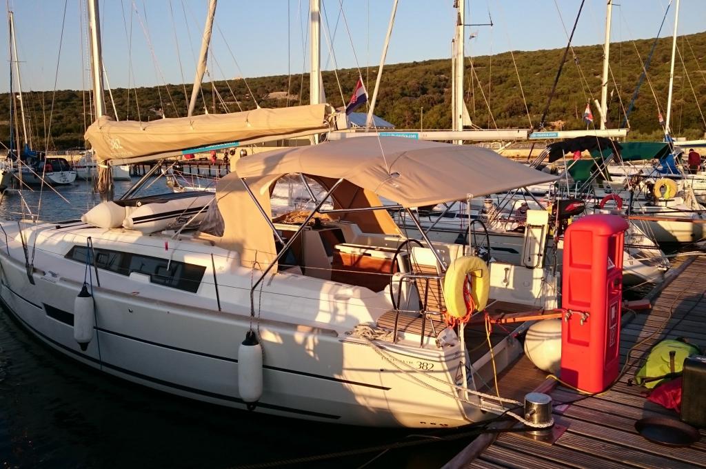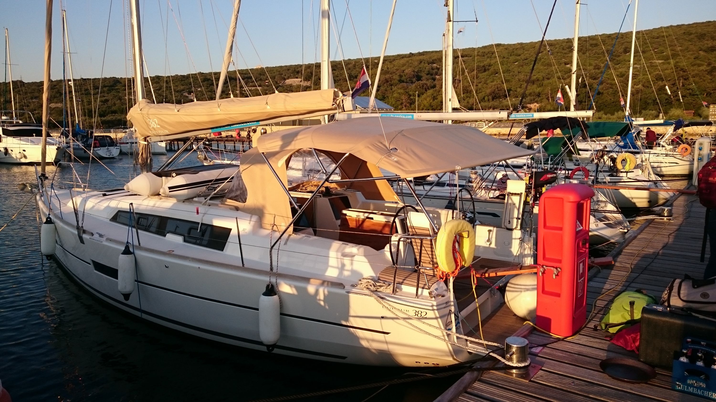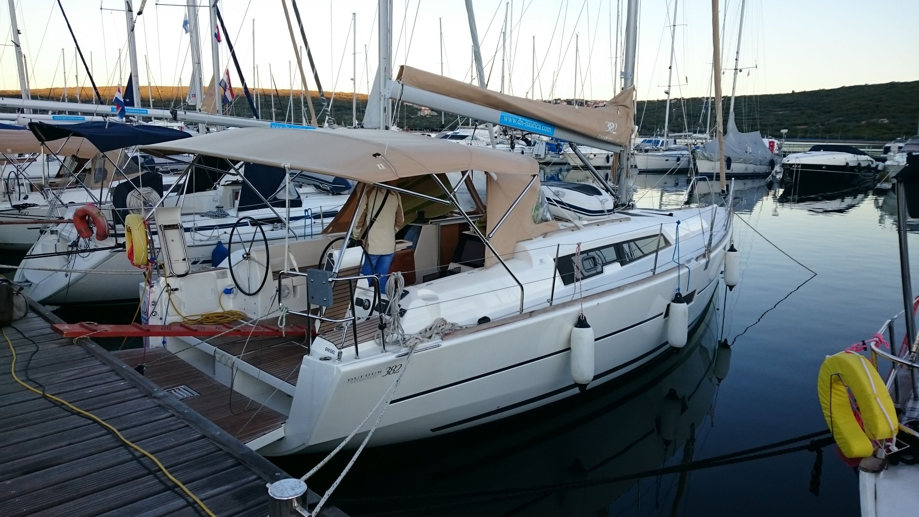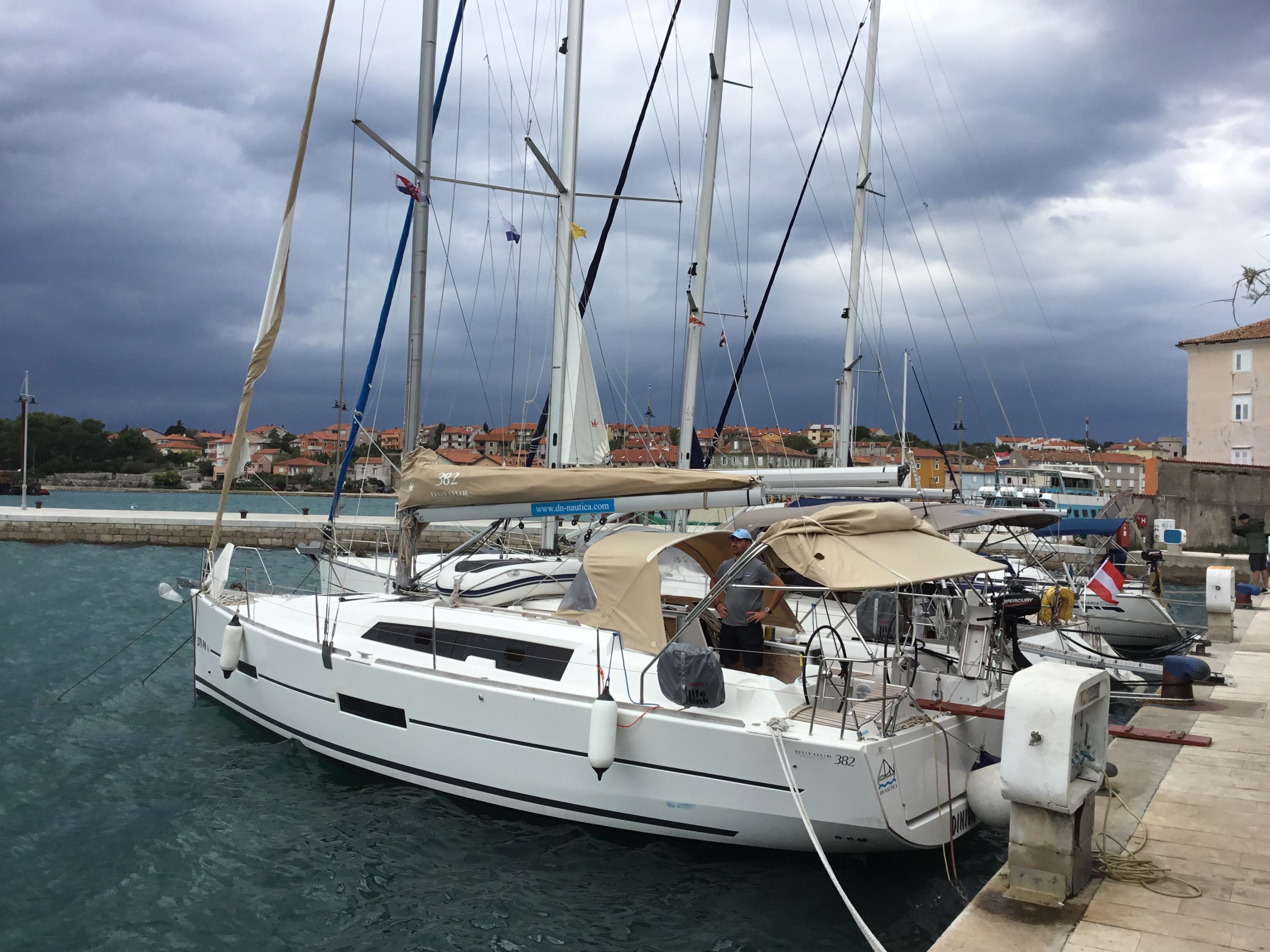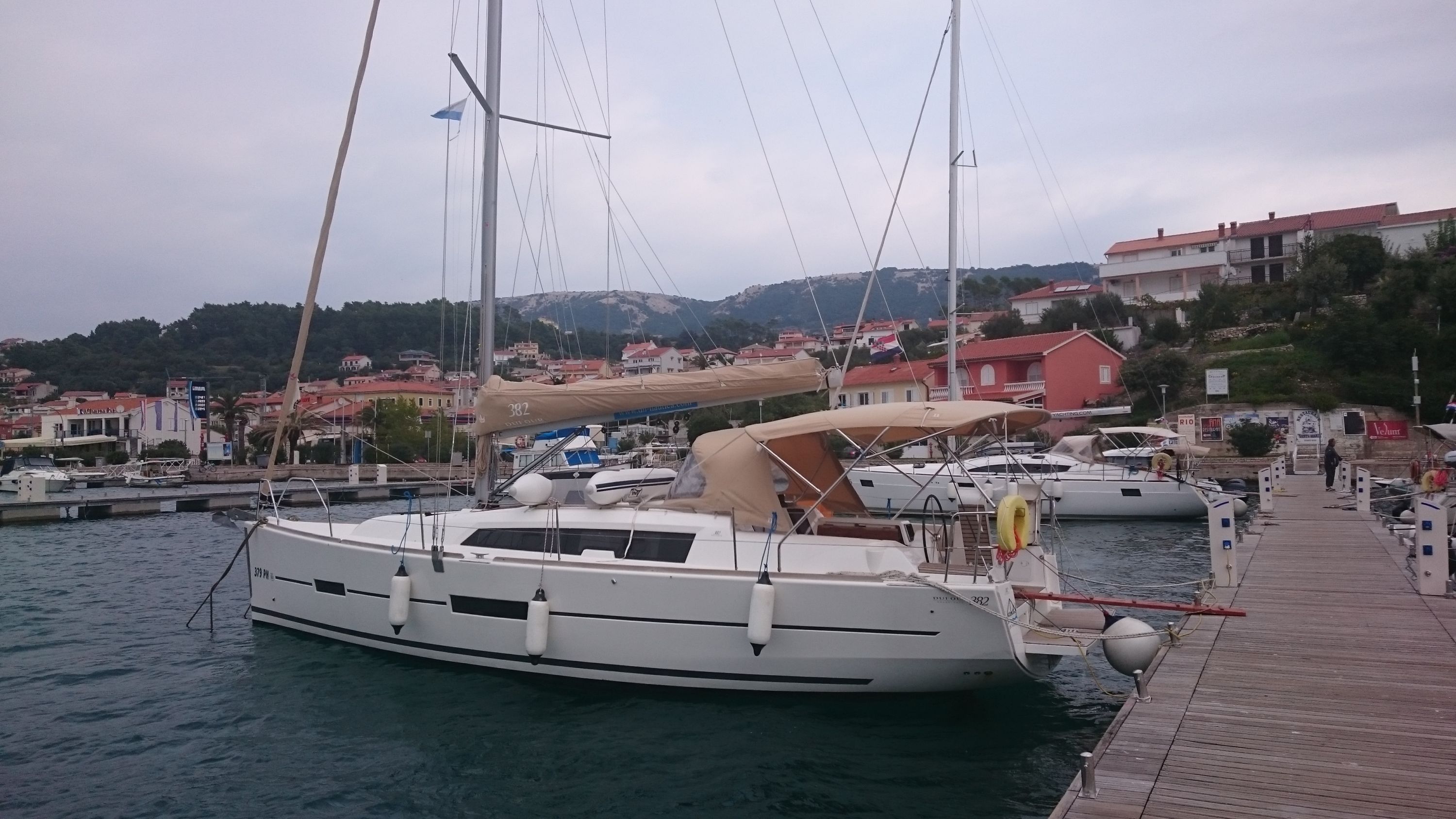 Bei der Dufour handelt sich im Grunde um ein sehr gute Yacht. Die Yacht hat eine sehr gute Raumaufteilung und für ihre Größe sehr viel Platz und segelt sehr gut. Leider ist nur eine Selbstwendefock verbaut und auch die Trimmmöglichkeiten am Großsegel sind sehr überschaubar, was den Spaß doch etwas in Grenzen hält. Schade ist auch dass die Ausstattung der Yacht konsequent auf billig getrimmt ist. Unsere Yacht war zum Charterzeitpunkt gerade 6 Monate im Dienst und sah schon sehr ramponiert aus, was der Qualität der verwendeten Materialien geschuldet ist. Die Polster waren schmudlig und konnten auf den Sitzflächen nicht fixiert werden. Im Bodenbereich gab es schon tiefe Dellen im Furnier. Einige Verschlüsse an den Schränken waren bereits defekt und die Handläufe waren auch nicht solide befestigt und gaben bereits bei leichten Zug nach.