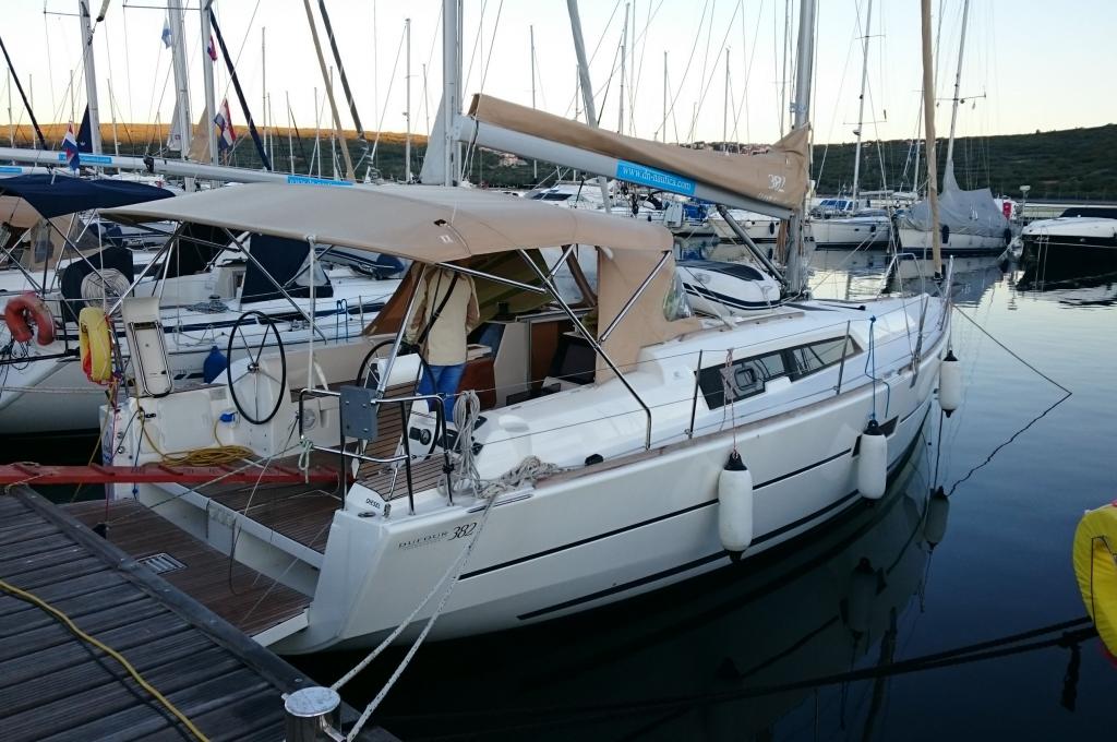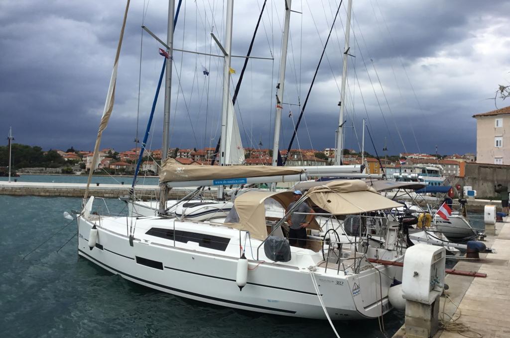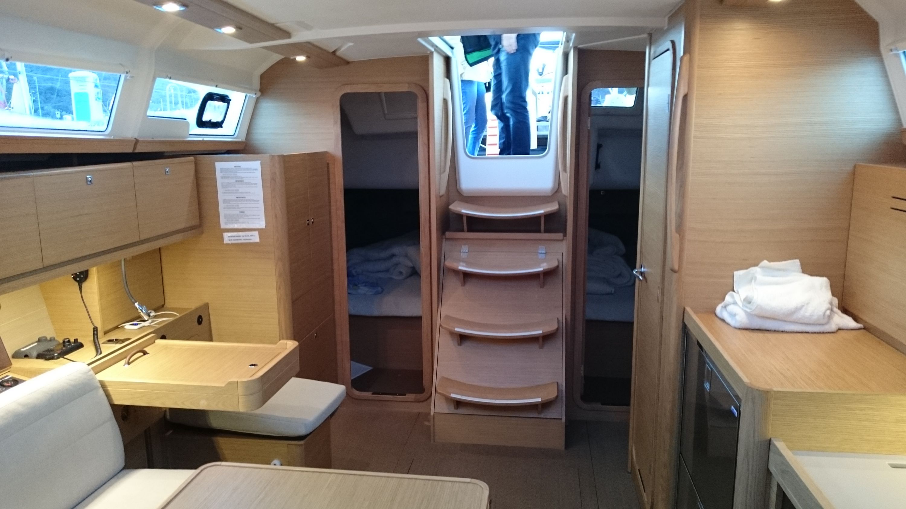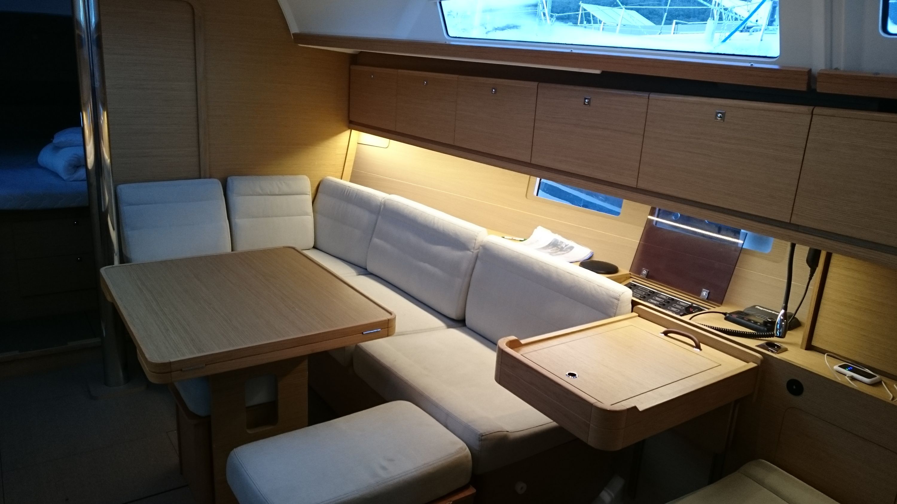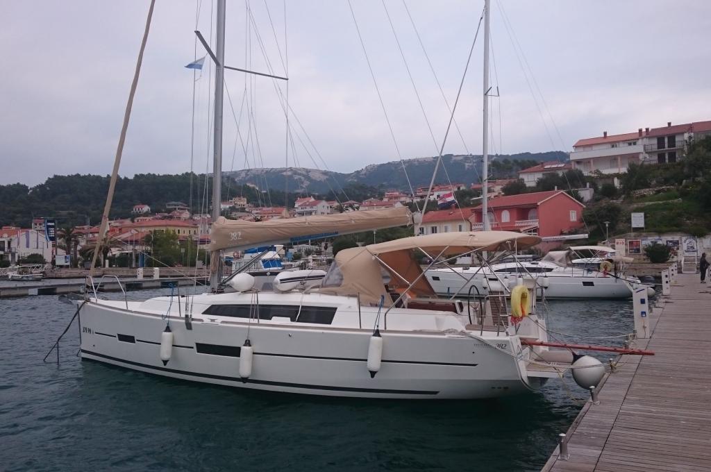 Bei der Dufour handelt sich im Grunde um ein sehr gute Yacht. Die Yacht hat eine sehr gute Raumaufteilung und für ihre Größe sehr viel Platz und segelt sehr gut. Leider ist nur eine Selbstwendefock verbaut und auch die Trimmmöglichkeiten am Großsegel sind sehr überschaubar, was den Spaß doch etwas in Grenzen hält. Schade ist auch dass die Ausstattung der Yacht konsequent auf billig getrimmt ist. Unsere Yacht war zum Charterzeitpunkt gerade 6 Monate im Dienst und sah schon sehr ramponiert aus, was der Qualität der verwendeten Materialien geschuldet ist. Die Polster waren schmudlig und konnten auf den Sitzflächen nicht fixiert werden. Im Bodenbereich gab es schon tiefe Dellen im Furnier. Einige Verschlüsse an den Schränken waren bereits defekt und die Handläufe waren auch nicht solide befestigt und gaben bereits bei leichten Zug nach.