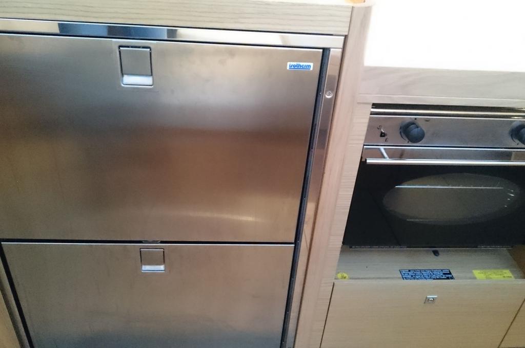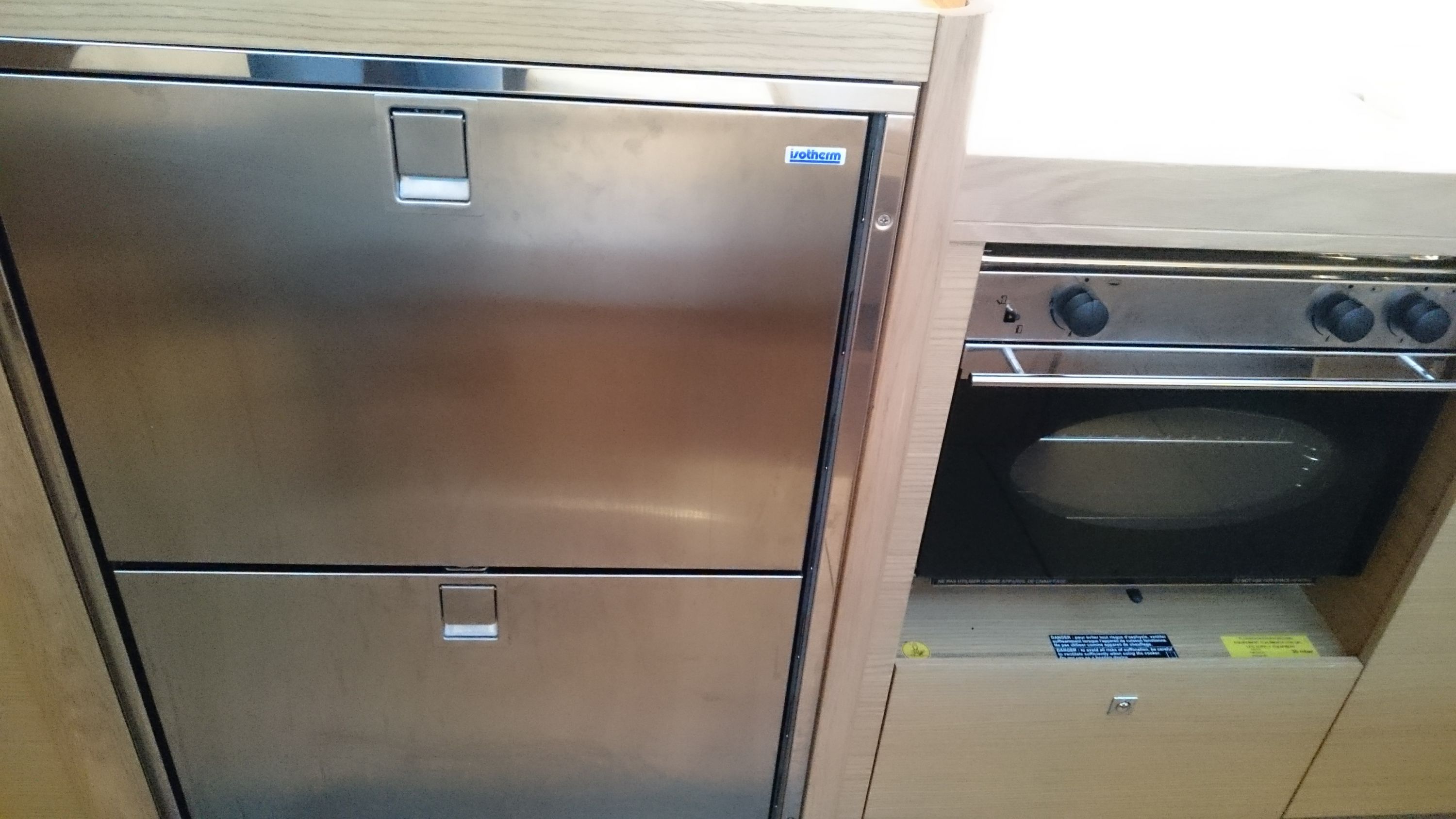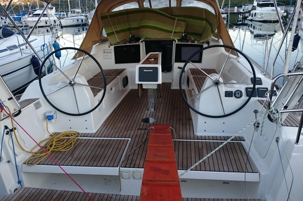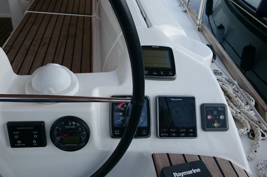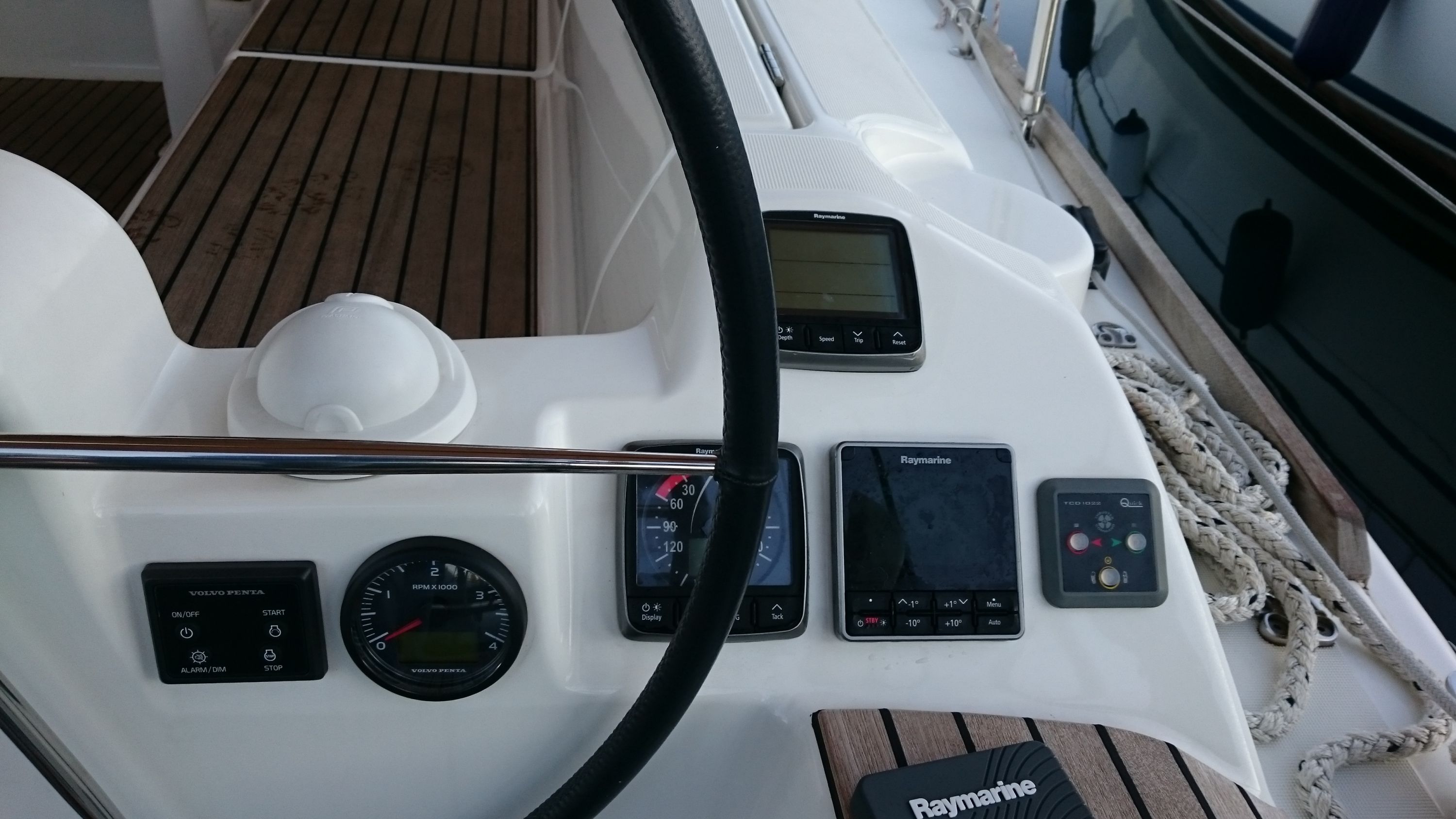 Die Genua ist zu klein dimensioniert. Bei einem Sturm hätte sie die richtige Größe, jedoch für Winde bis 20 kn zu klein. Die Ankerkette ist zwar farblich markiert, jedoch in anderer Reihenfolge als die Farbskala im Deckel des Ankerkastens. Die Kühlschränke sind super und dank der Solarzellen immer benutzbar.