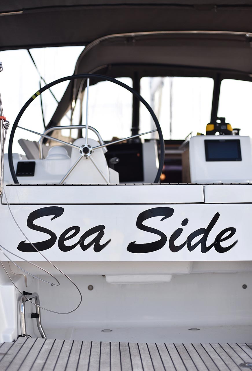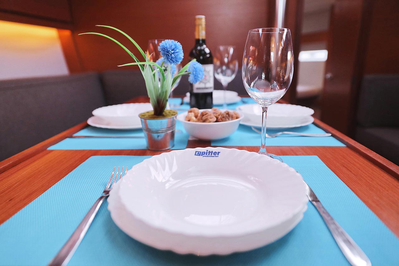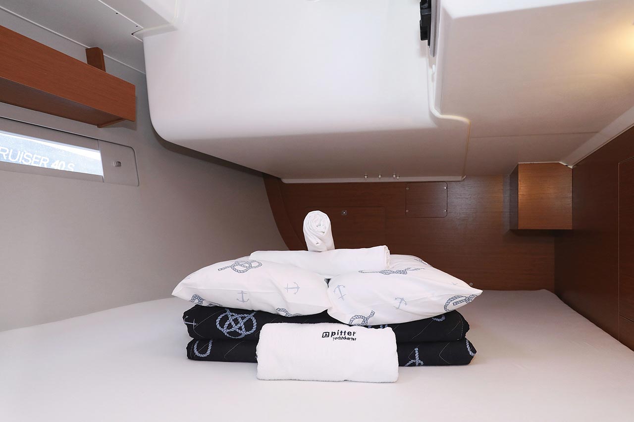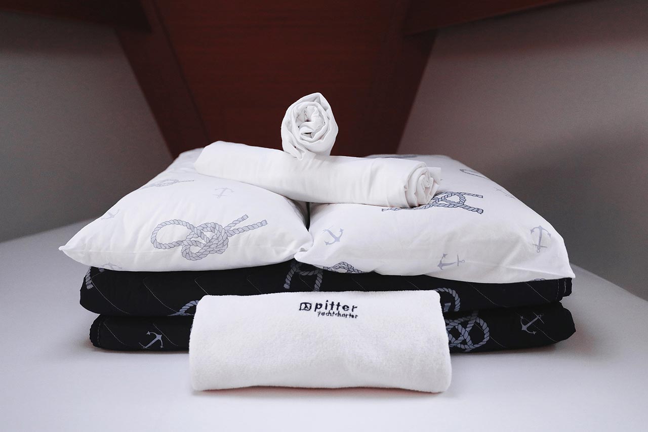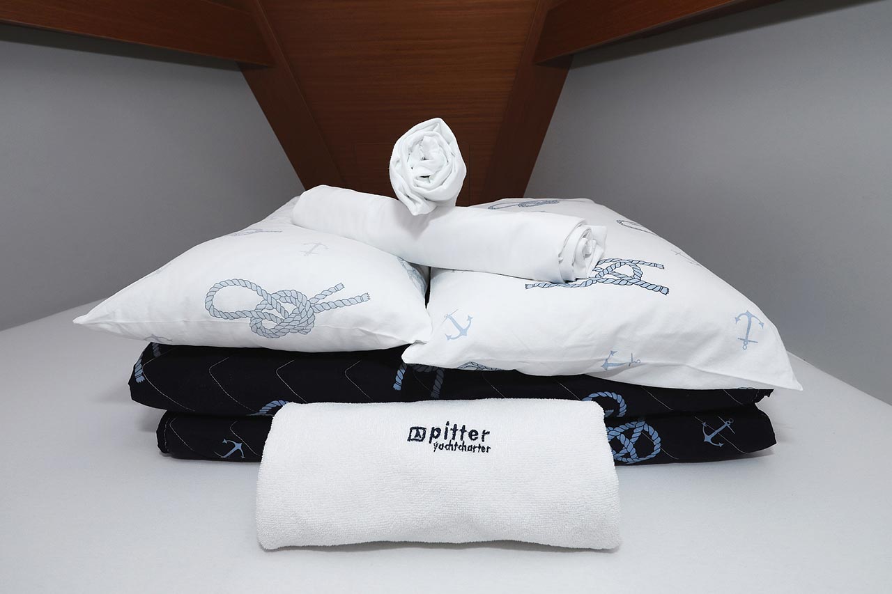 | Safety | Automatikwesten, Autopilot, Blitzboje, Bootsmannstuhl, Bordapotheke, Bordwerkzeug, Bugstrahlruder, Feuerlöscher, Lifebelts, Motor-Ersatzteile, Nebelhorn, Notsignale, Radarreflektor, Reparaturset für Beiboot, Rettungsinsel, Suchscheinwerfer, Taschenlampe, UKW-Funk, Zweitanker |