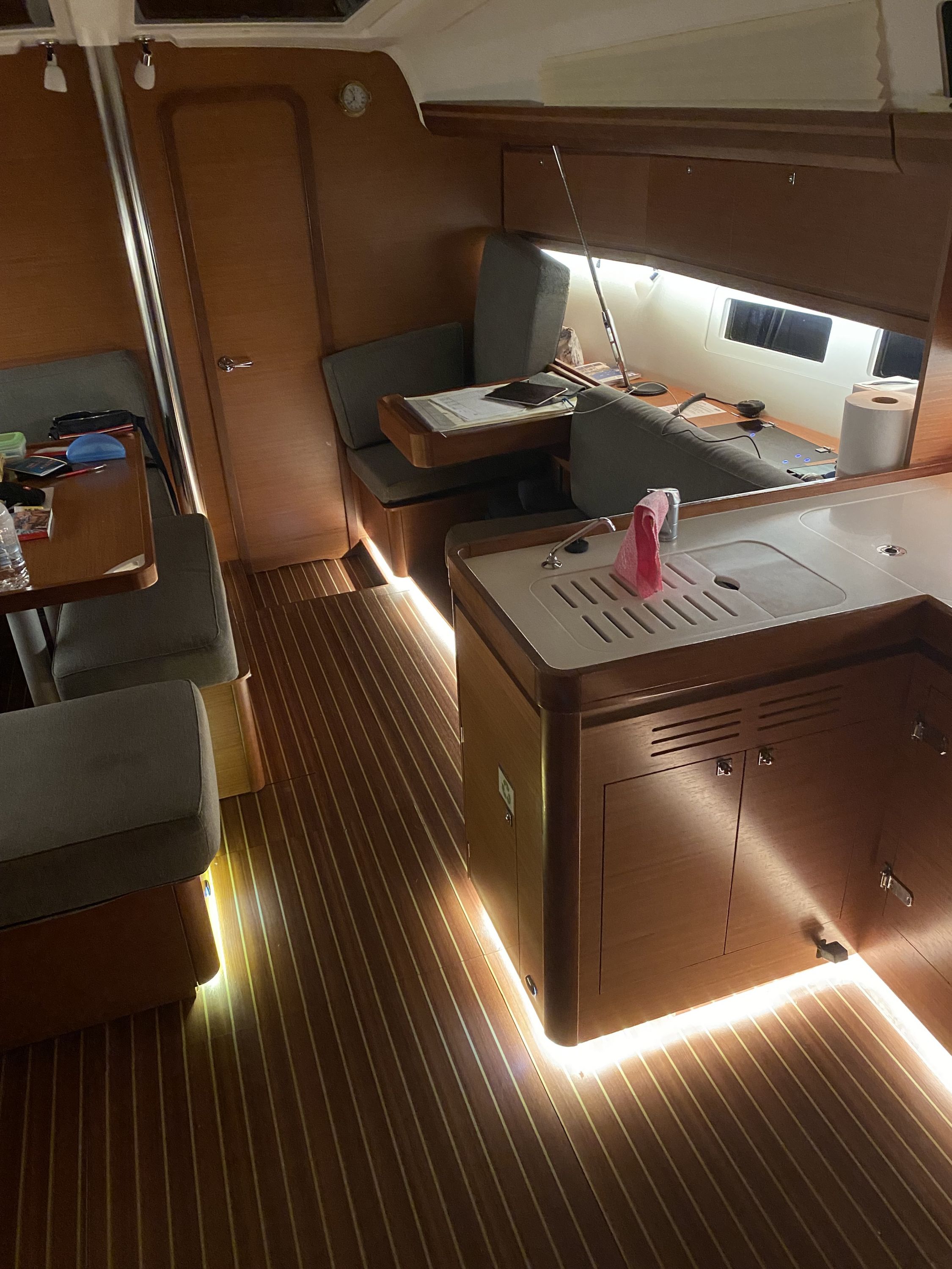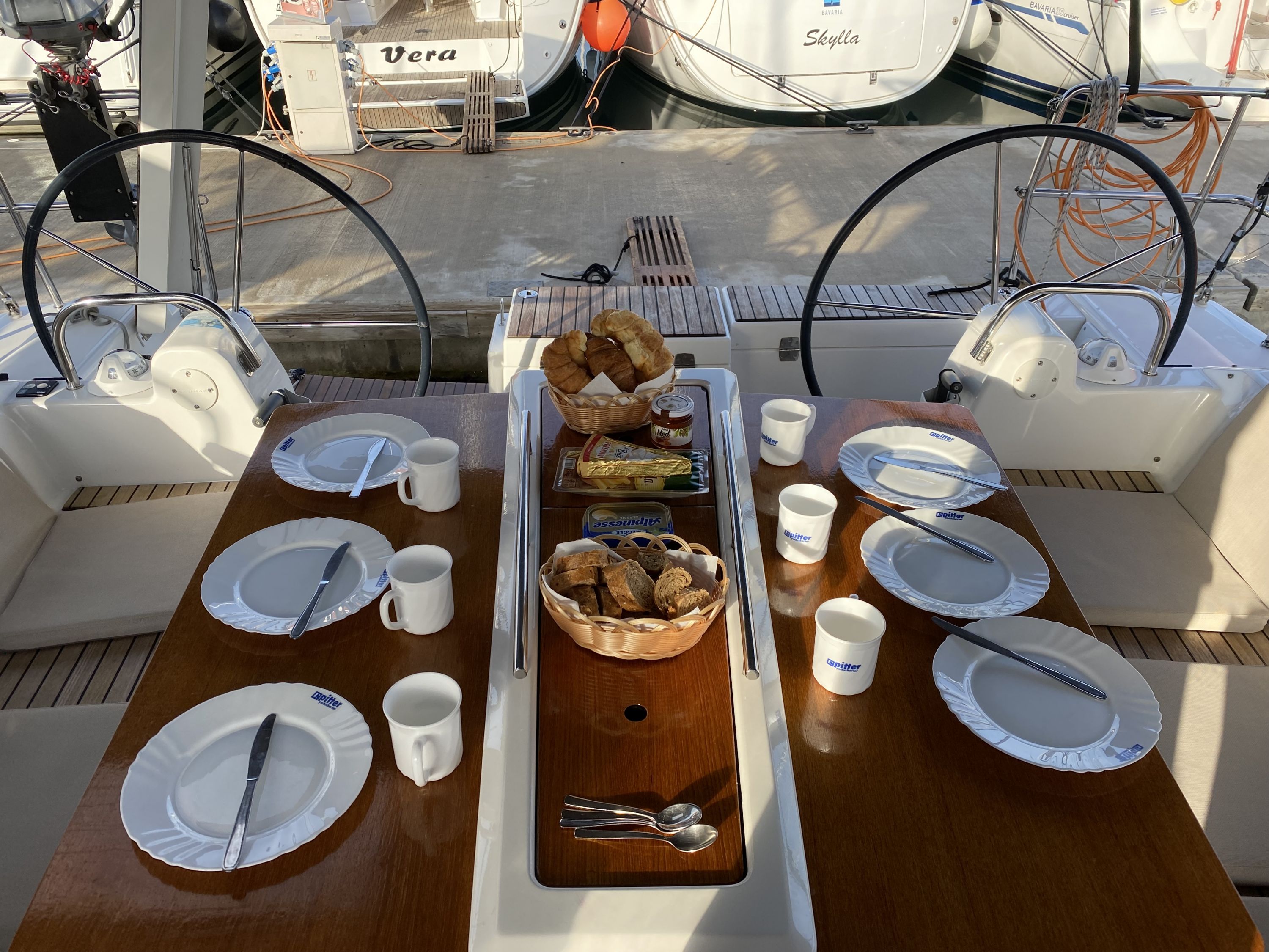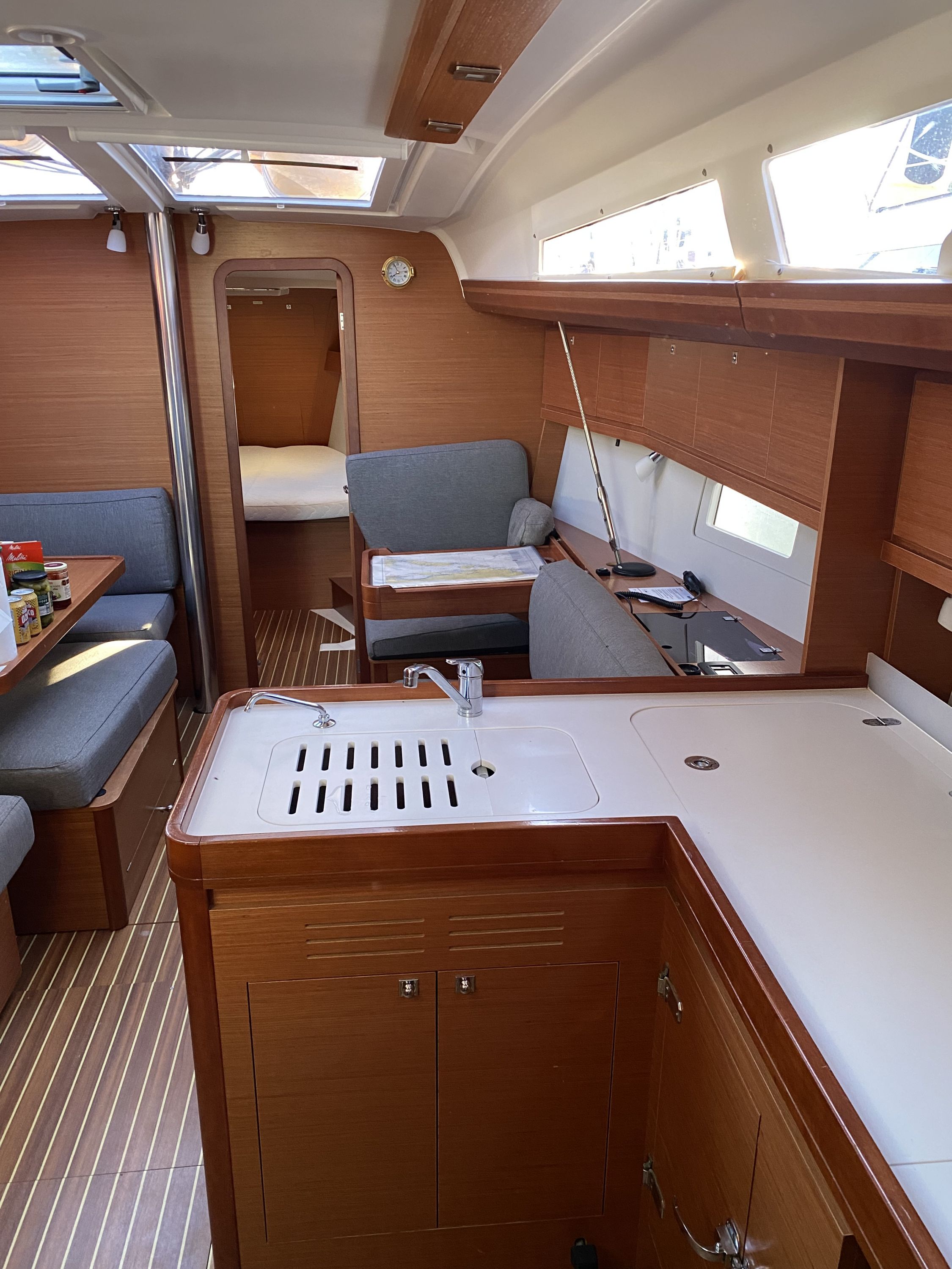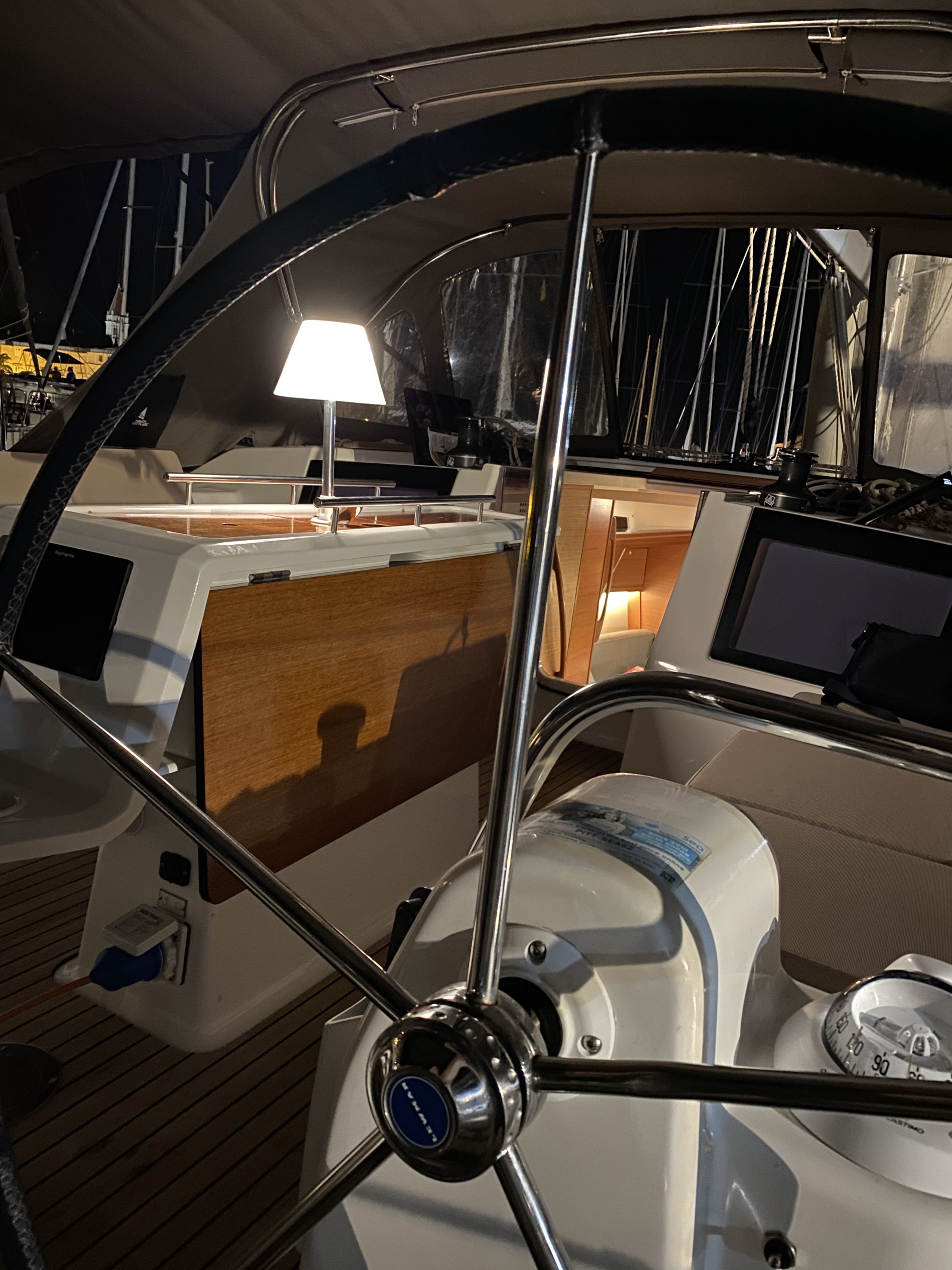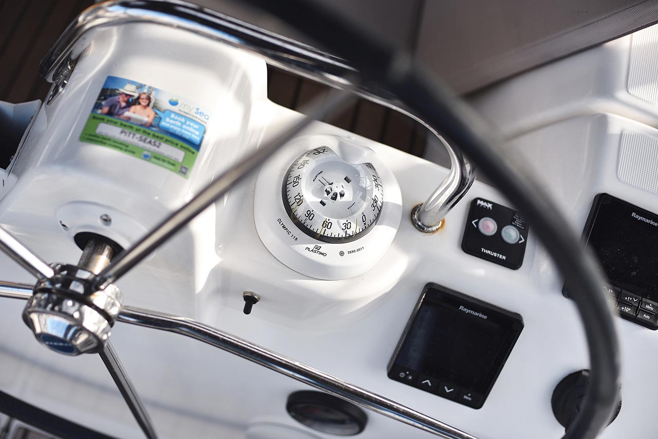 | Navigation | Barometer, Fernglas mit Peilkompass, GPS mit Kartenplotter im Cockpit, Hafenhandbücher, Navigationsbesteck, Tridata (Log, Echolot, Windm.) |