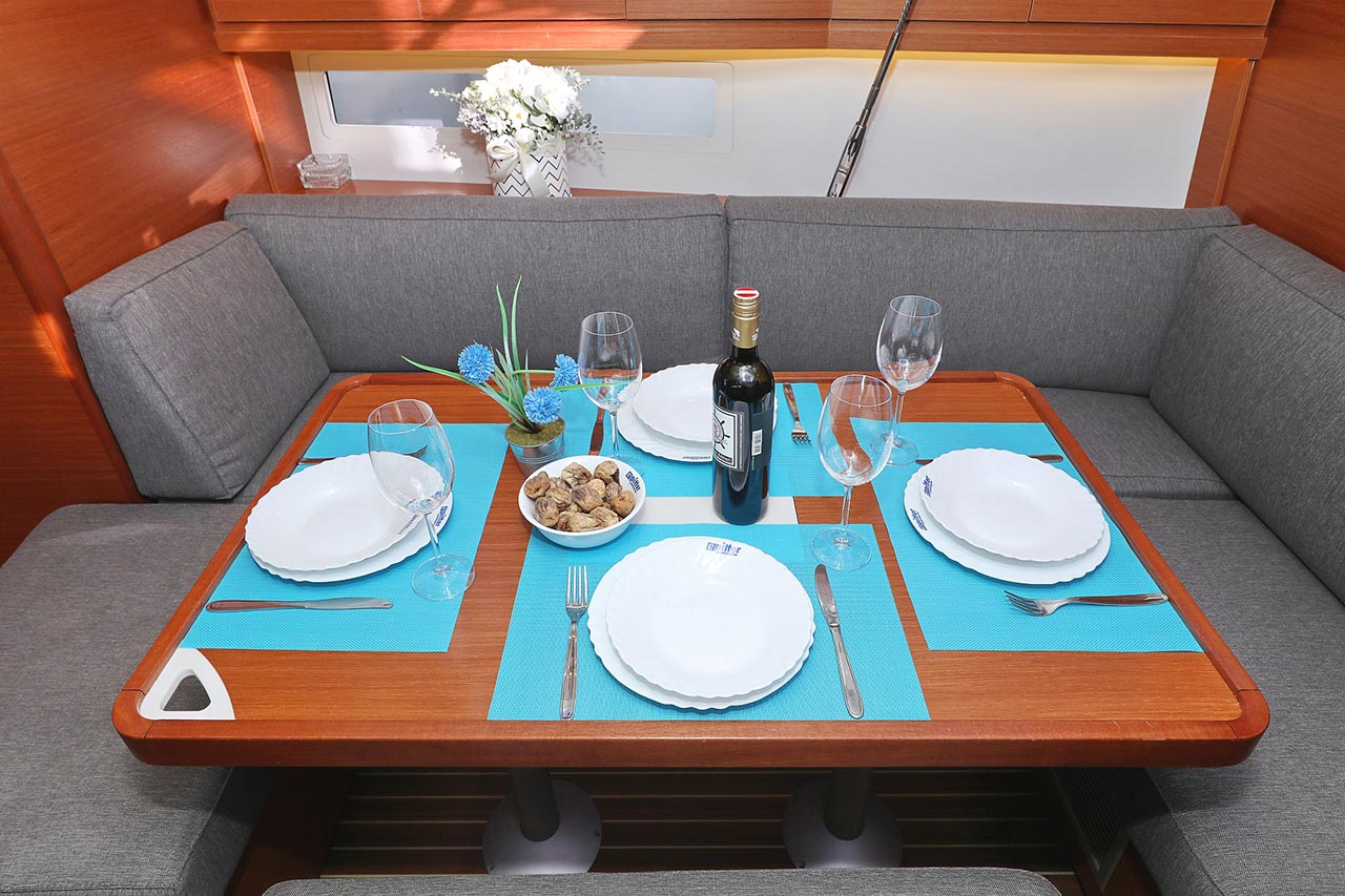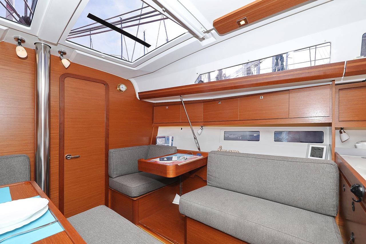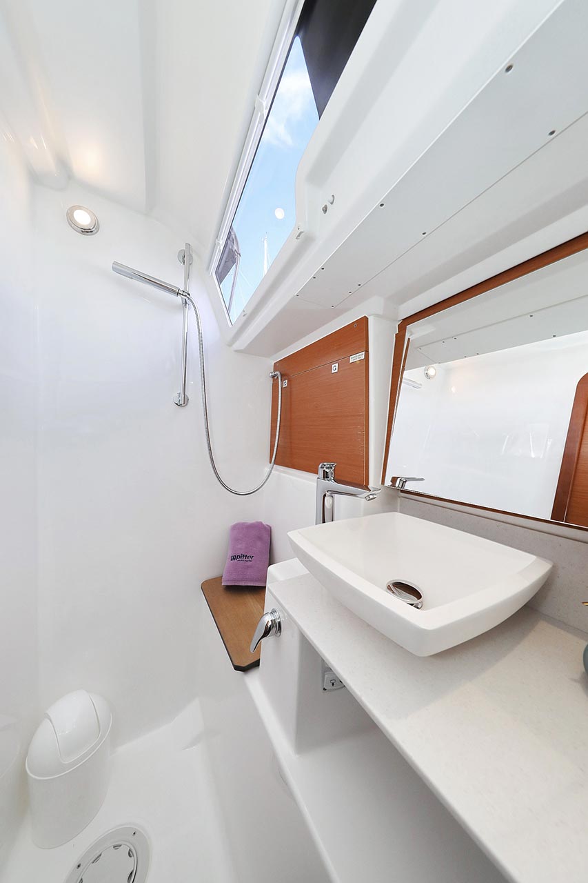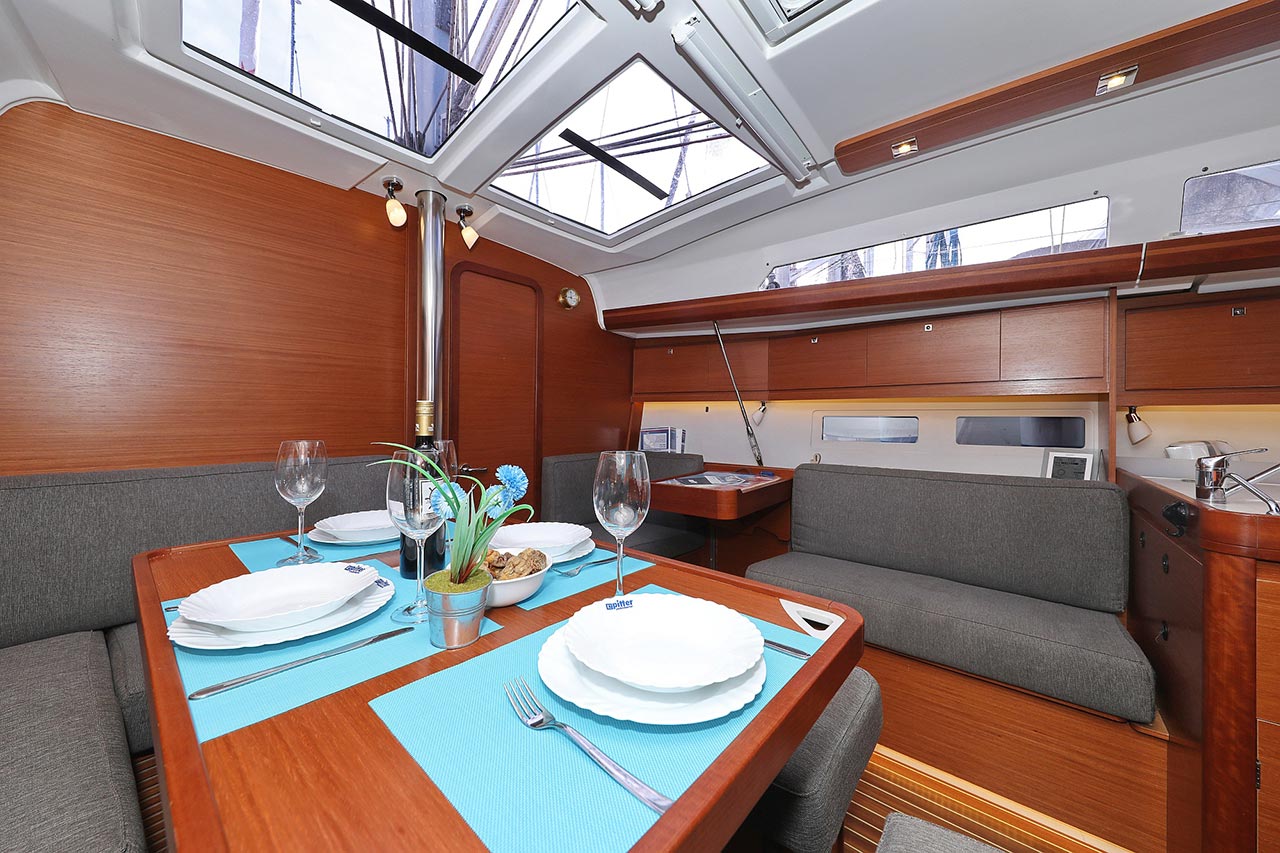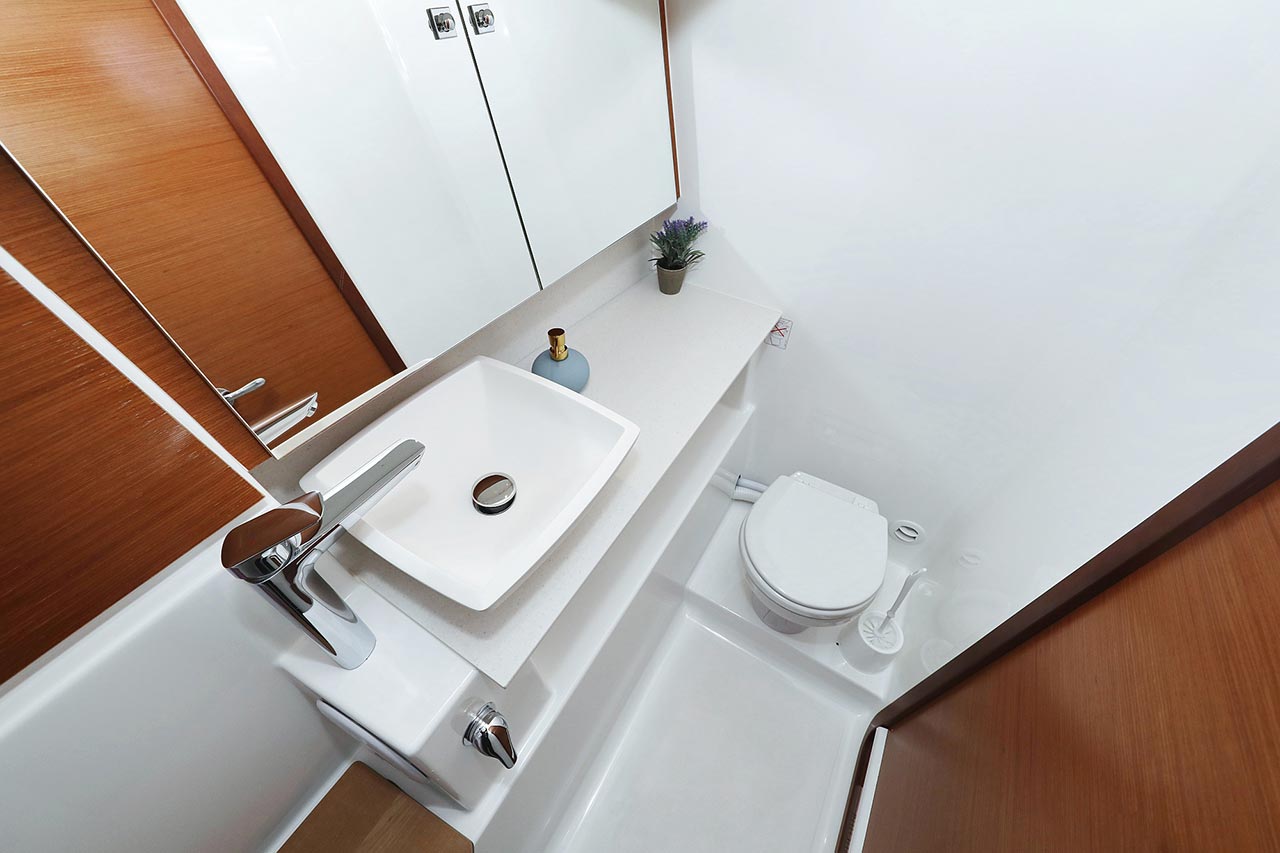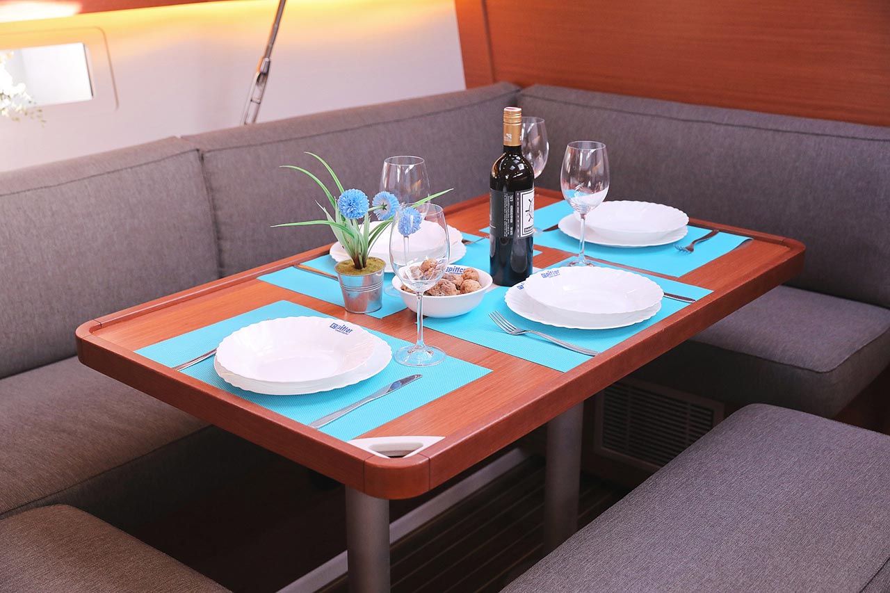 | Inside | 2. Kühlschrank, Borduhr, Dusche, Heizung, Inverter 12V/220V, Klimaanlage (Landstrom), Kühlschrank, Ladegerät, Luftpumpe für Beiboot, Pantryausstattung, Radio mit CD/MP3/USB, Salontisch absenkbar, Warmwasser, WC (elektr.) |