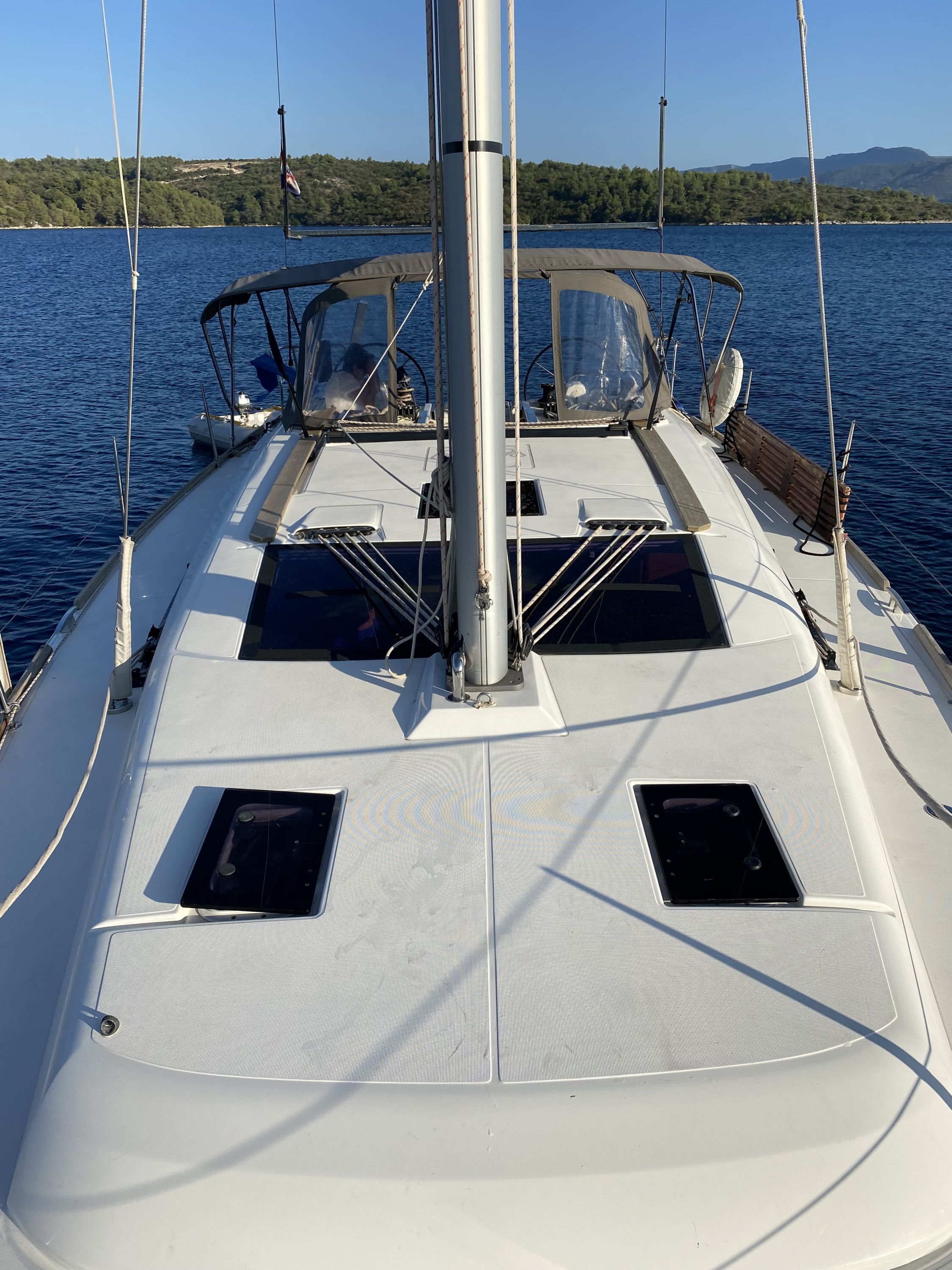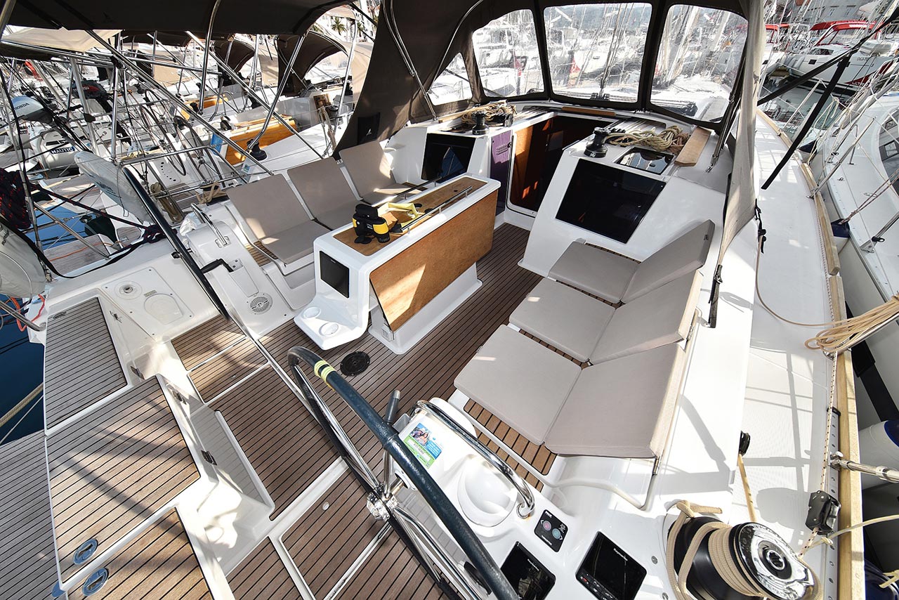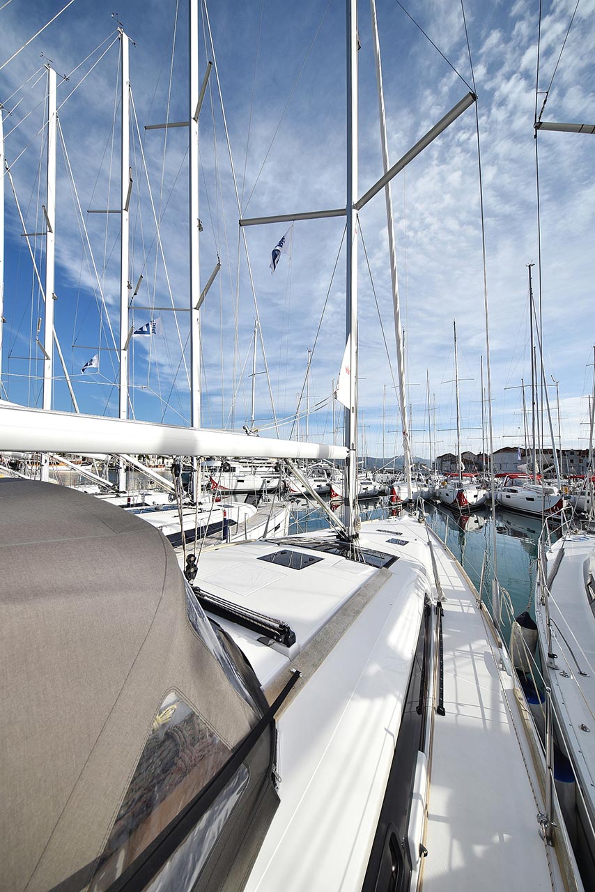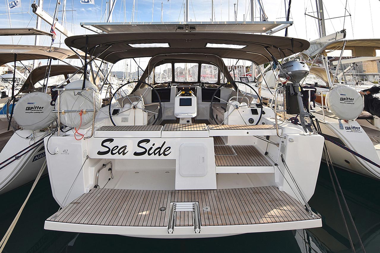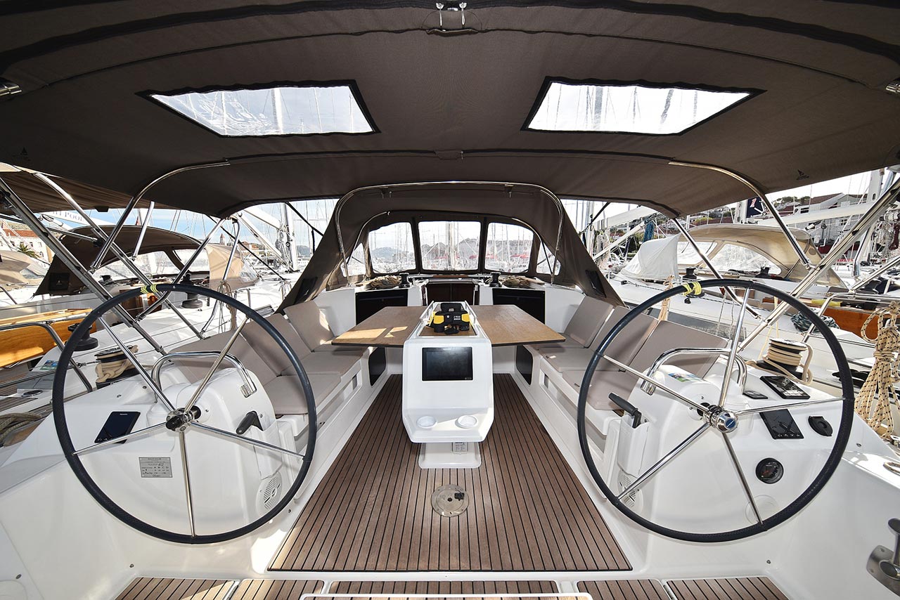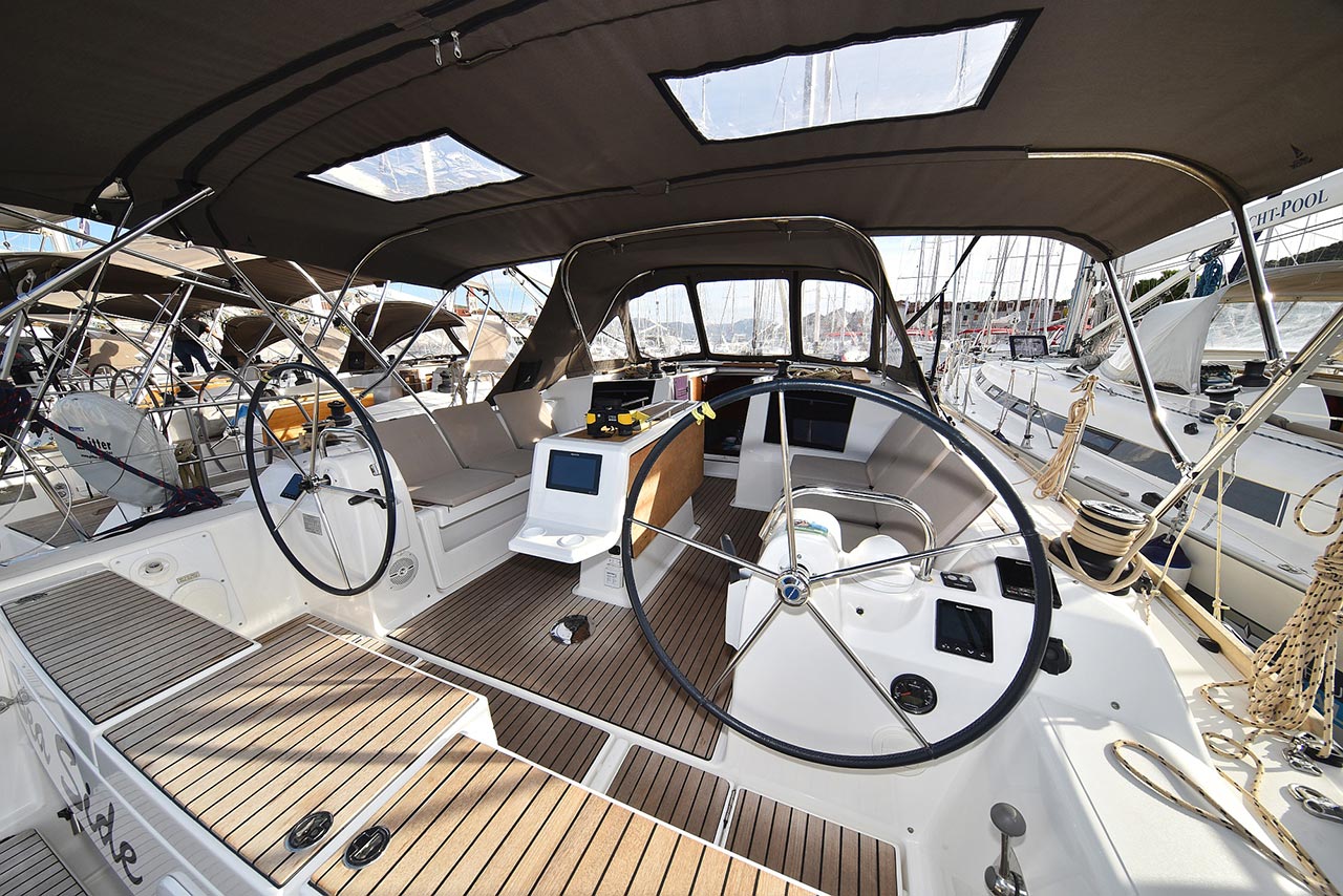 | Outside | 220 V-Landanschluss, Anker mit Kette, Ankerwinsch, Badeplattform, Biminitop, Bootshaken, Cockpitdusche, Cockpitlautsprecher, Cockpitpolster, Cockpittisch, Dieselkanister , elektr. Ankerwinsch, Fender, Festmacherleinen, Gangway, Kugelfender, Kunststoff-Eimer (Pütz), Solaranlage, Sprayhood, Teak im Cockpit, Wantenschneider, Wasserkanister , Wasserschlauch |