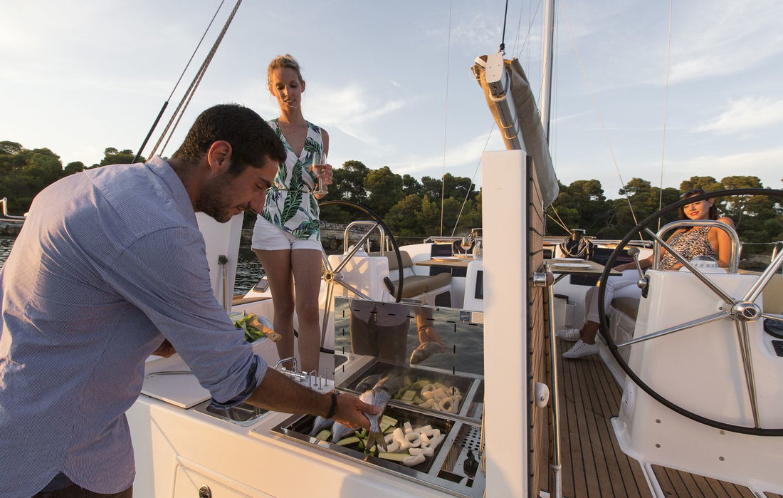 | Outside | 220 V-Landanschluss, Badeplattform, Biminitop, Cockpitdusche, Cockpitkühlschrank, elektr. Ankerwinsch, Fender, Festmacherleinen, Gangway, Grill, Kugelfender, Solaranlage, Sprayhood, Teak im Cockpit |