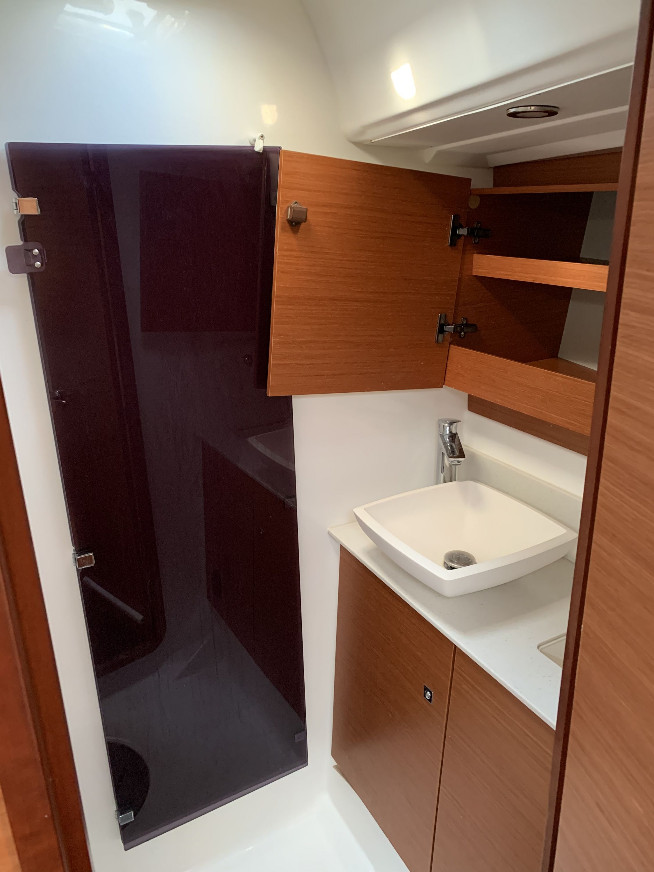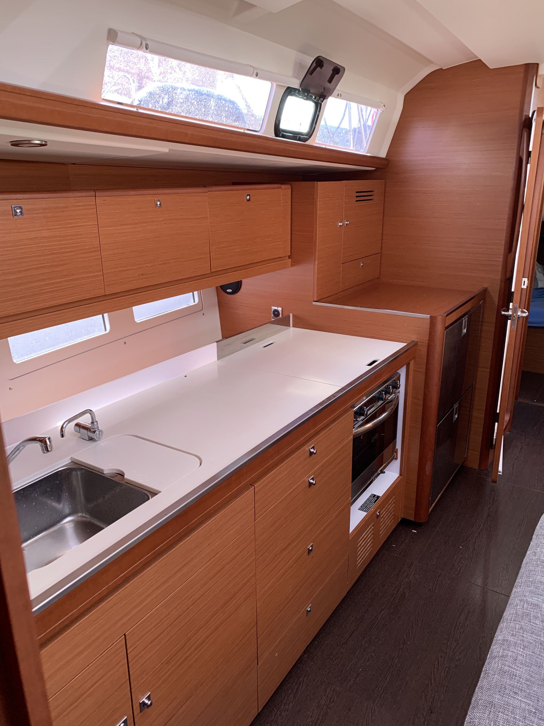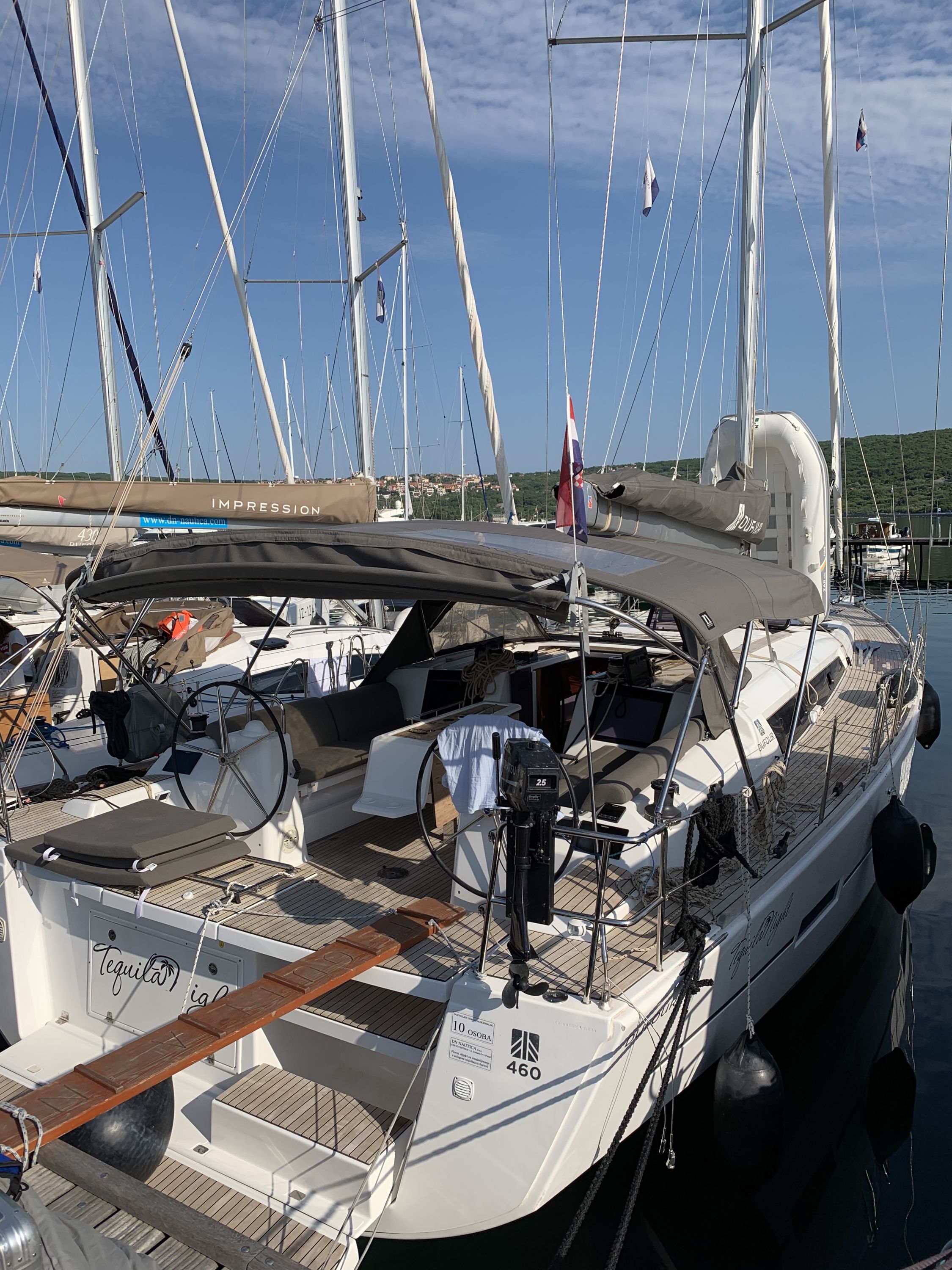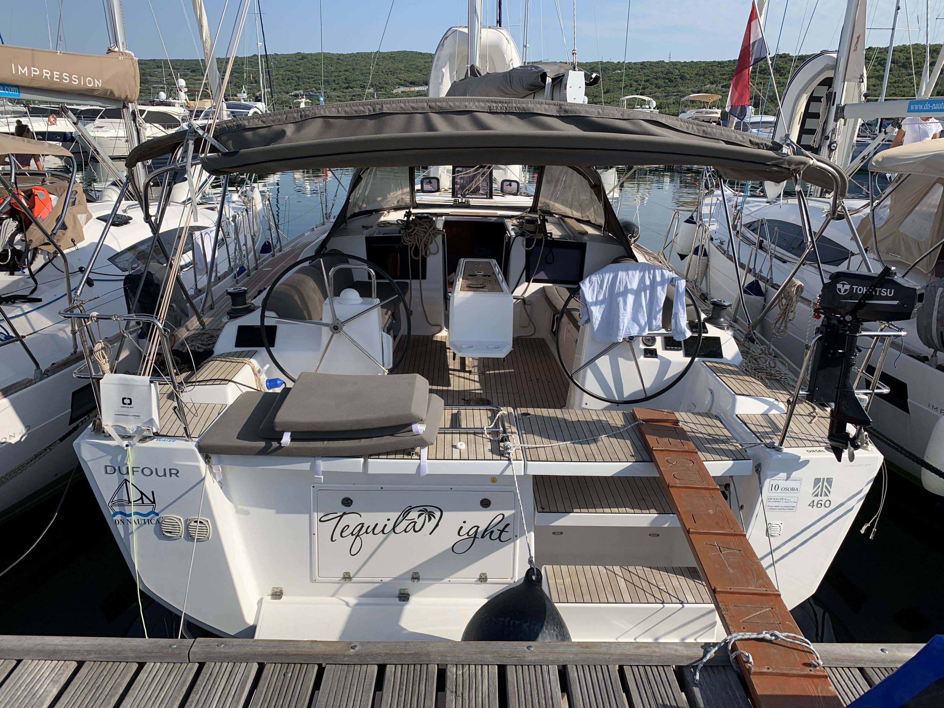 | Outside | 220 V-Landanschluss, Badeplattform, Biminitop, Cockpitdusche, Cockpitkühlschrank, Cockpitpolster, elektr. Ankerwinsch, Fender, Festmacherleinen, Gangway, Grill, Kugelfender, Sprayhood, Teak im Cockpit, Teakdeck |