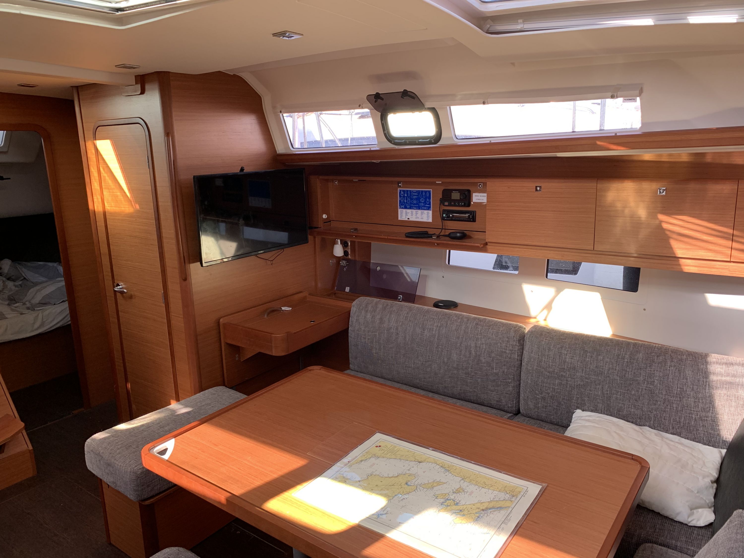 | Navigation | Echolot, Fernglas, GPS mit Kartenplotter im Cockpit, Hafenhandbücher, Navigationsbesteck, Seekarten, Sumlog, Windmesser |