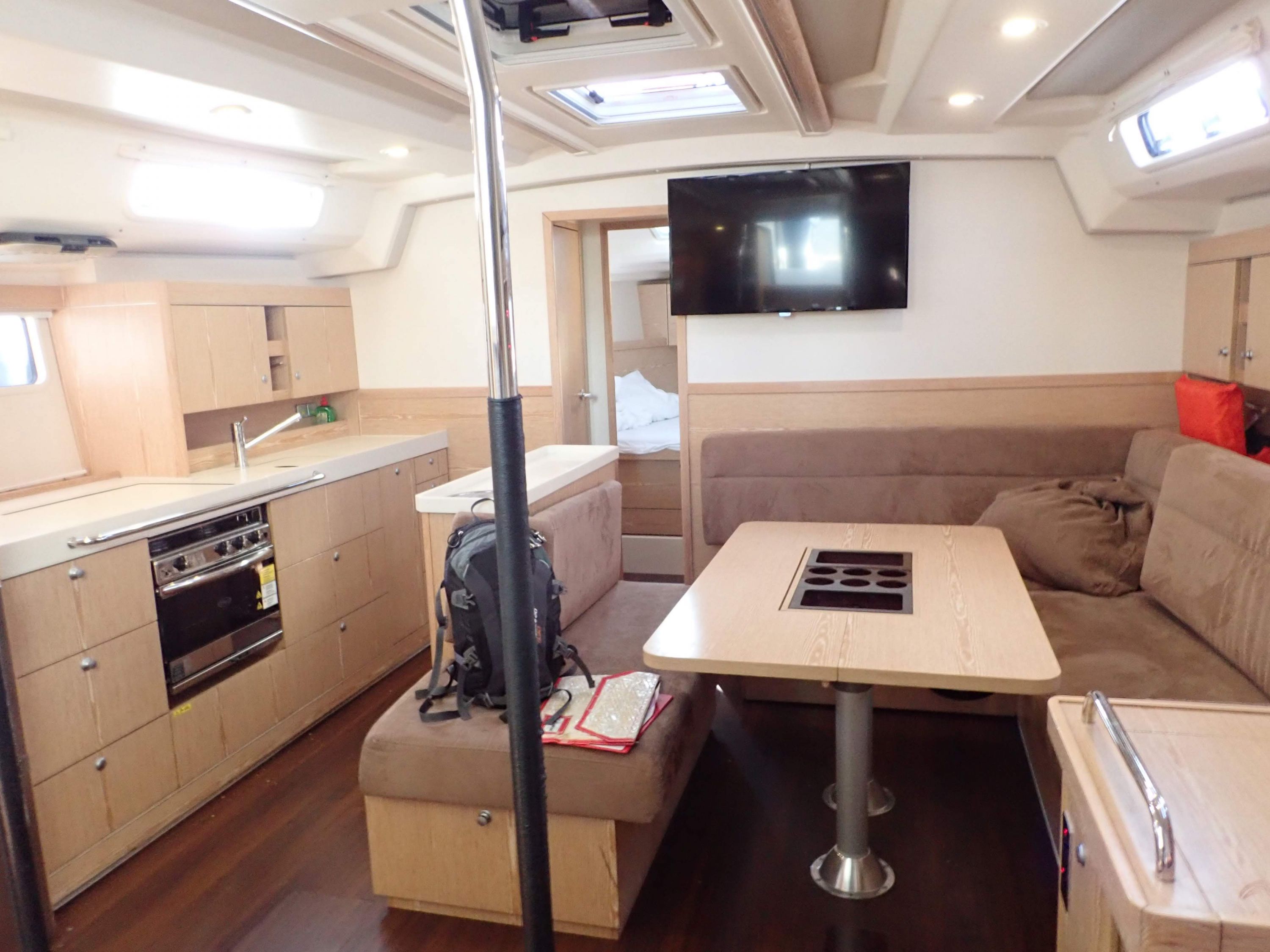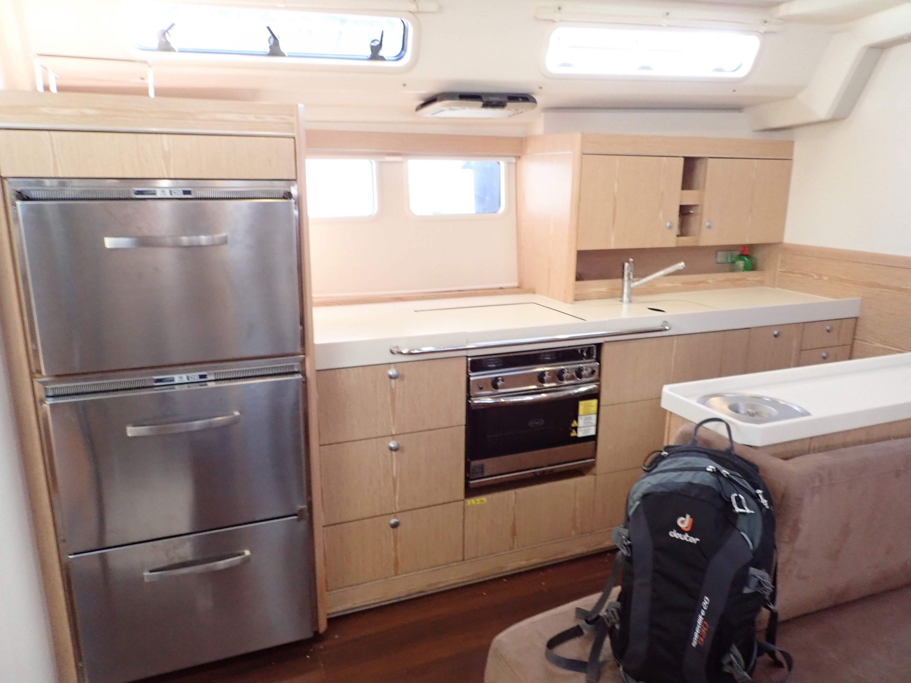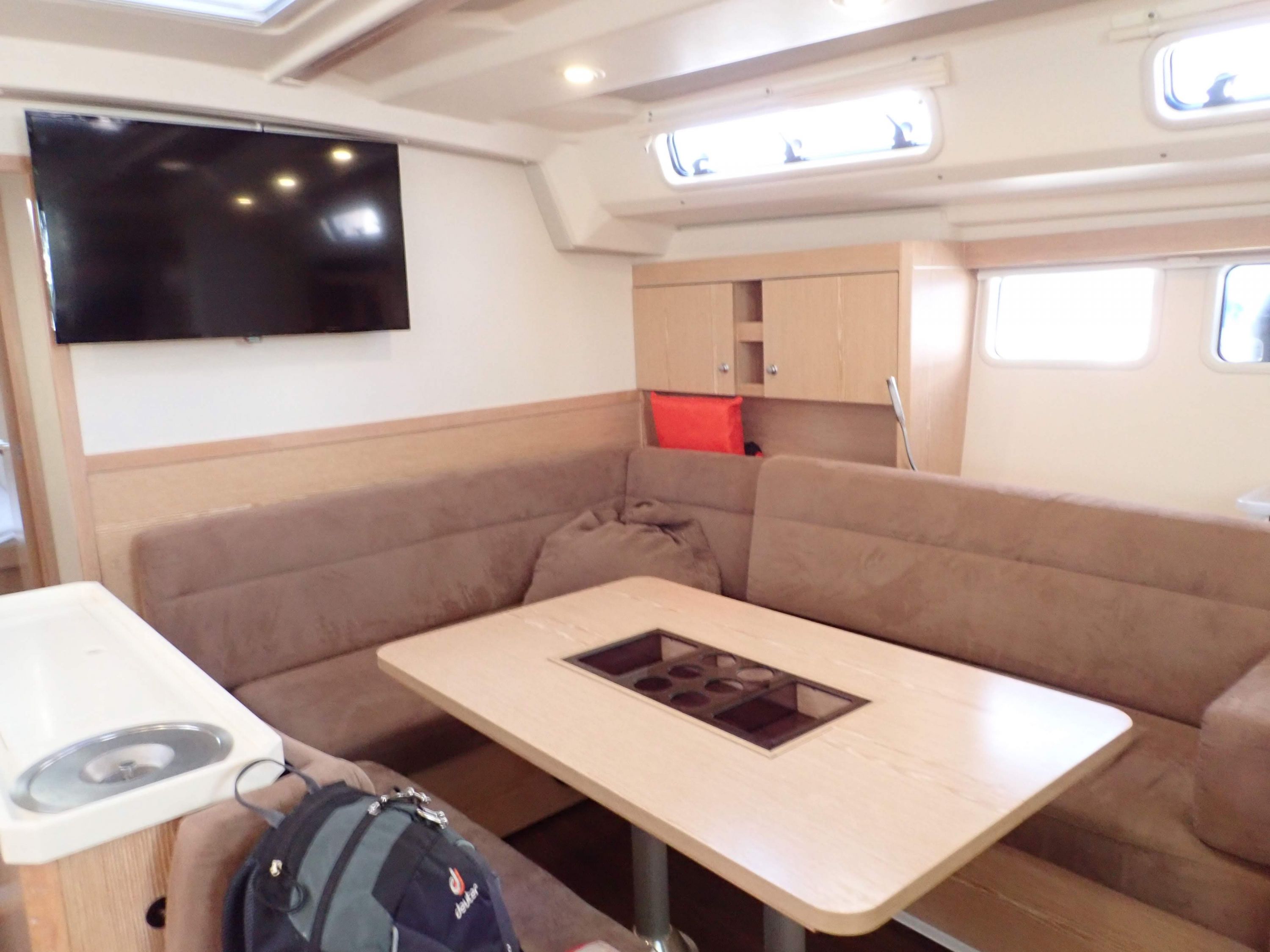 | Outside | Anker mit Kette, Badeplattform, Biminitop, Cockpitdusche warm/kalt, Cockpitkühlschrank, Cockpitlautsprecher, Cockpitpolster, Cockpittisch, Deckpolster, elektr. Ankerwinsch, Fallwinschen, Gangway, Genuawinschen, Sprayhood |