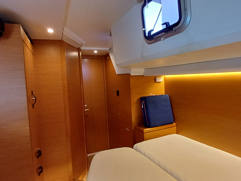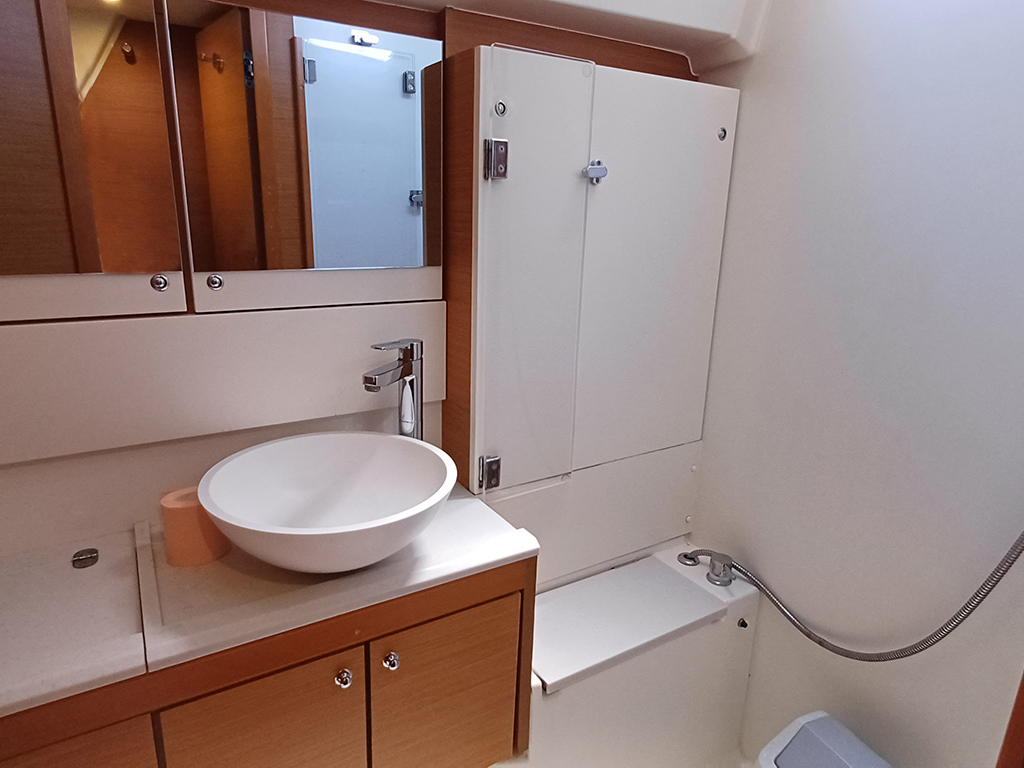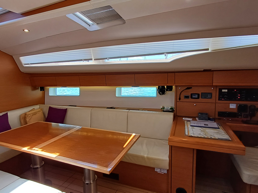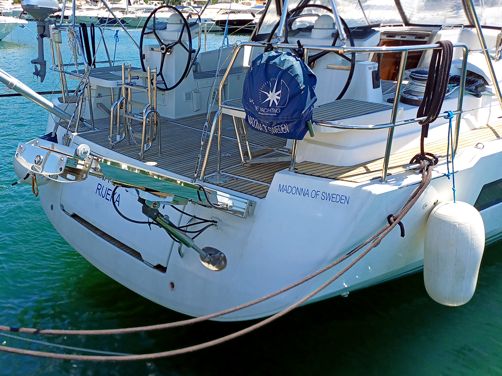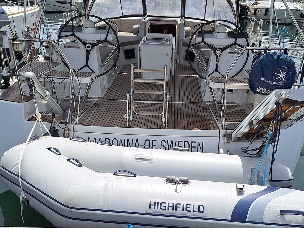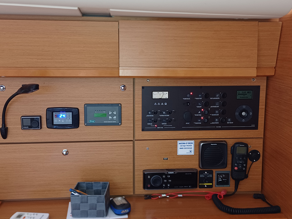 Autopilot, Bootsmannstuhl, Bordapotheke, Bordwerkzeug, Bugstrahlruder, elektr. Bilgepumpe, Feststoffschwimmwesten, Feueraxt, Feuerlöscher, Flaggen, Handbilgepumpe, Lifebelts, Navigationslichter, Nebelhorn, Notpinne, Notsignale, Radarreflektor, Rettungsinsel, Rettungskragen, Taschenlampe, UKW-Funk m. DSC, Zweitanker |