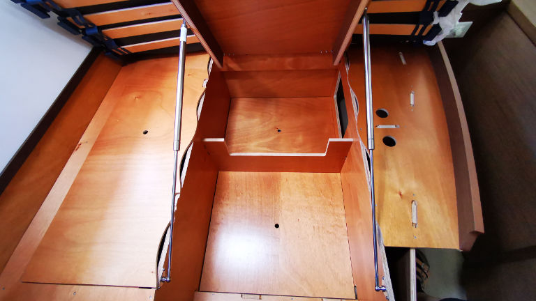 | Inside | 220V Steckdosen, Backofen, Druckwasser, Fäkalientank, Gasherd, Geschirr, Heizung, Inverter 12V/220V, Kaffeemaschine, Kühlbox, Kühlschrank, Ladegerät, Pantryausstattung, Radio mit Bluetooth und AUX-In, Safe für Wertsachen, Salontisch absenkbar, Spülbecken, TV + DVD, USB Steckdosen in den Kabinen, Warmwasser, WC (elektr.) |