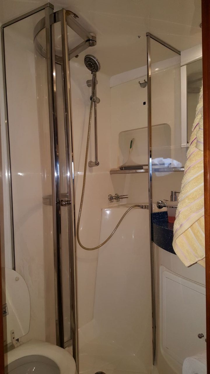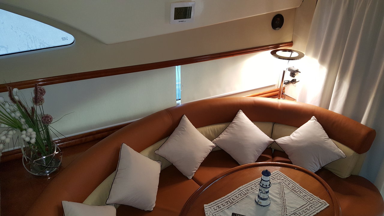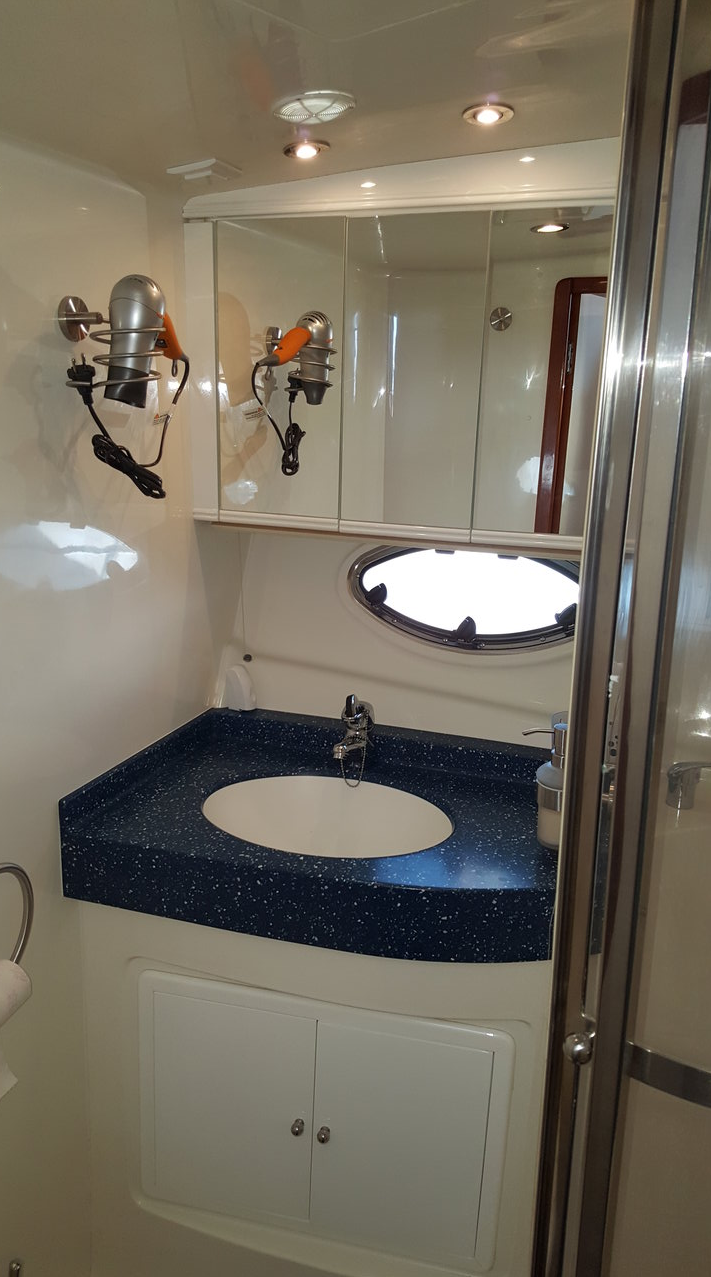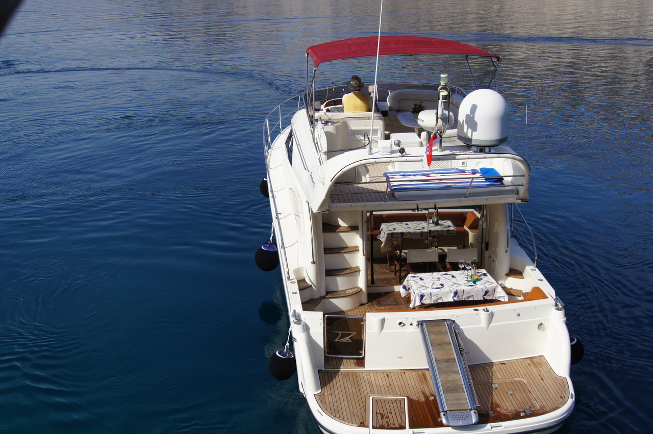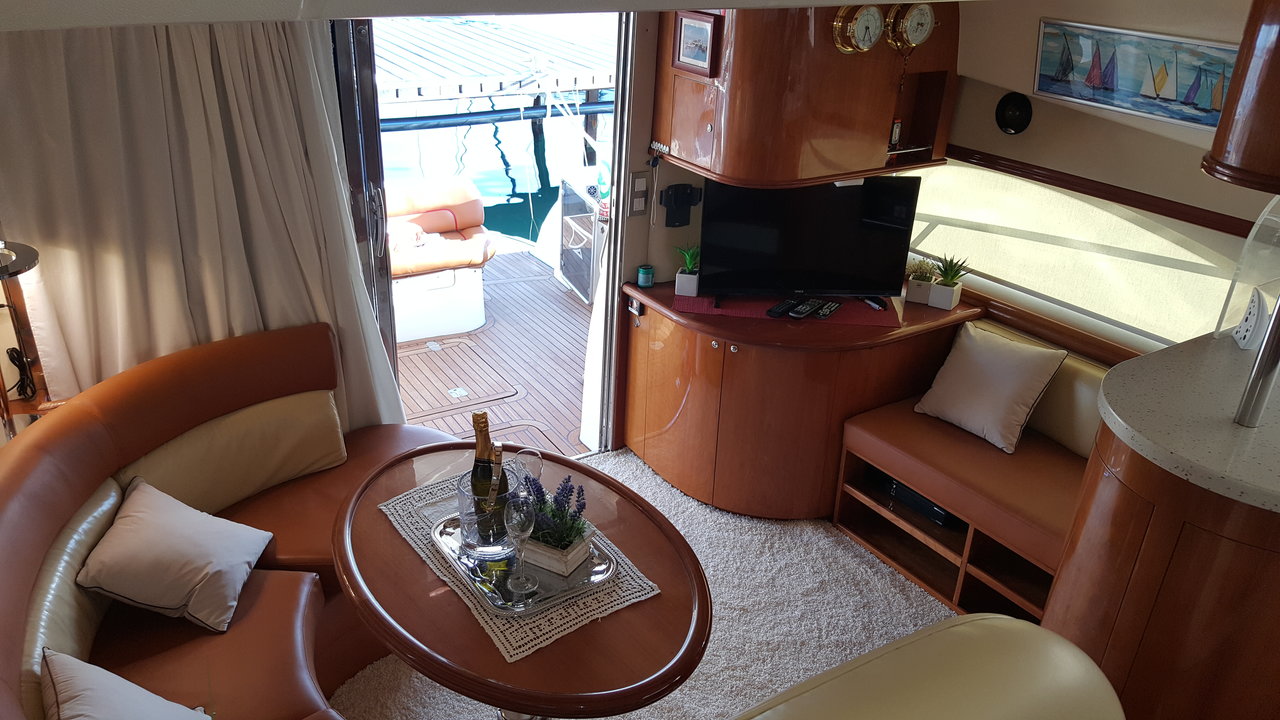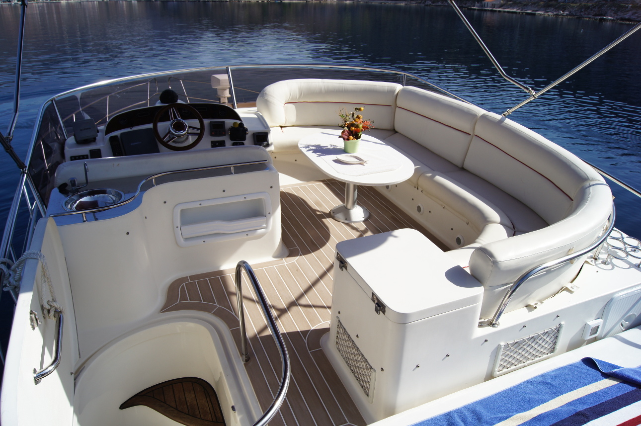 | Outside | 220 V-Landanschluss, Badeleiter, Badeplattform, Cockpitdusche, Cockpitlautsprecher, Cockpittisch, Deckpolster, elektr. Ankerwinsch, Flybridge mit Bimini und Kühlschrank, hydraul. Gangway, Sonnensegel, Teak im Cockpit, Teakdeck |