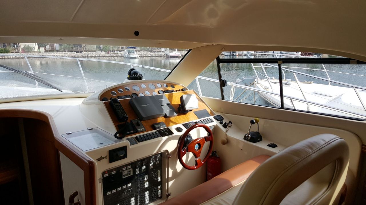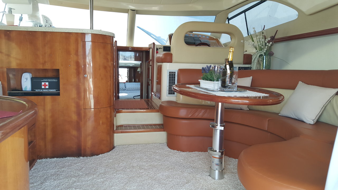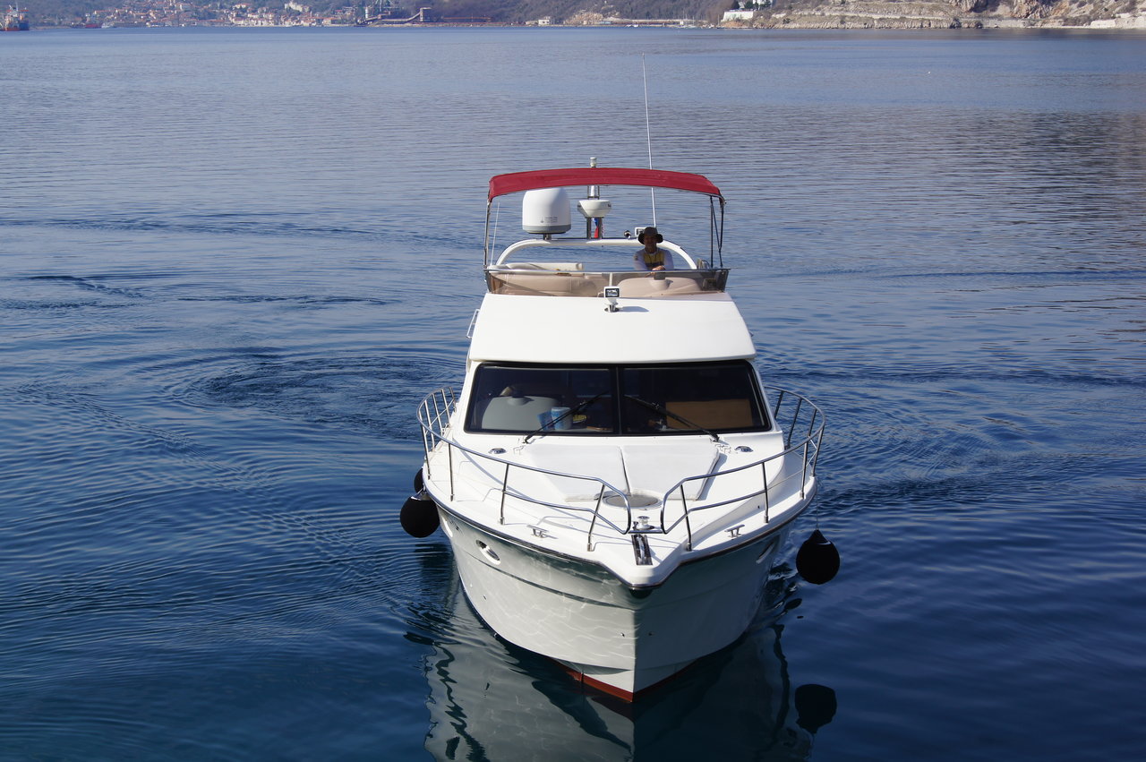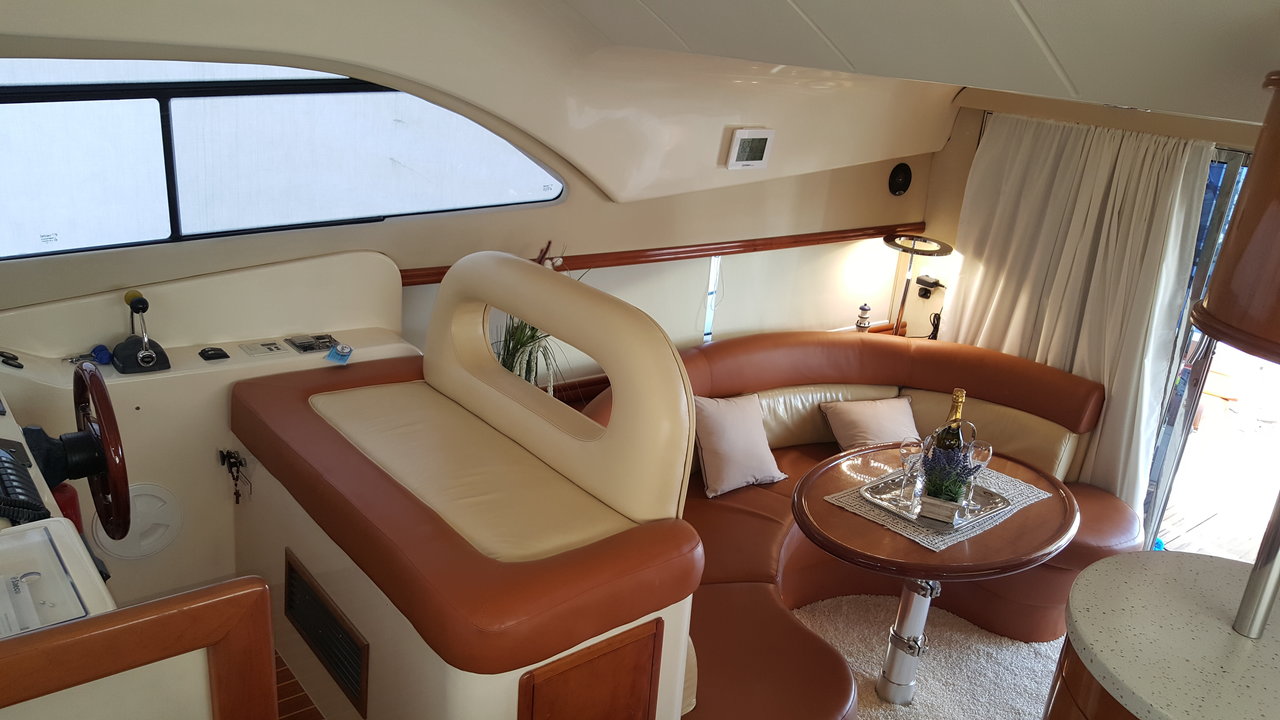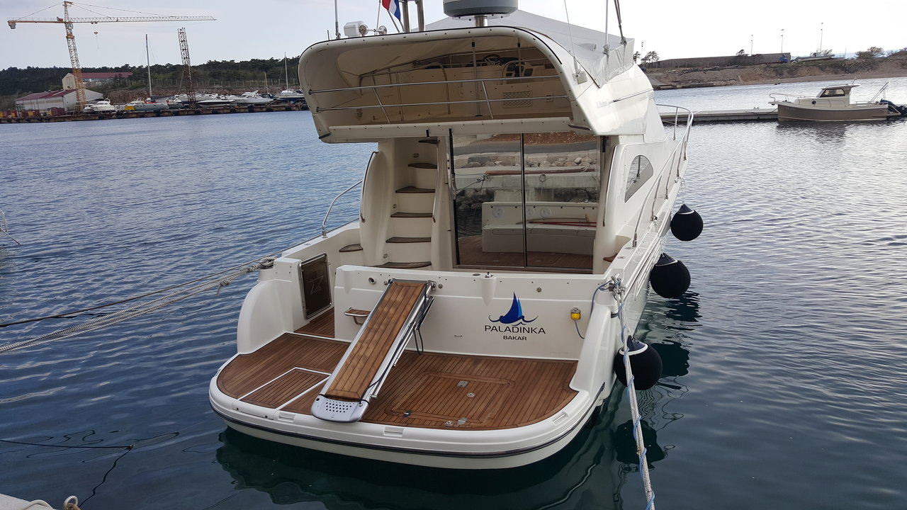 | Outside | 220 V-Landanschluss, Badeleiter, Badeplattform, Cockpitdusche, Cockpitlautsprecher, Cockpittisch, Deckpolster, elektr. Ankerwinsch, Flybridge mit Bimini und Kühlschrank, hydraul. Gangway, Sonnensegel, Teak im Cockpit, Teakdeck |