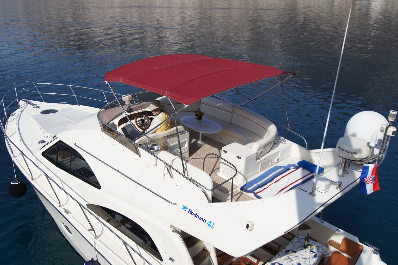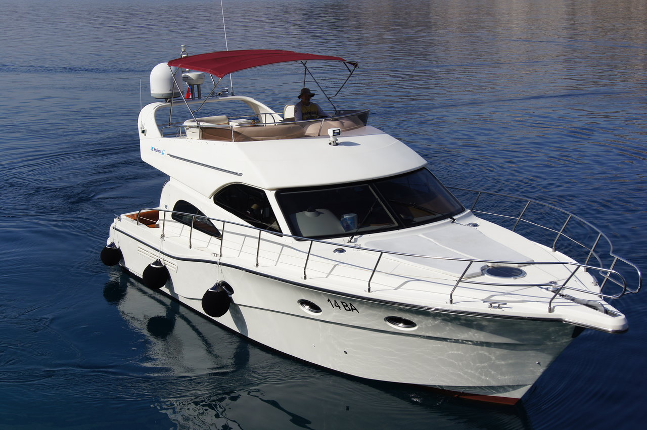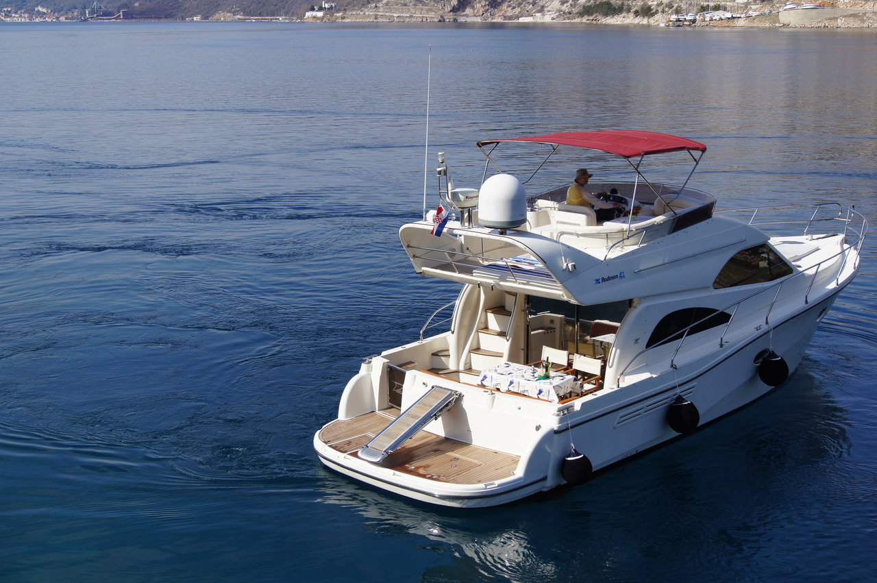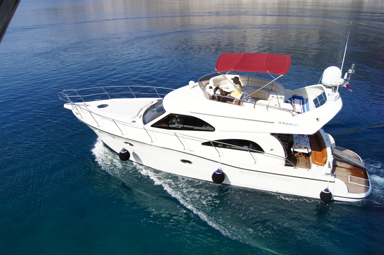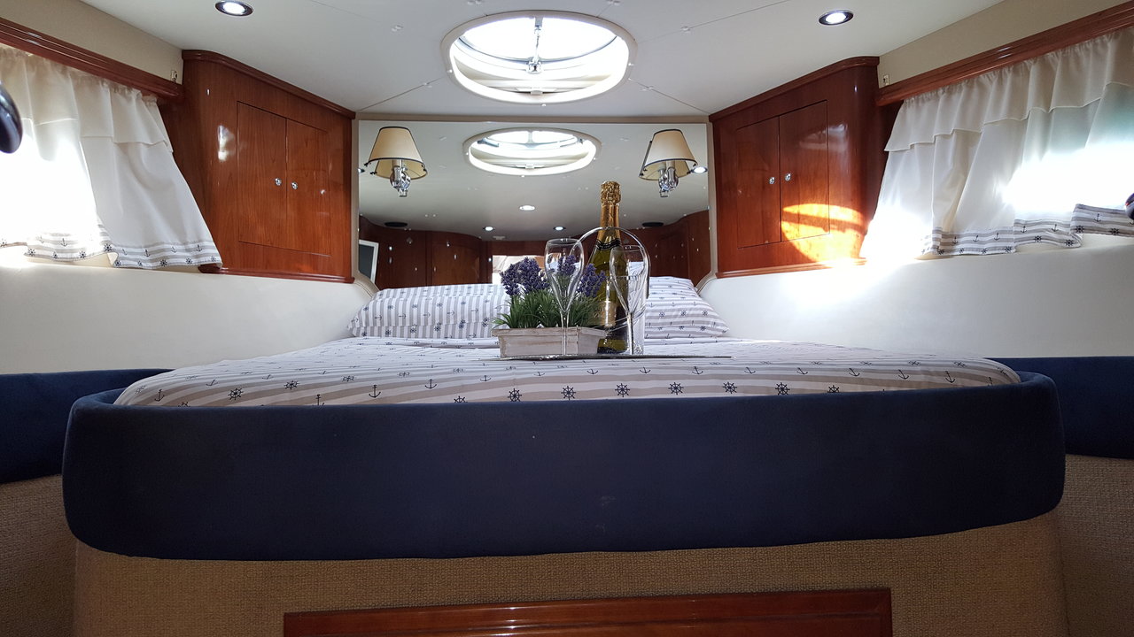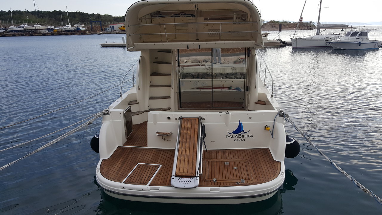 | Outside | 220 V-Landanschluss, Badeleiter, Badeplattform, Cockpitdusche, Cockpitlautsprecher, Cockpittisch, Deckpolster, elektr. Ankerwinsch, Flybridge mit Bimini und Kühlschrank, hydraul. Gangway, Sonnensegel, Teak im Cockpit, Teakdeck |