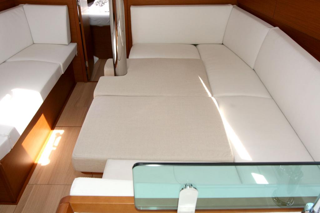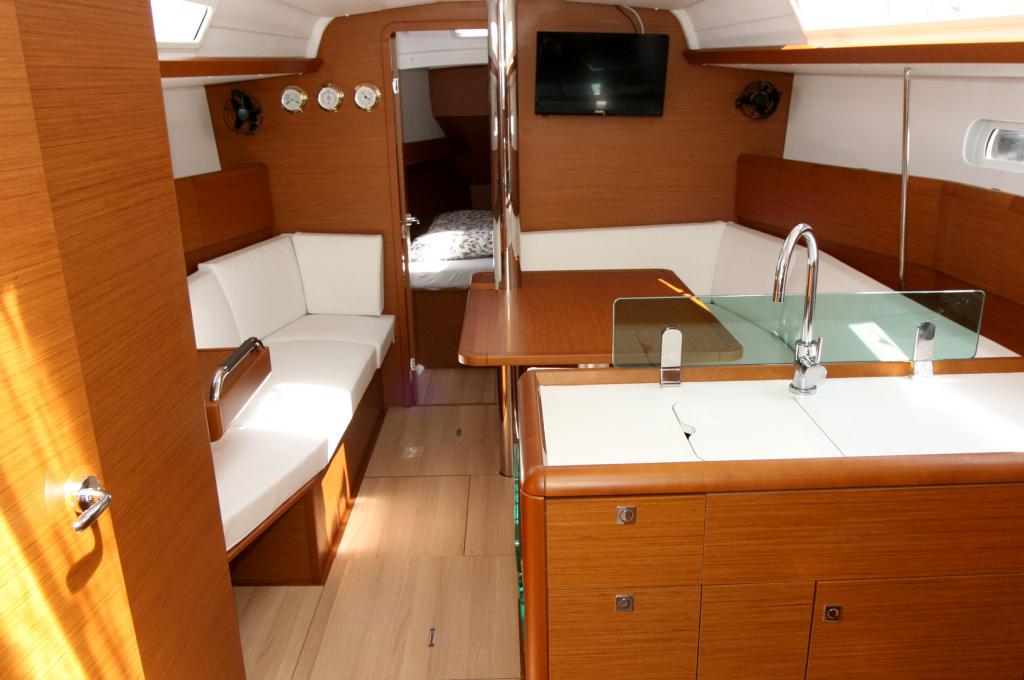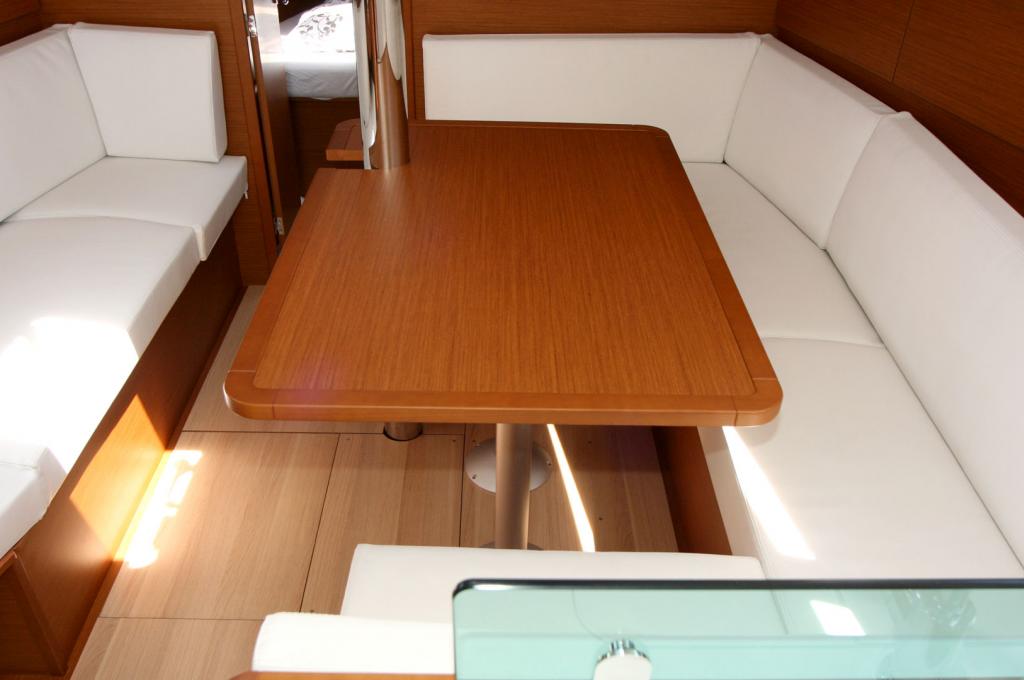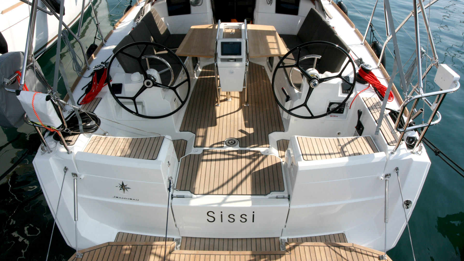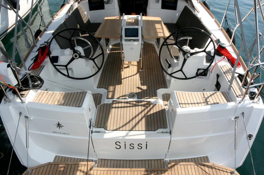 | Outside | 12 V-Anschluss, 220 V-Landanschluss, Anker mit Kette, Badeleiter, Badeplattform, Biminitop, Bootshaken, Cockpitdusche, Cockpitpolster, Cockpittisch, elektr. Ankerwinsch, Fender, Festmacherleinen, Gangway, Kugelfender, Solaranlage, Sprayhood, Teak auf Badeplattform, Teak im Cockpit, Wasserschlauch, Winschen |