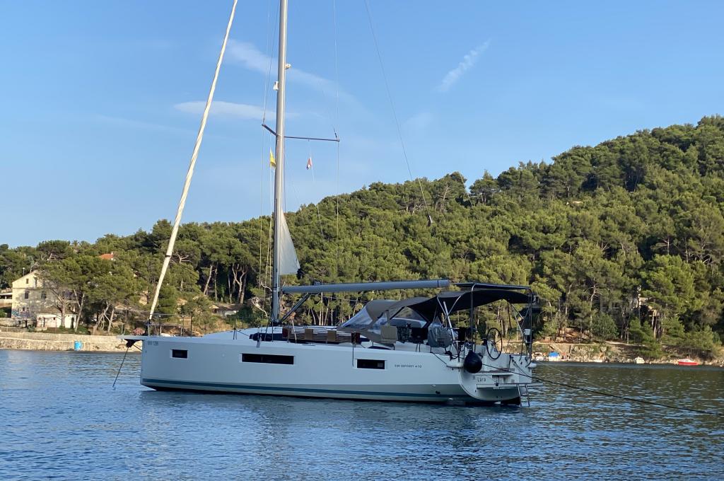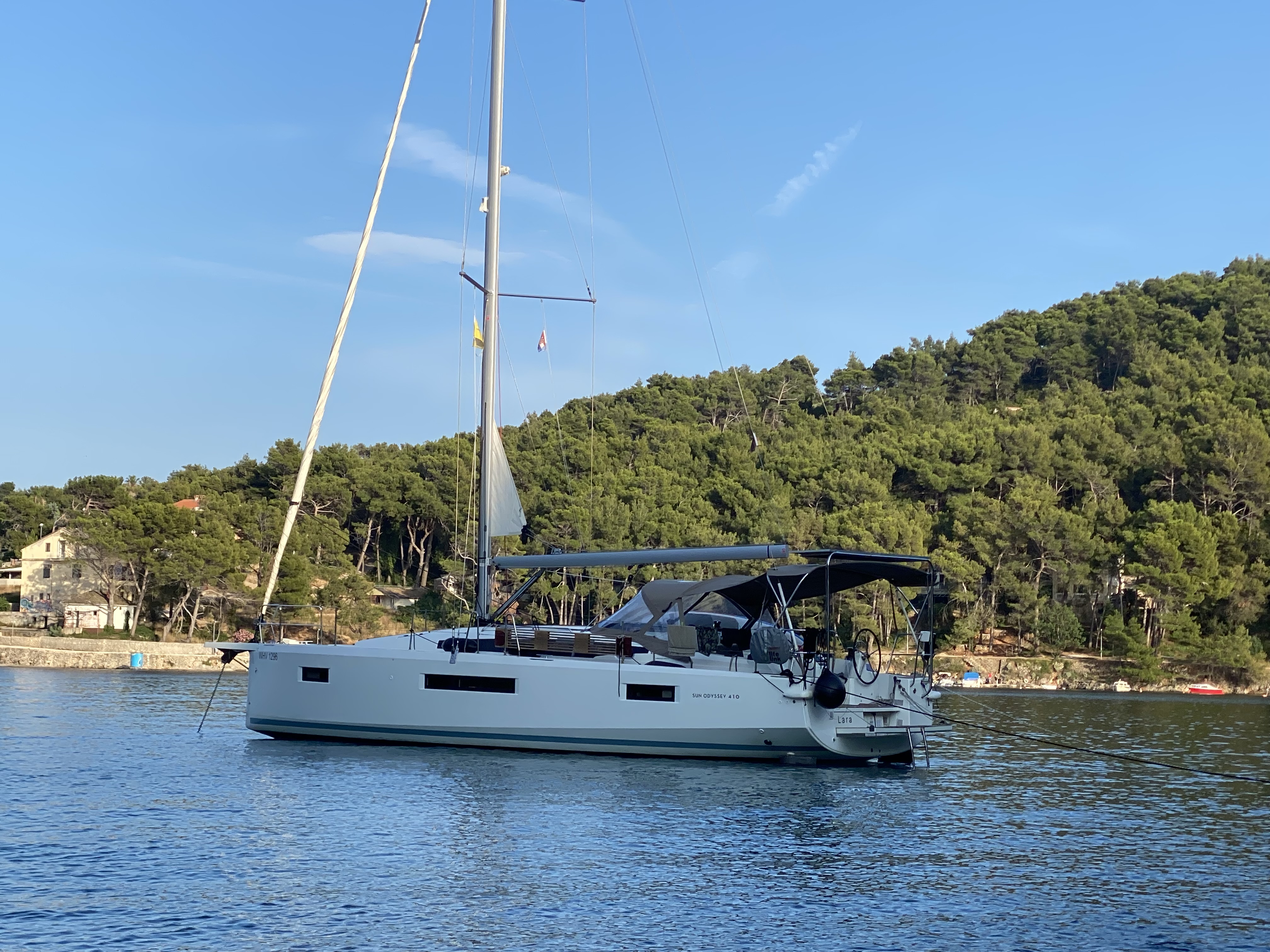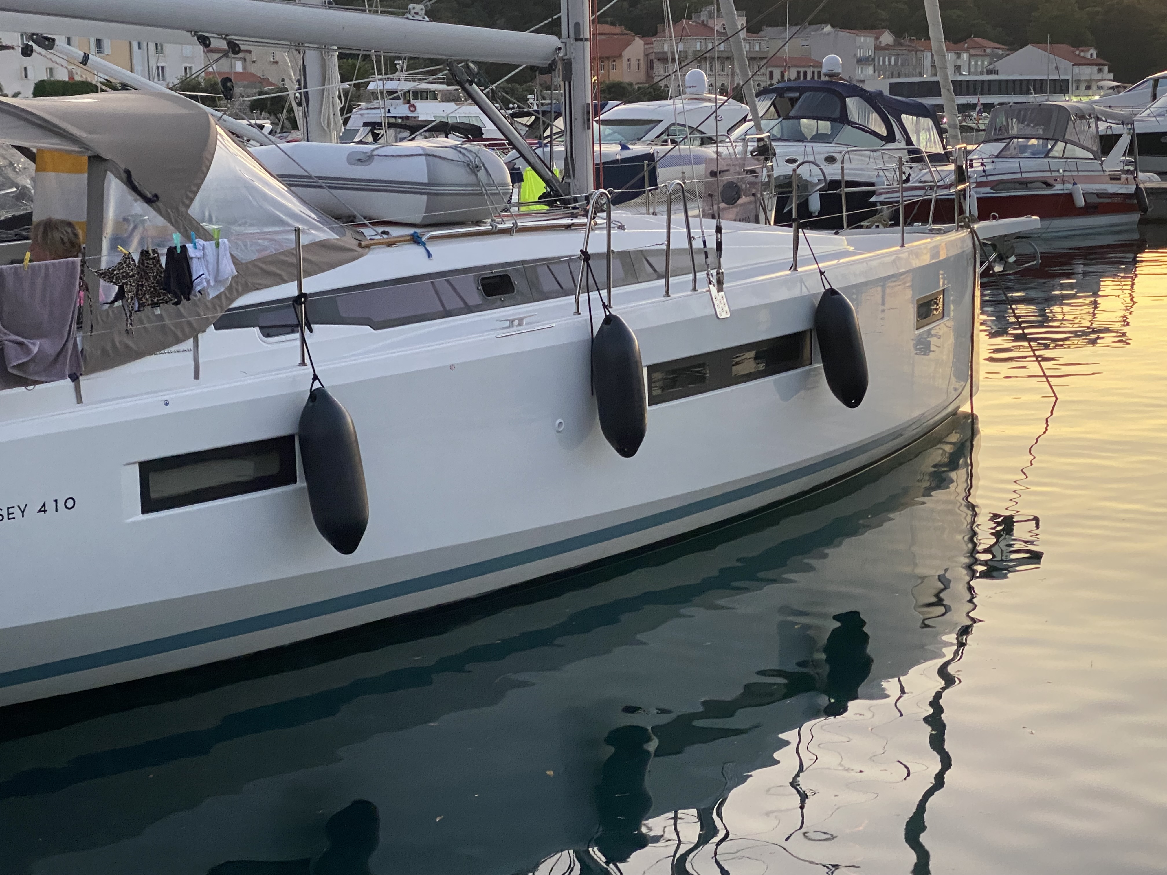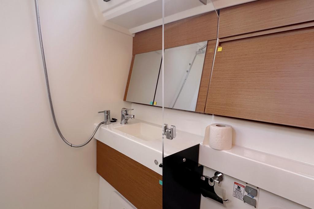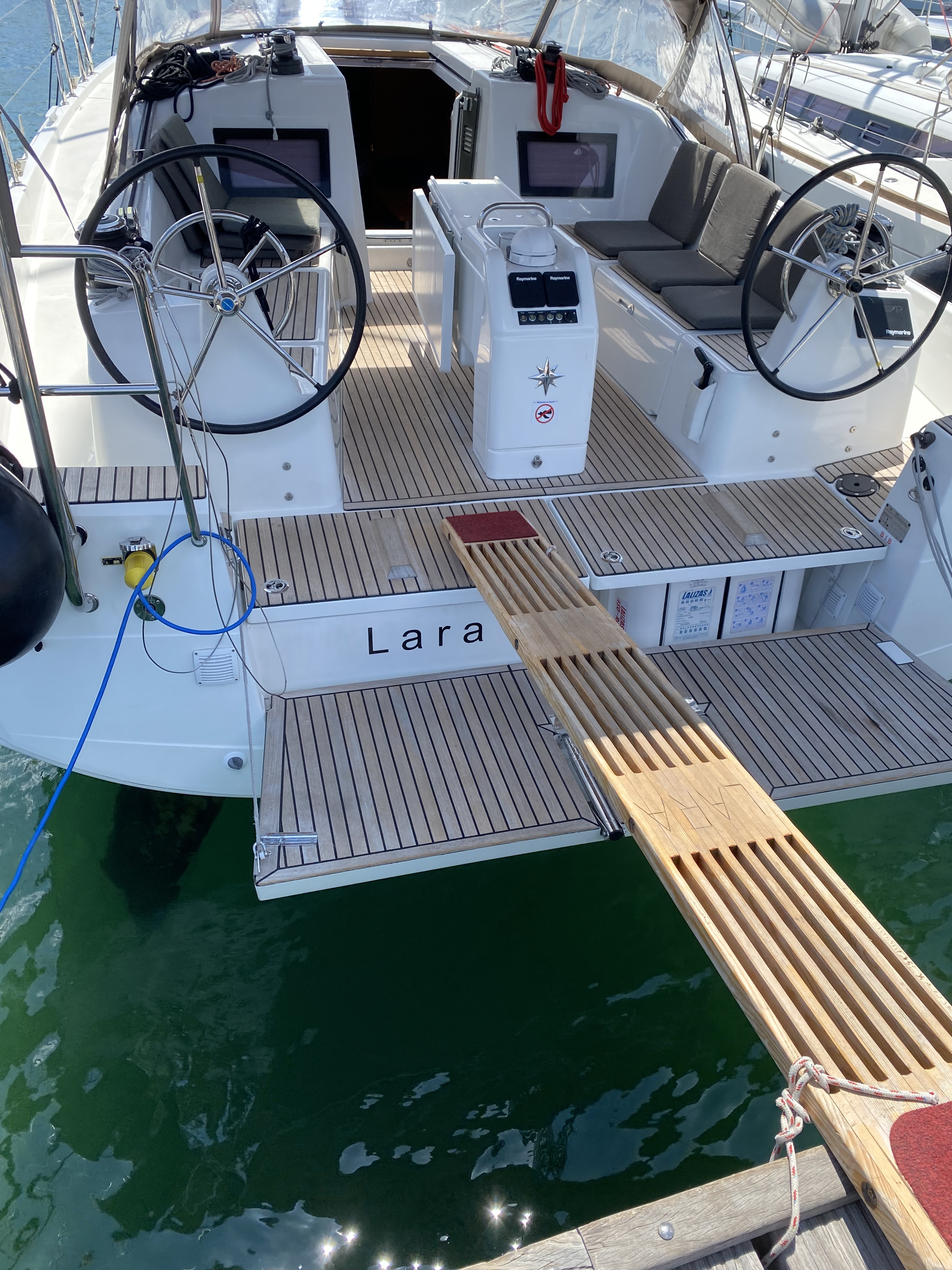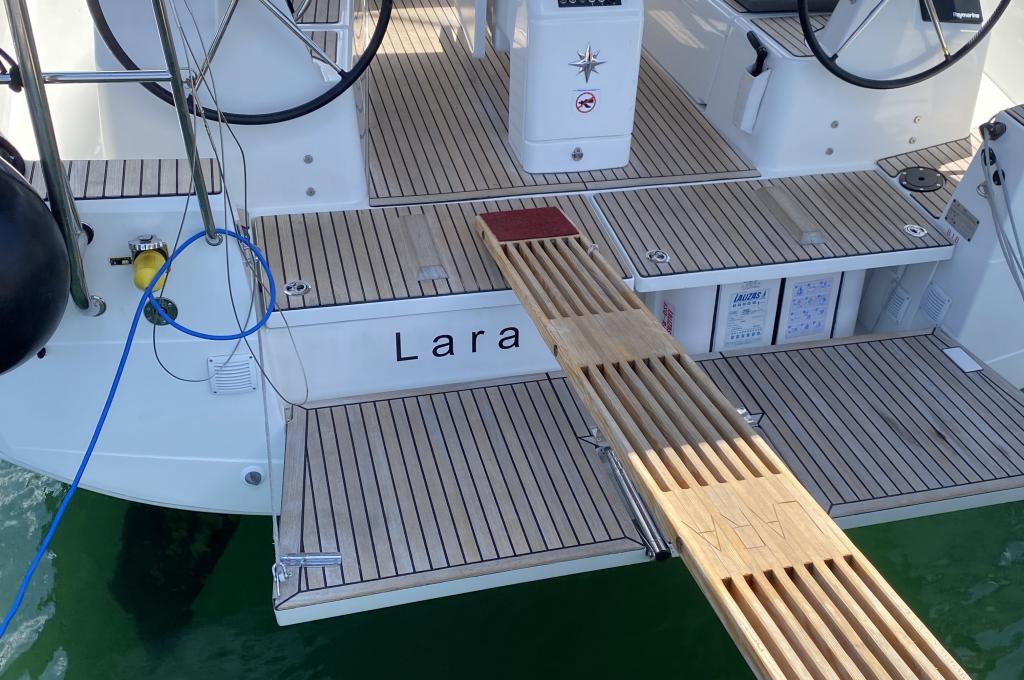 | Outside | Badeleiter, Badeplattform, Biminitop, Cockpitlautsprecher, Cockpitpolster, Cockpittisch, elektr. Ankerwinsch, Gangway, Solaranlage, Sprayhood, Teak auf Badeplattform, Teak im Cockpit |
