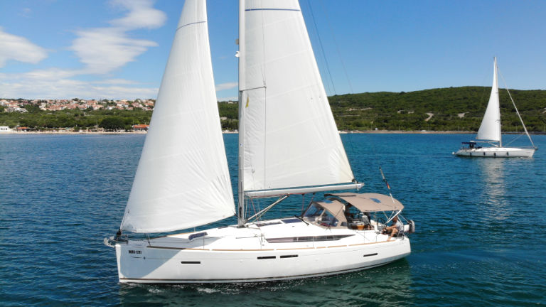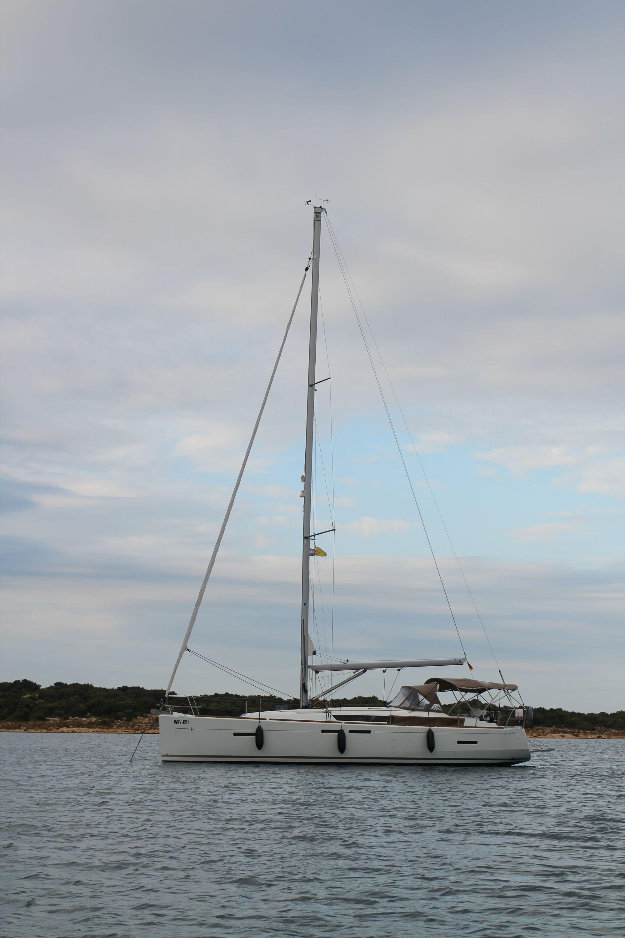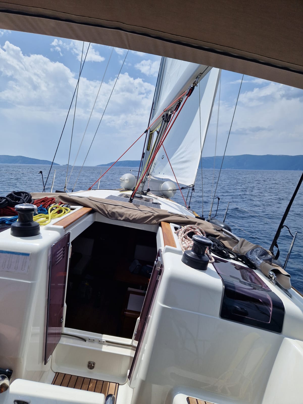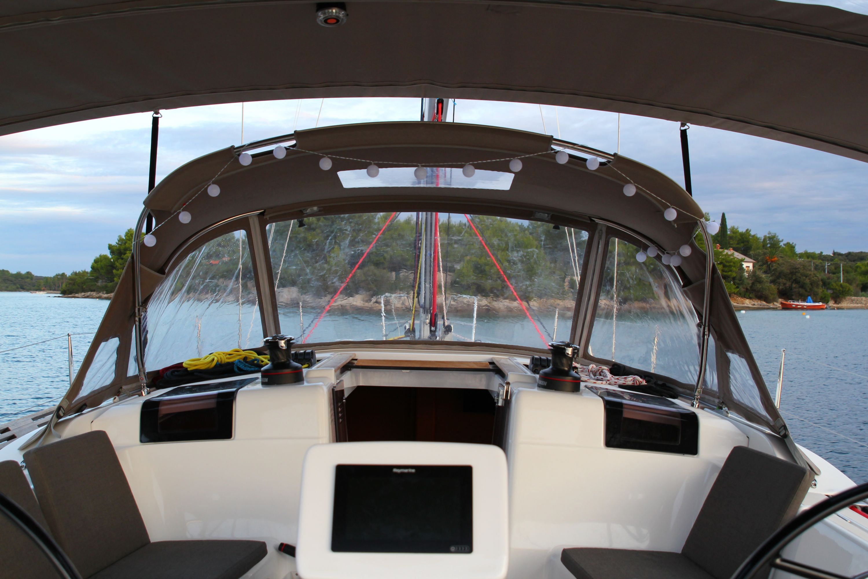 | Outside | 12 V-Anschluss, 220 V-Landanschluss, Anker mit Kette, Badeleiter, Badeplattform, Biminitop, Bootshaken, Cockpitdusche, Cockpitlautsprecher, Cockpitpolster, Cockpittisch, Cockpittisch (klappbar), elektr. Ankerwinsch, Fender, Festmacherleinen, Gangway, Kugelfender, Solaranlage, Sprayhood, Teak auf Badeplattform, Teak im Cockpit, Wasserschlauch, Winschen |