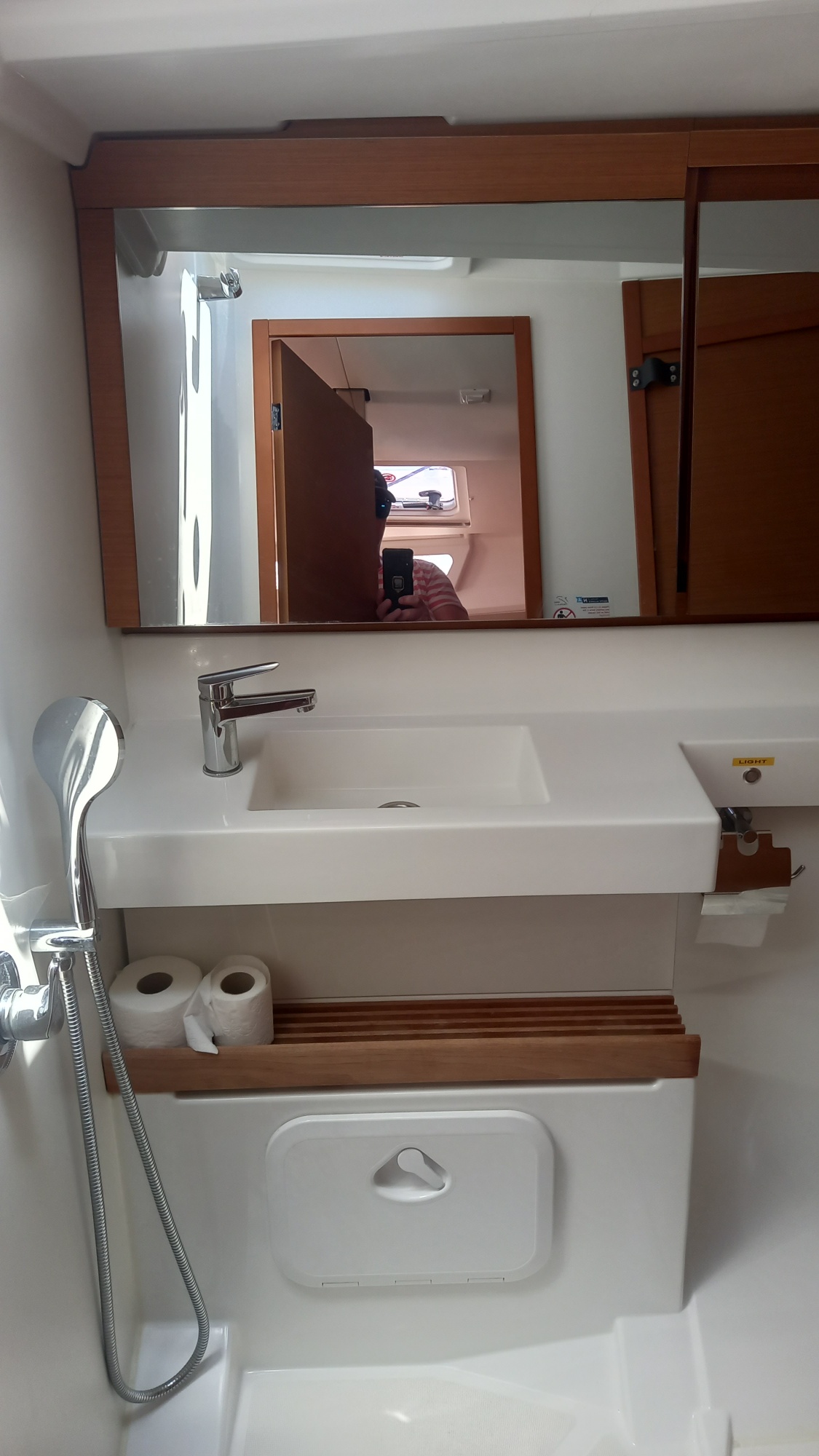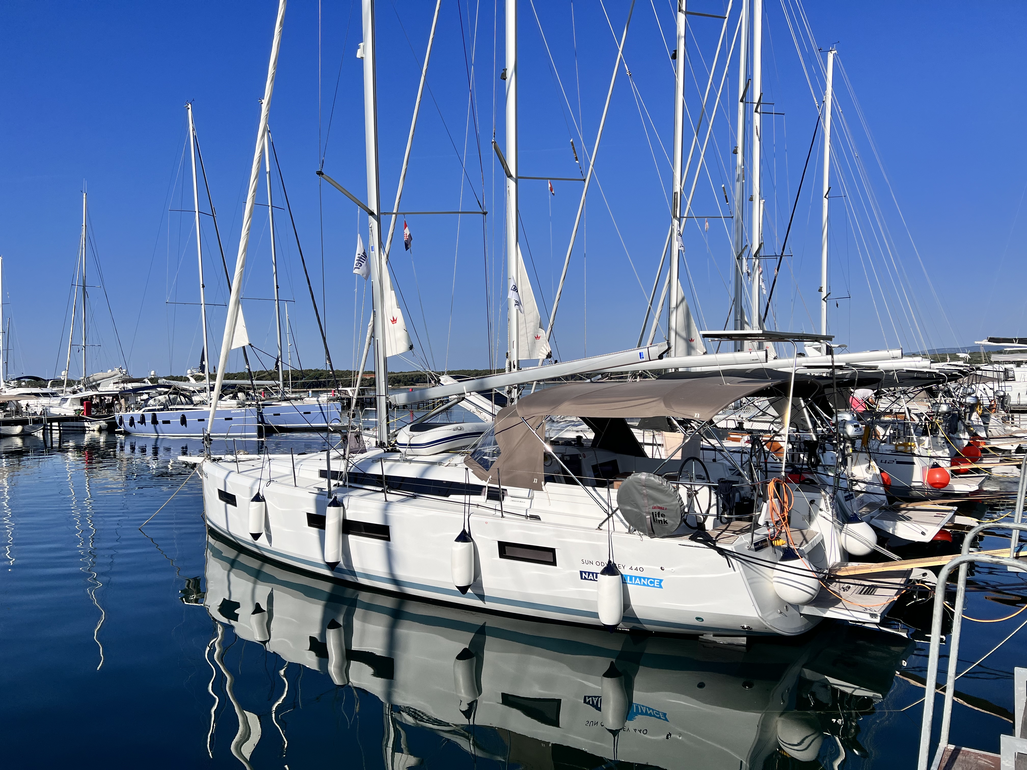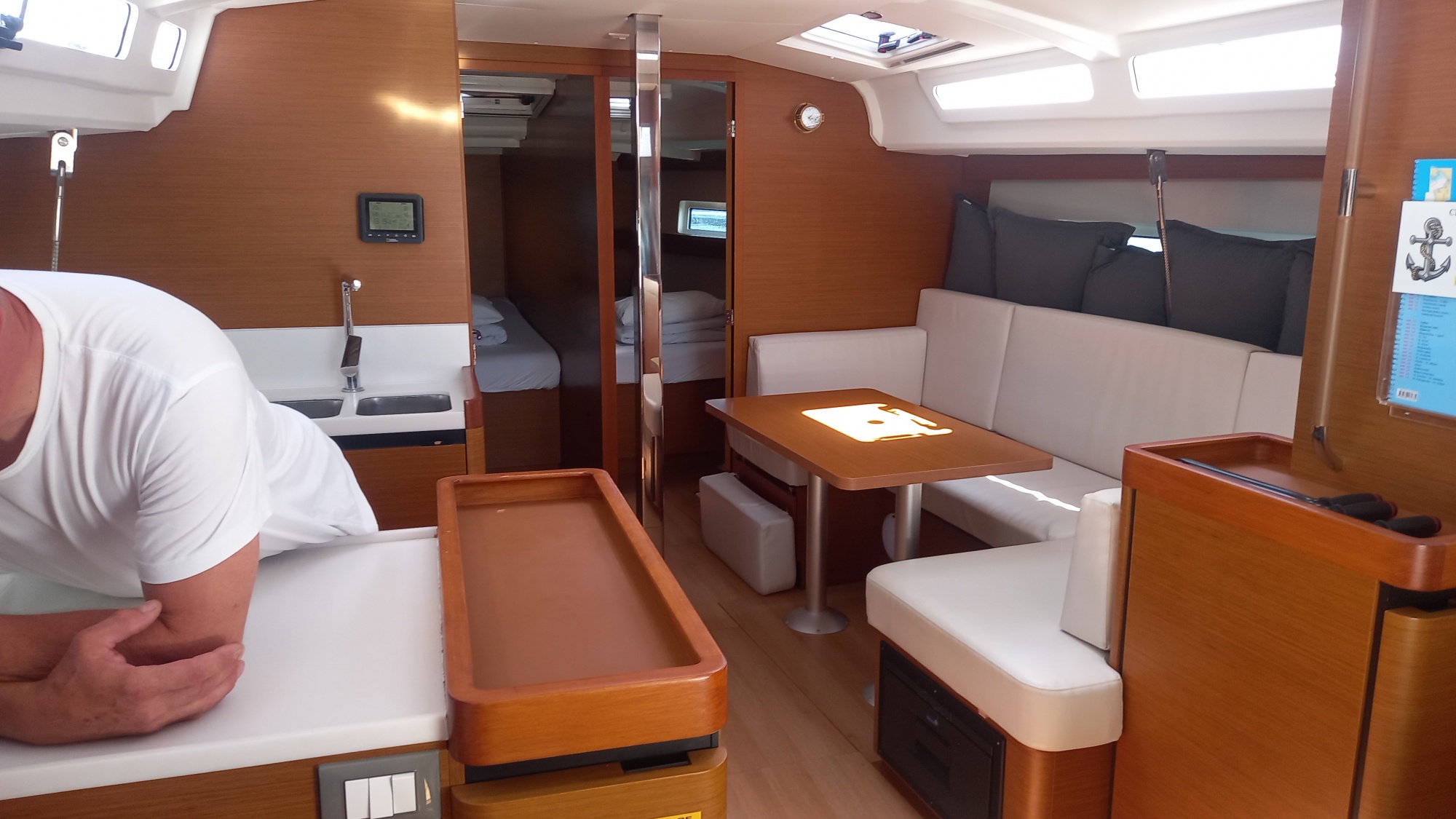 Mir ist nicht ganz klar, wer jetzt genau die Charterfirma war, Delphin oder Pitter, auf jeden Fall war es das am besten gewartete und unterhaltene Schiff, was wir jemals hatten, vielleicht abgesehen von der polnischen Firma vor zwei Jahren. Die Einweisung folgte einem klaren Schema, was auf eine intensive Schulung schließen lässt und und insbesondere für unerfahrene Skipper von Vorteil sein dürfte. Alle Fragen von meiner Seite wurden kompetent beantwortet, das Boot war pünktlich fertig, allerdings sind mittlerweile 175 € für einen ECI schon happig. Die Segeleigenschaften waren soweit in Ordnung, viel mehr als 9 Knoten darf man bei einer 44iger nicht erwarten. Was uns auffiel, waren die Details: Man kann vom Steuerstand um das Cockpit herum nach vorne gehen ohne zu klettern, die Stehhöhe unter dem Bimini kam uns SEHR entgegen, Stauflächen waren reichlich vorhanden, allerdings mussten wir uns die Küchenschränke etwas gewöhnen, man stapelt von oben. Die Kühlkapazitäten waren sehr gut, ebenfalls das Batteriemanagement dank der fest verbauten Solarpaneele, wir mussten nie Landstrom ziehen, obwohl wir fast nur unter Segeln gefahren sind. Die Rückgabe war ebenfalls sehr professionell, der von uns benannte Fehler wurde sofort behoben und nicht wie üblich aufs Zettelchen im Blöckchen geschrieben. Und wunschgemäß erhielten wir zum Schluss unsere Route als ausgedruckten Track - Super!
