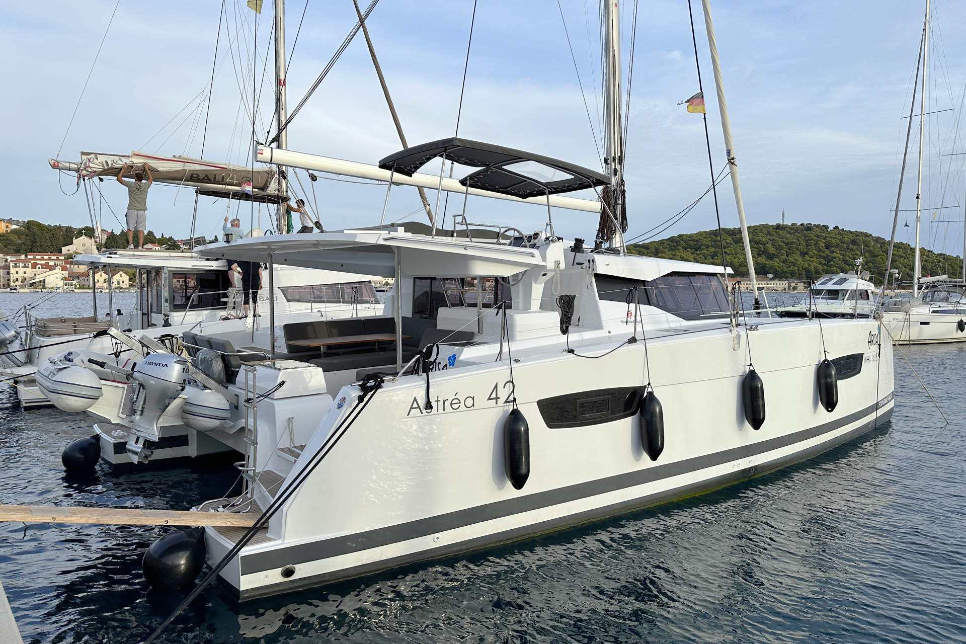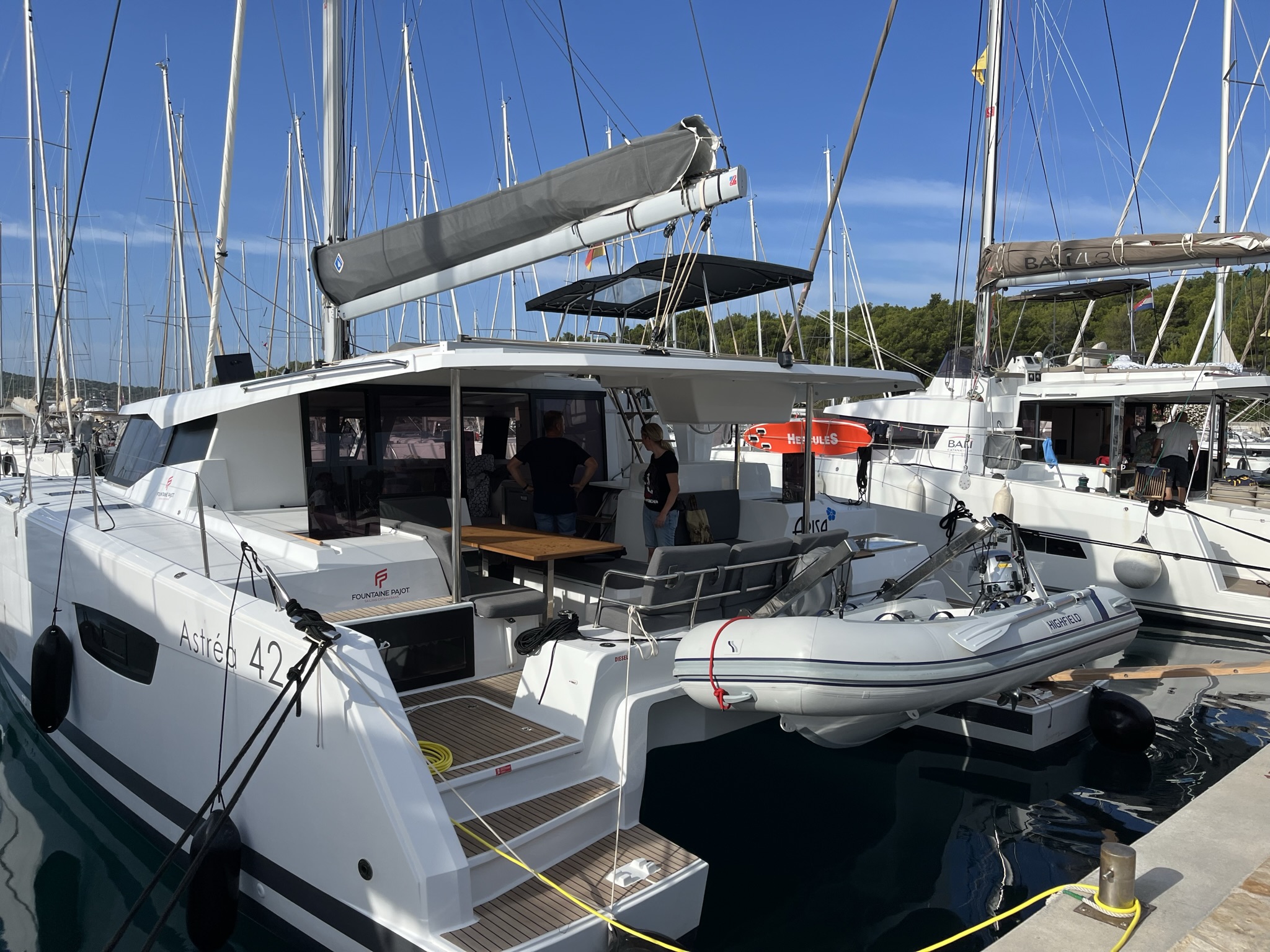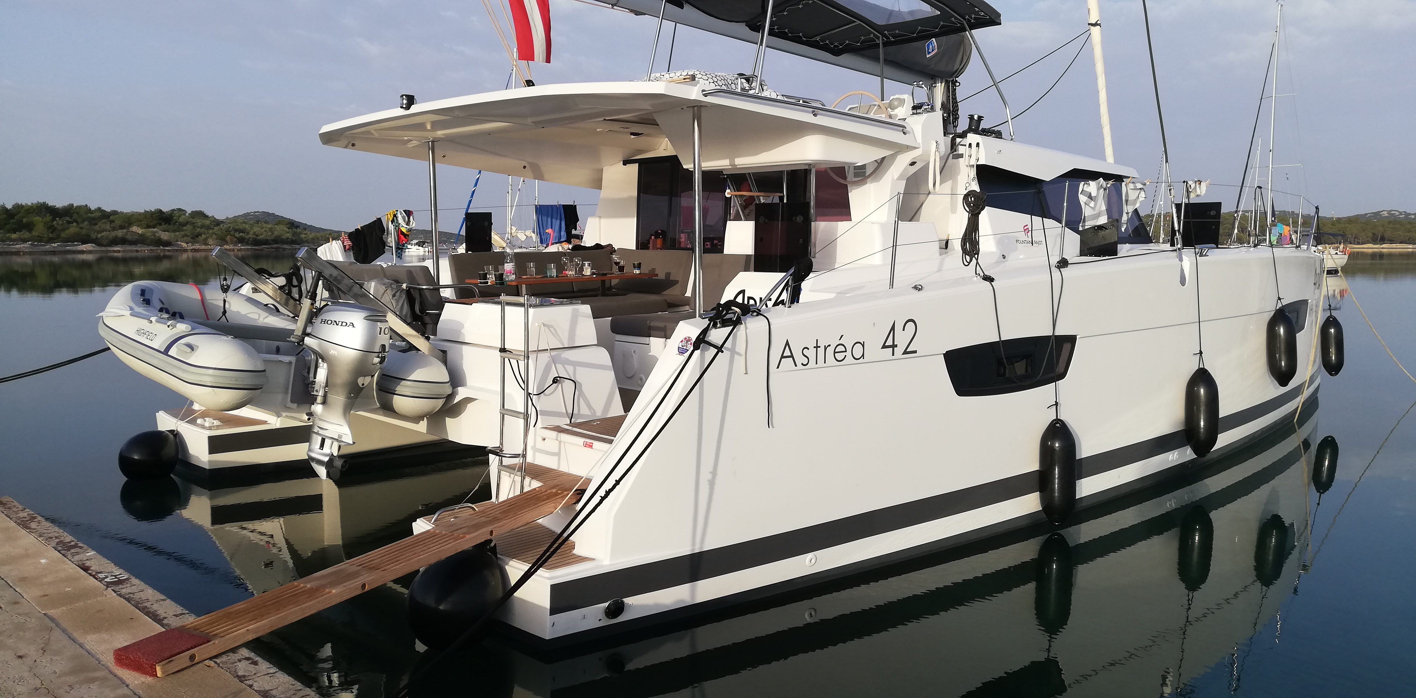 | Outside | Anker mit Kette, Ankerkettenzähler, Badeleiter, Biminitop, Cockpitdusche warm/kalt, Cockpitlautsprecher, Cockpitpolster, Cockpittisch, Davits, Deckpolster, elektr. Ankerwinsch, elektr. Winsch, Gangway, Grill, Lifeline System, Solaranlage, Teak auf Badeplattform, Teak im Cockpit |